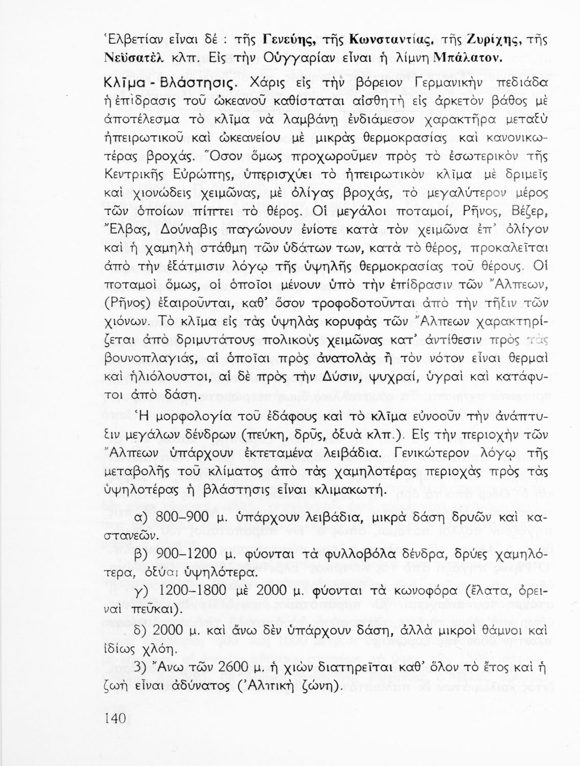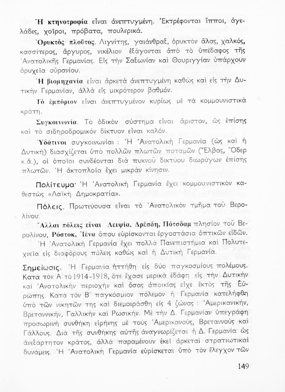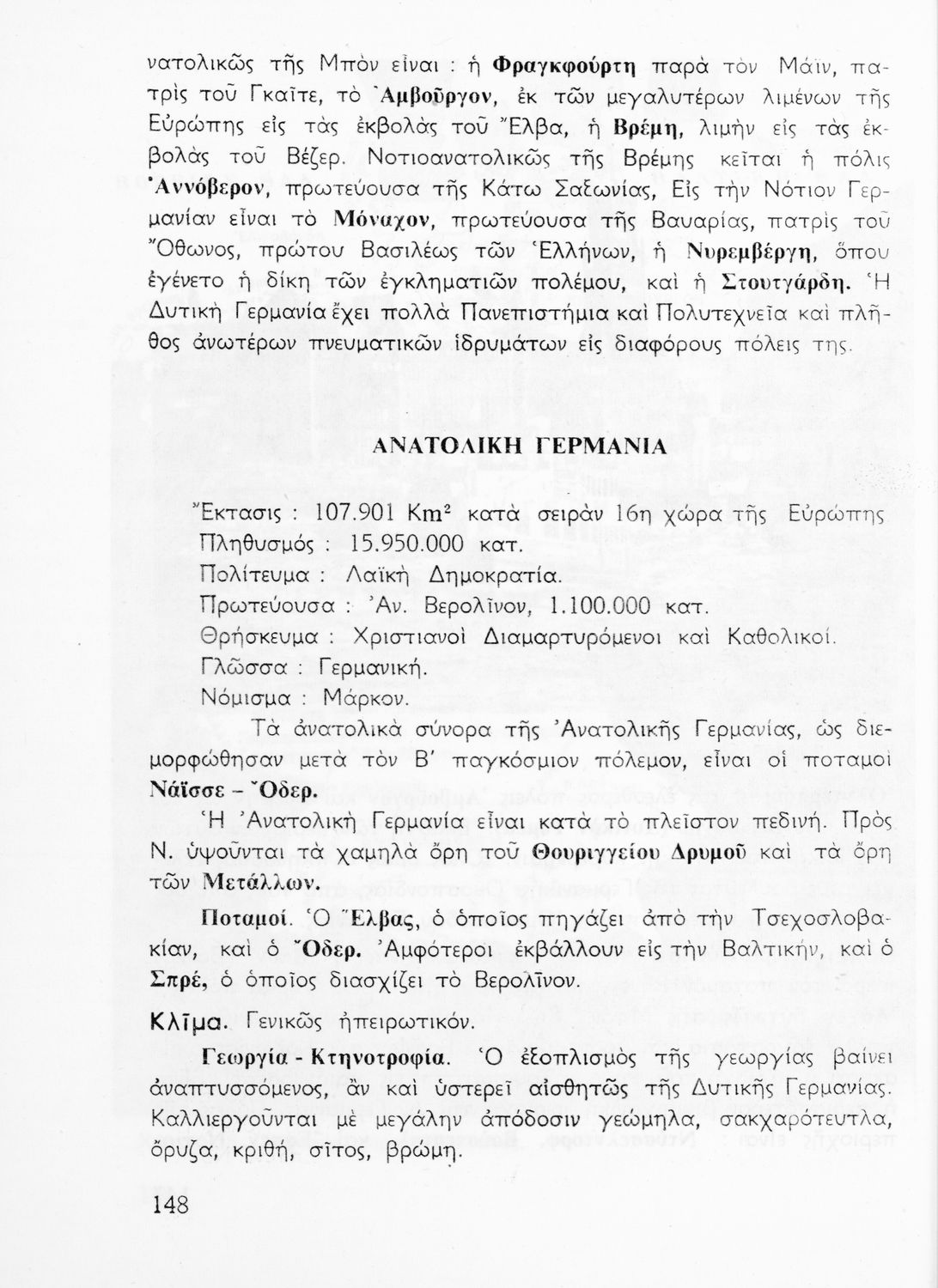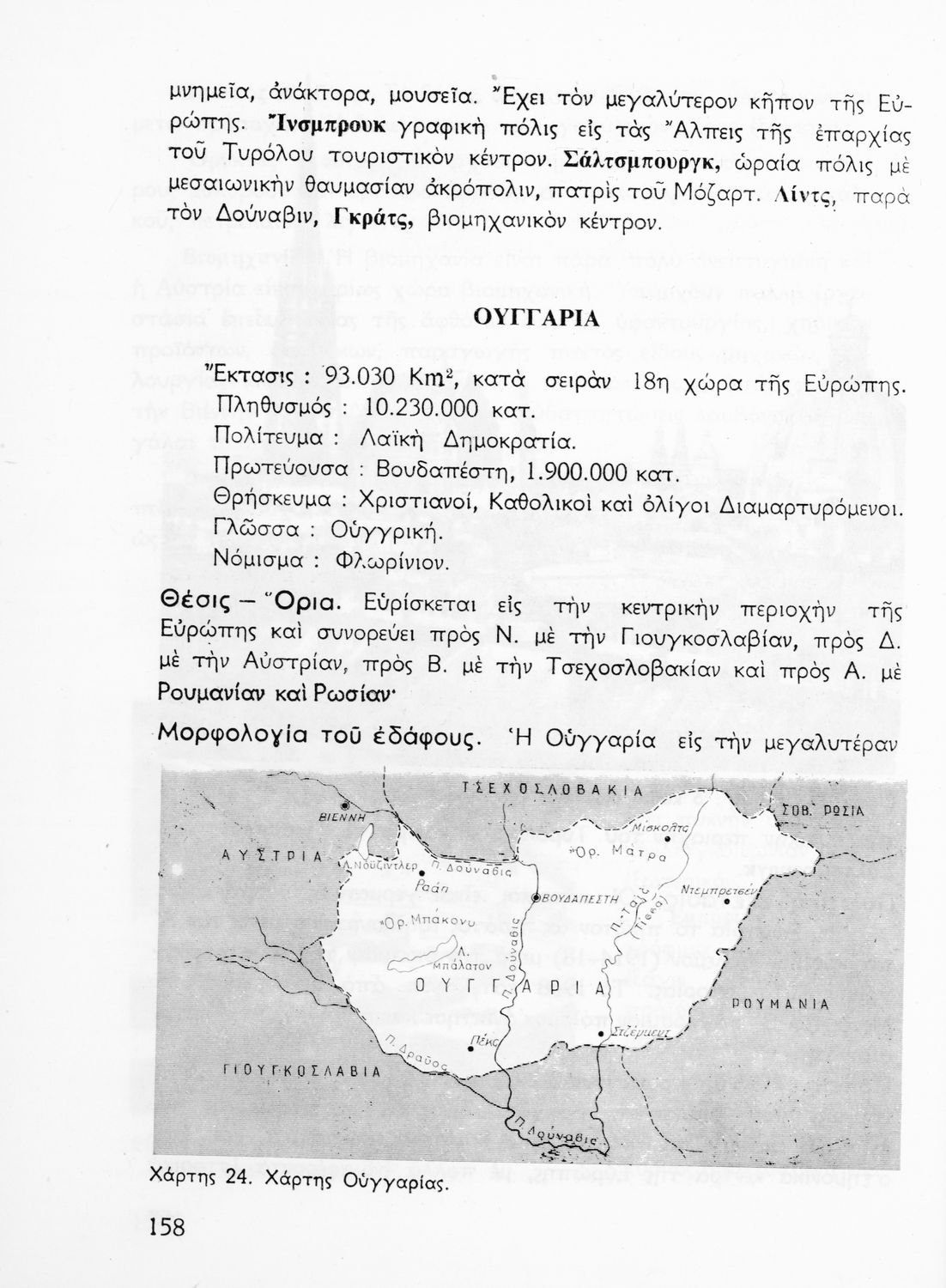 Βαθμίδα εκπαίδευσης: Δευτεροβάθμια Τάξη: Β' Γυμνασίου Μάθημα: Γεωγραφία Γλώσσα: Καθαρεύουσα Παρουσίαση περιεχομένου: Σχολικό εγχειρίδιο Γεωγραφίας Β' Γυμνασίου που περιλαμβάνει εισαγωγή στη φυσική και μαθηματική γεωγραφία και παρουσιάζει τις χώρες της Ευρώπης από γεωμορφολογική, πολιτική, πολιτισμική και οικονομική άποψη. Περιέχει και αναφορά στις οικονομικές σχέσεις της Ελλάδας με τα ευρωπαϊκά κράτη. Φέρει το σύμβολο της δικτατορίας. |