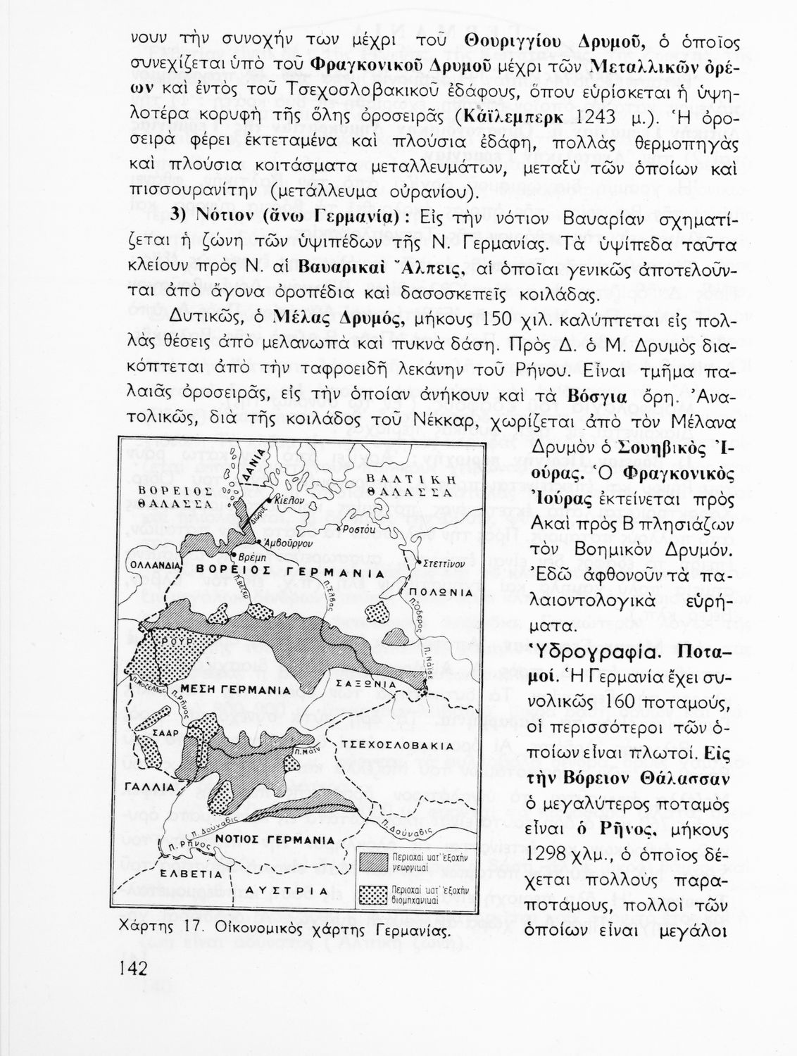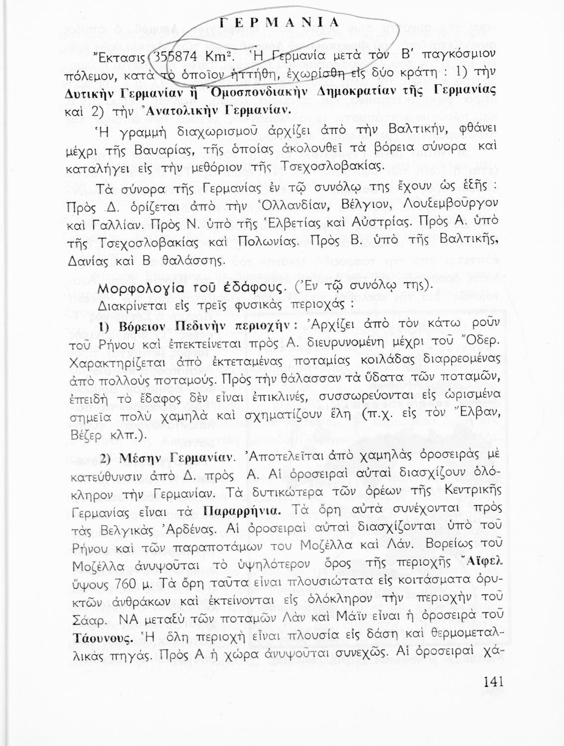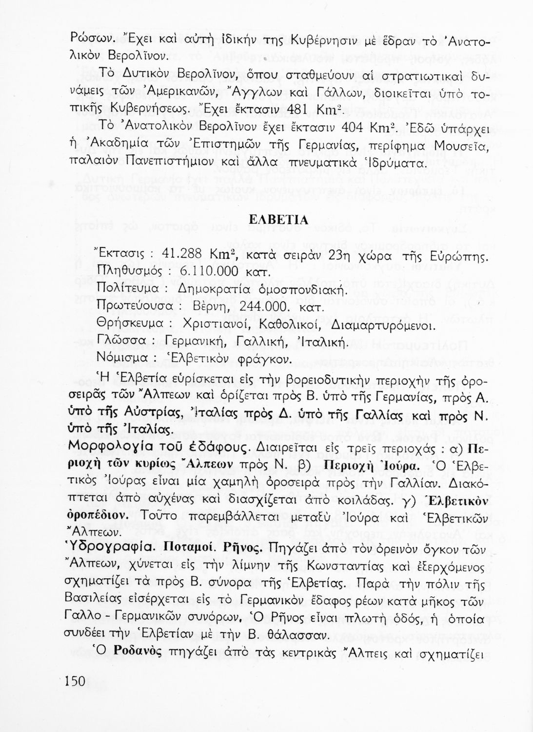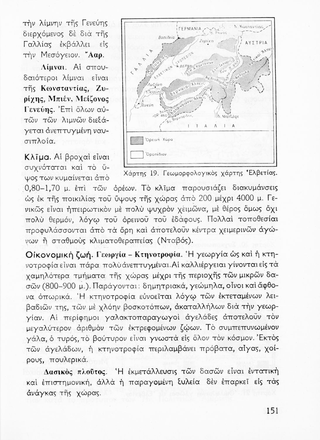 Βαθμίδα εκπαίδευσης: Δευτεροβάθμια Τάξη: Β' Γυμνασίου Μάθημα: Γεωγραφία Γλώσσα: Καθαρεύουσα Παρουσίαση περιεχομένου: Σχολικό εγχειρίδιο Γεωγραφίας Β' Γυμνασίου που περιλαμβάνει εισαγωγή στη φυσική και μαθηματική γεωγραφία και παρουσιάζει τις χώρες της Ευρώπης από γεωμορφολογική, πολιτική, πολιτισμική και οικονομική άποψη. Περιέχει και αναφορά στις οικονομικές σχέσεις της Ελλάδας με τα ευρωπαϊκά κράτη. Φέρει το σύμβολο της δικτατορίας. |