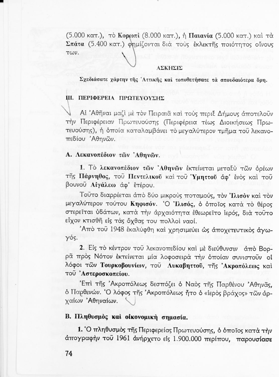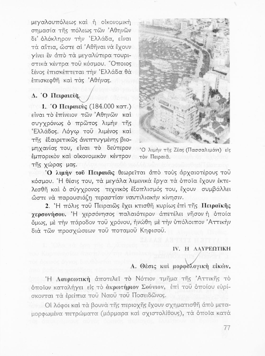 Σχολικό εγχειρίδιο Γεωγραφίας Α΄ Γυμνασίου που εξετάζει την Ελλάδα από γεωφυσική, πολιτική, οικονομική και πολιτισμική άποψη. Φέρει το σύμβολο της δικτατορίας.