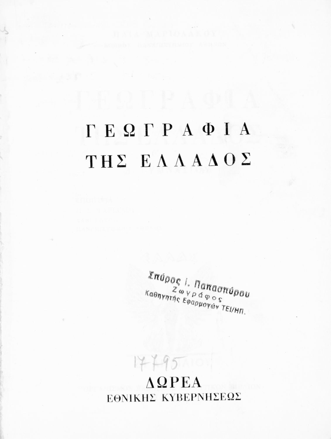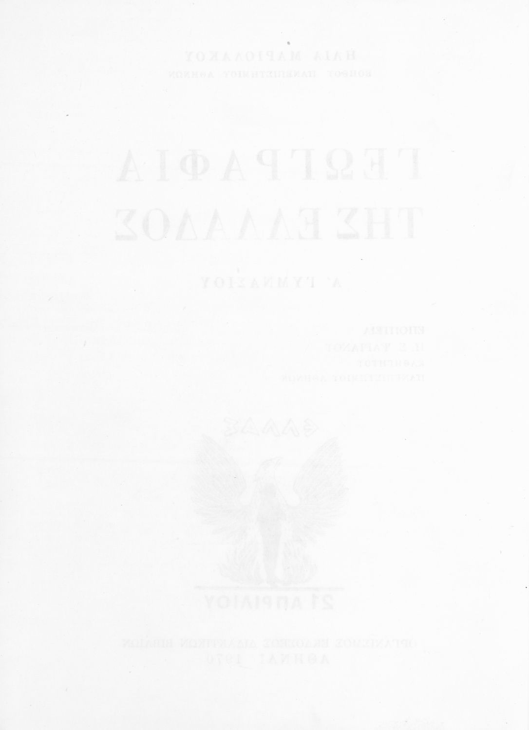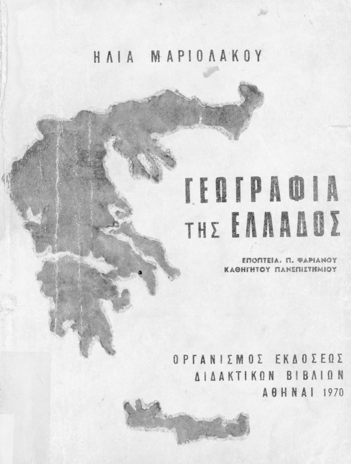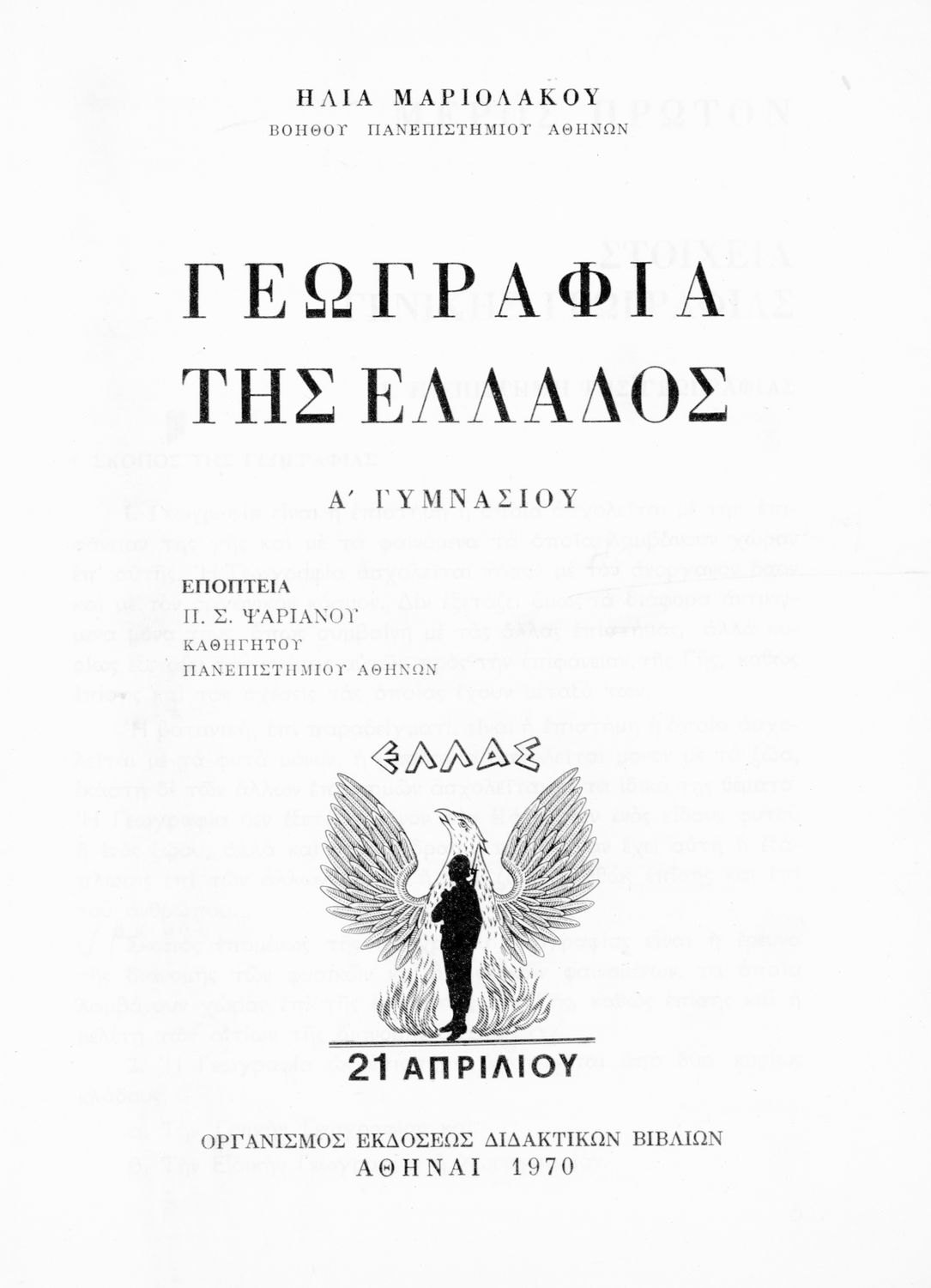 Σχολικό εγχειρίδιο Γεωγραφίας Α΄ Γυμνασίου που εξετάζει την Ελλάδα από γεωφυσική, πολιτική, οικονομική και πολιτισμική άποψη. Φέρει το σύμβολο της δικτατορίας.