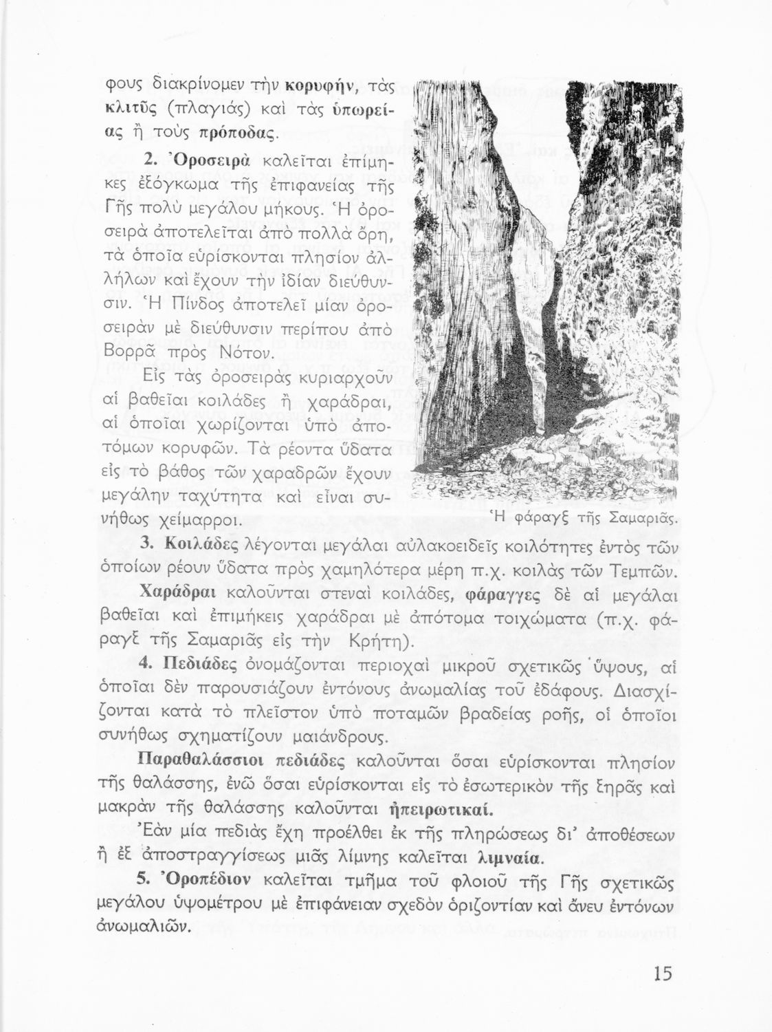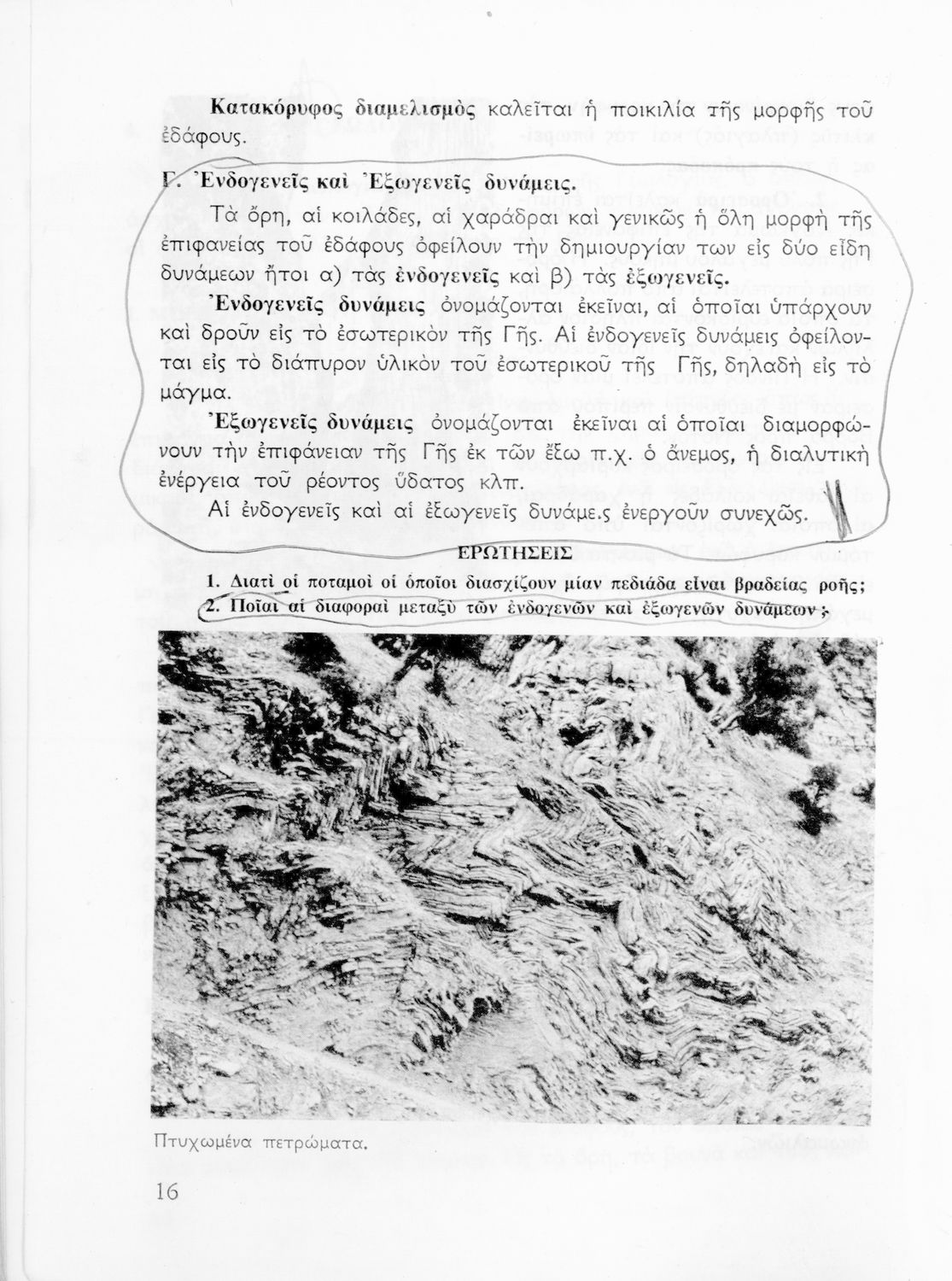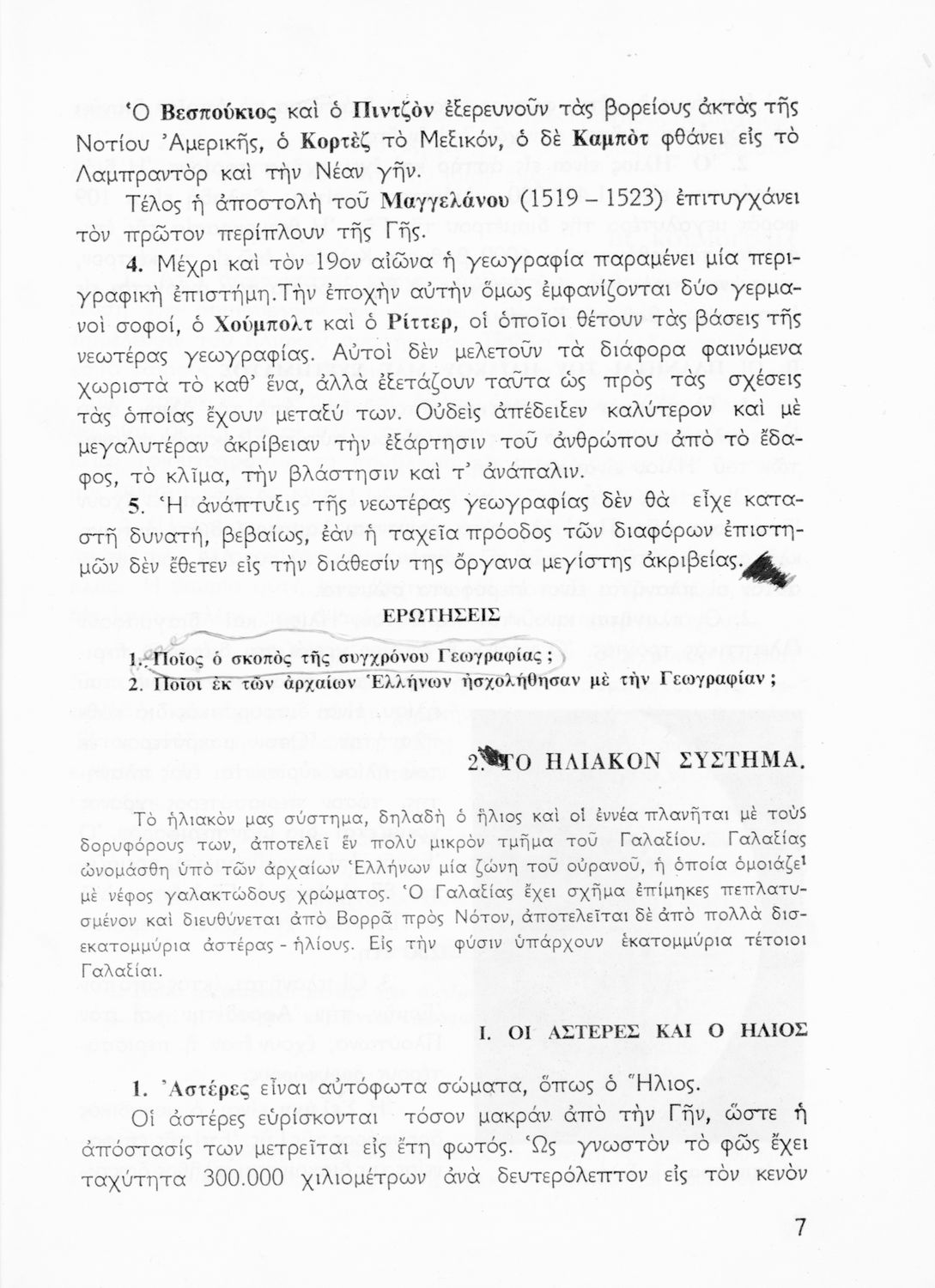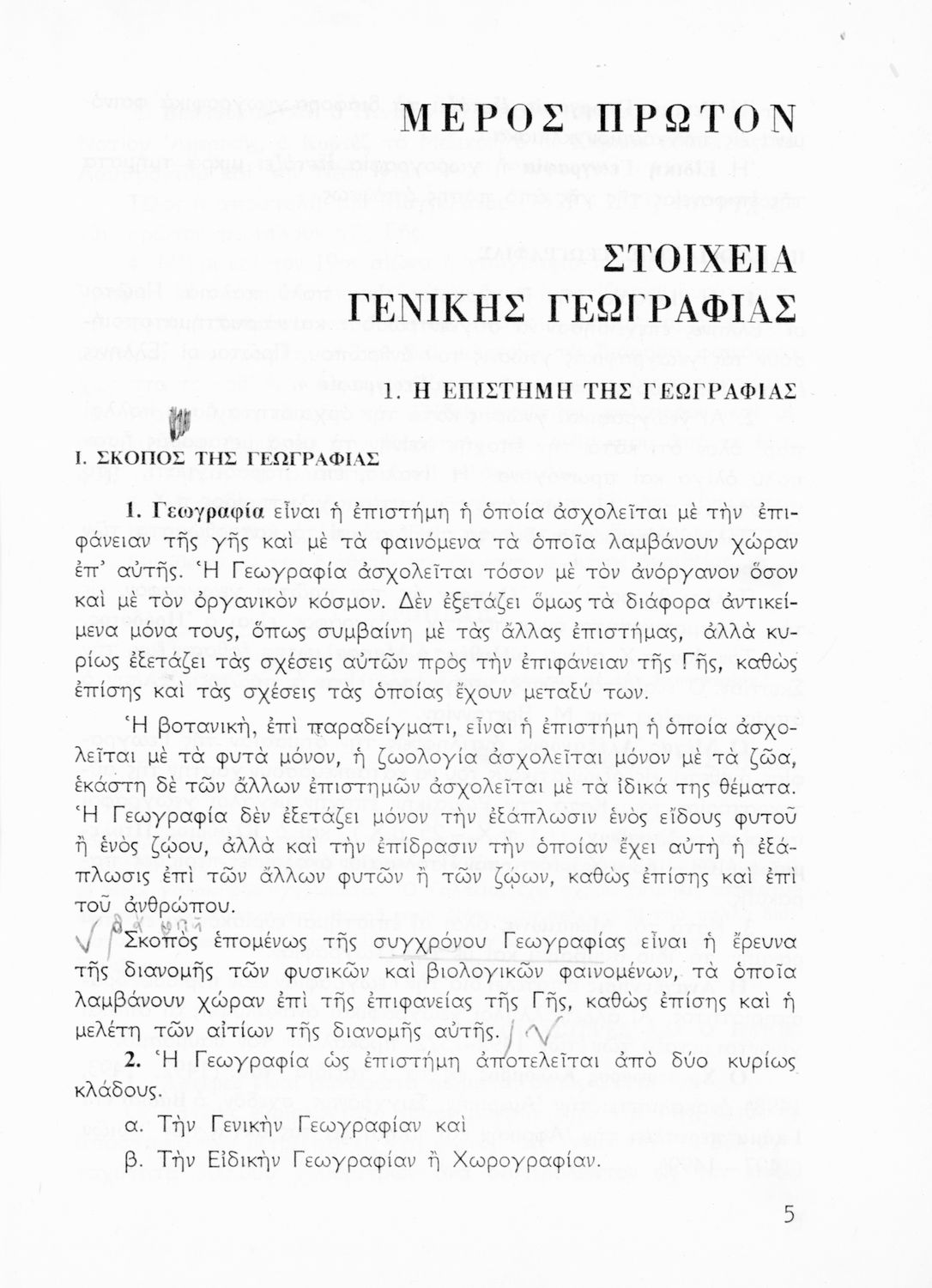 Σχολικό εγχειρίδιο Γεωγραφίας Α΄ Γυμνασίου που εξετάζει την Ελλάδα από γεωφυσική, πολιτική, οικονομική και πολιτισμική άποψη. Φέρει το σύμβολο της δικτατορίας.