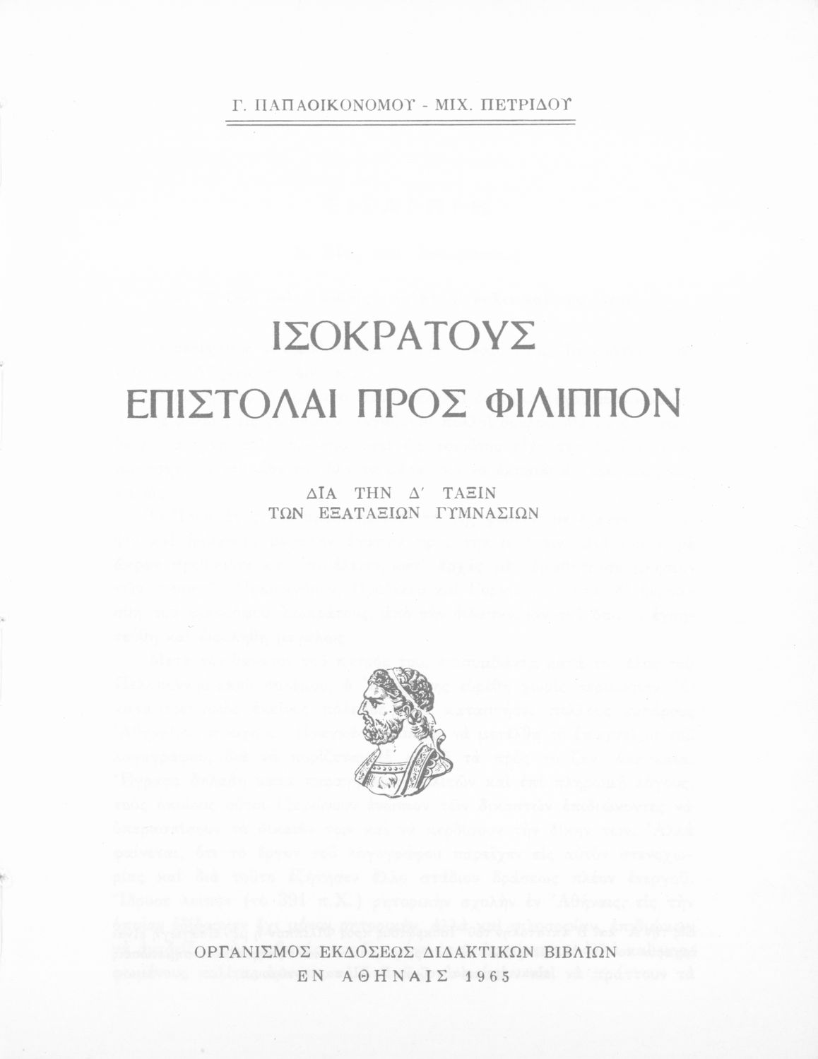 Σχολικό εγχειρίδιο Αρχαίων Ελληνικών Δ΄ Γυμνασίου που περιέχει τους Ολυνθιακούς Α΄ και Β΄ και τους Φιλιππικούς Α΄ και Β΄ του Δημοσθένη, το Λόγο κατά Λεωκράτους του Λυκούργου και τις Επιστολές προς Φίλιππο του Ισοκράτη, και ερμηνευτικά και ετυμολογικά σχόλια.