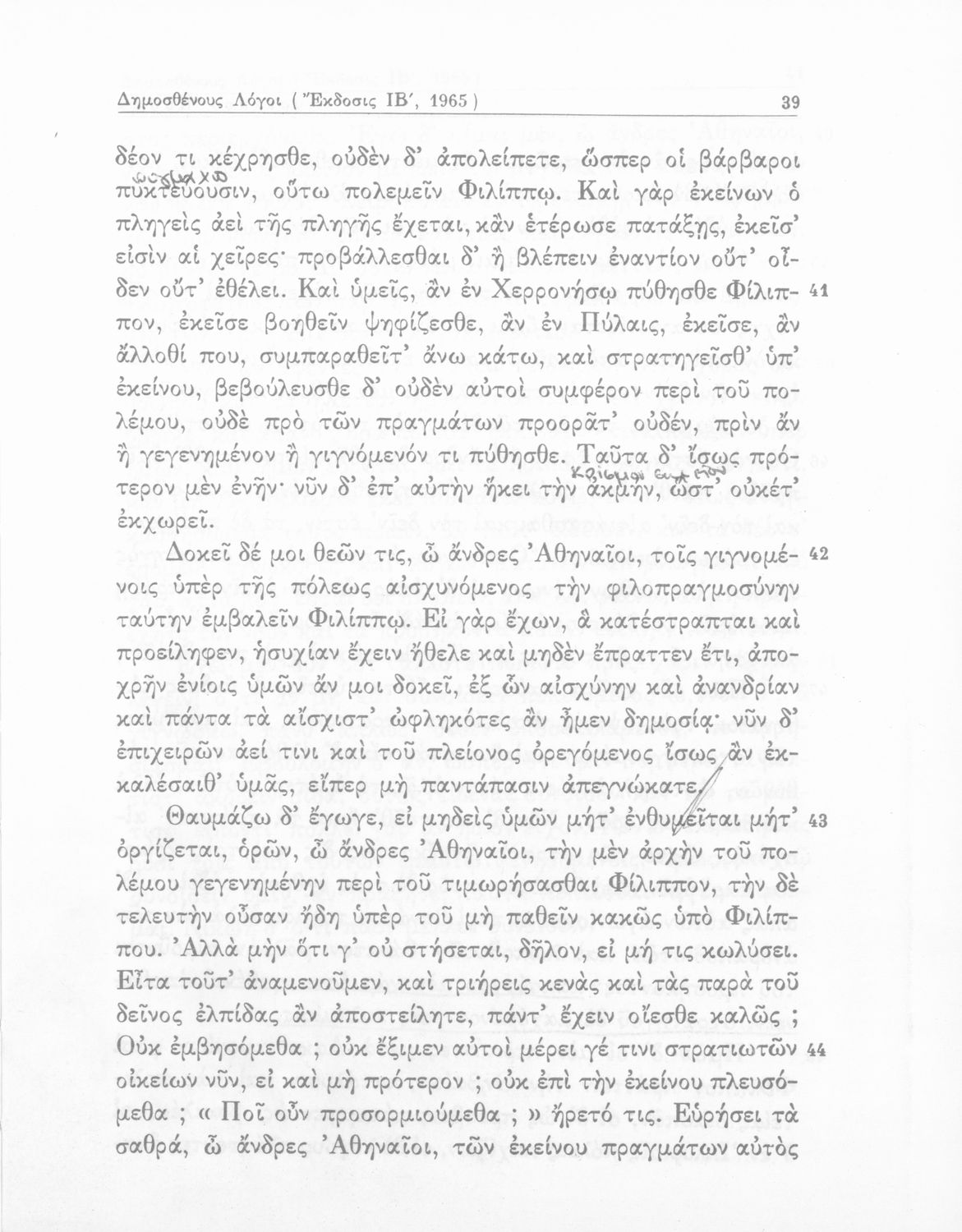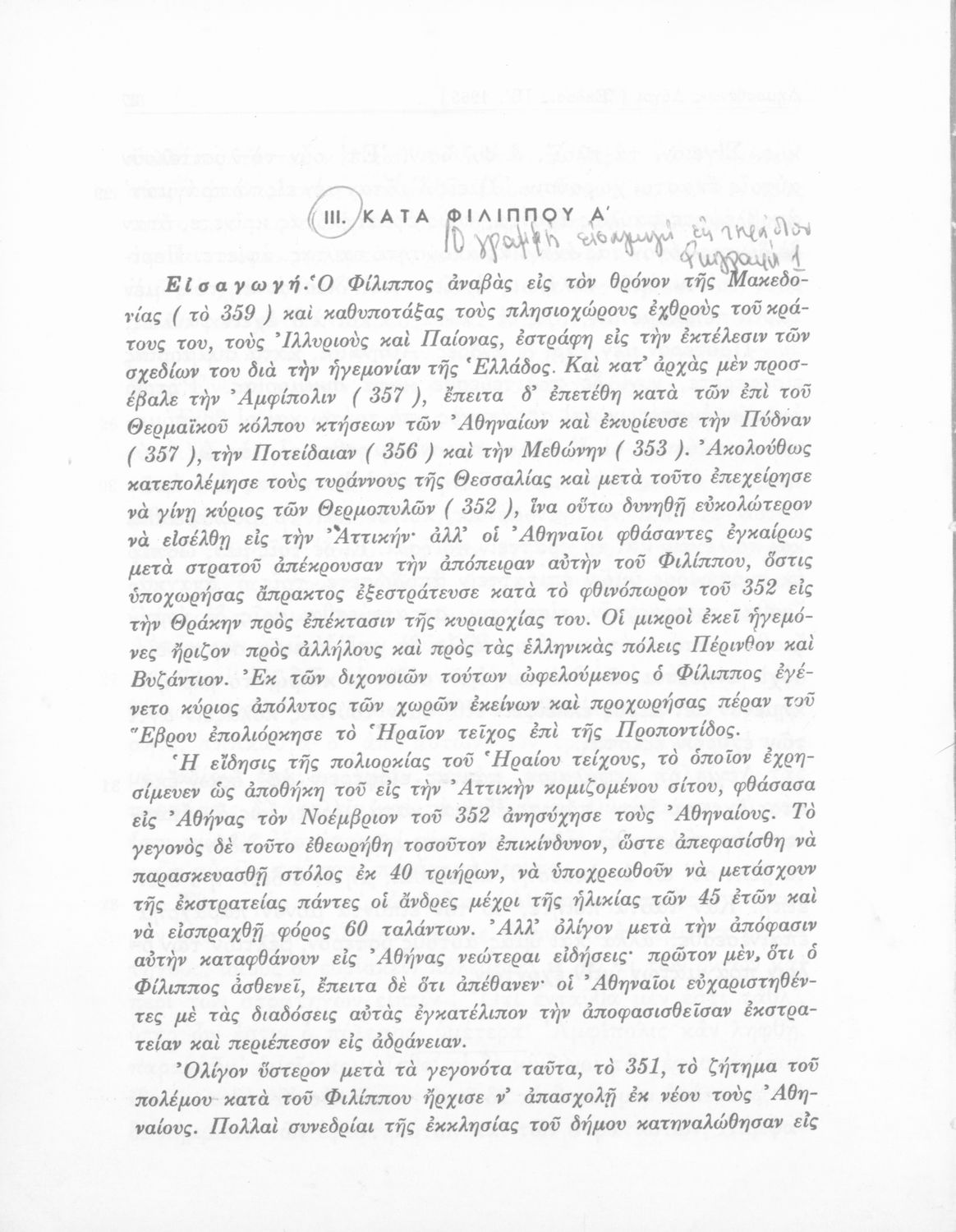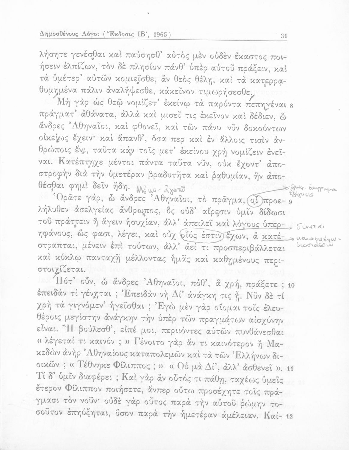 Σχολικό εγχειρίδιο Αρχαίων Ελληνικών Δ΄ Γυμνασίου που περιέχει τους Ολυνθιακούς Α΄ και Β΄ και τους Φιλιππικούς Α΄ και Β΄ του Δημοσθένη, το Λόγο κατά Λεωκράτους του Λυκούργου και τις Επιστολές προς Φίλιππο του Ισοκράτη, και ερμηνευτικά και ετυμολογικά σχόλια.