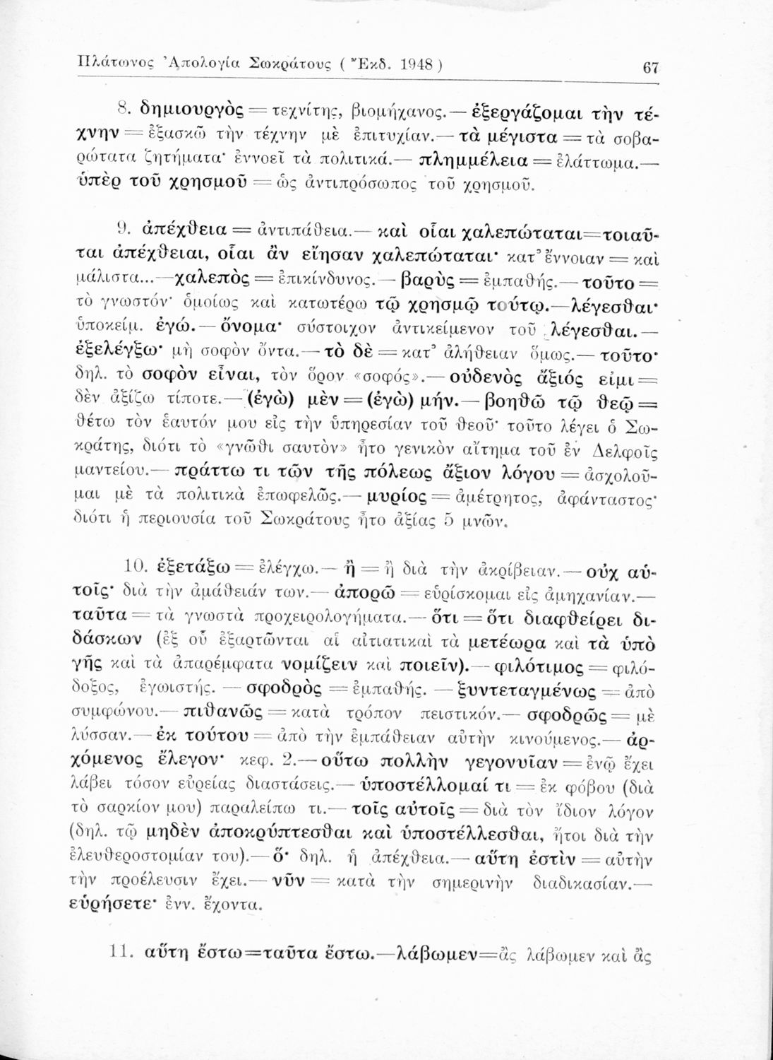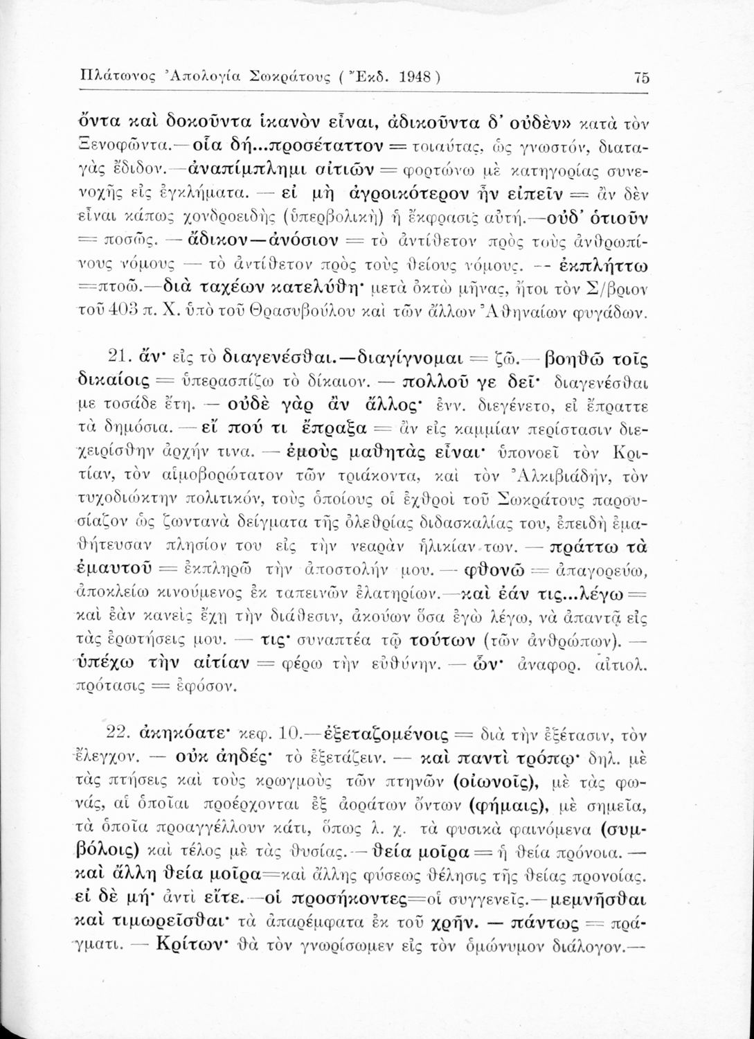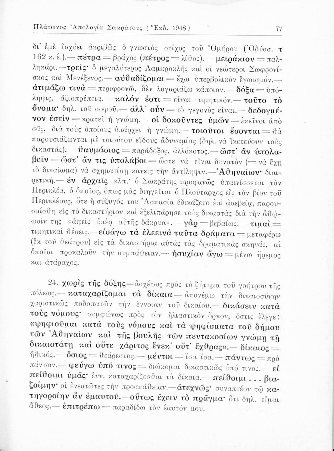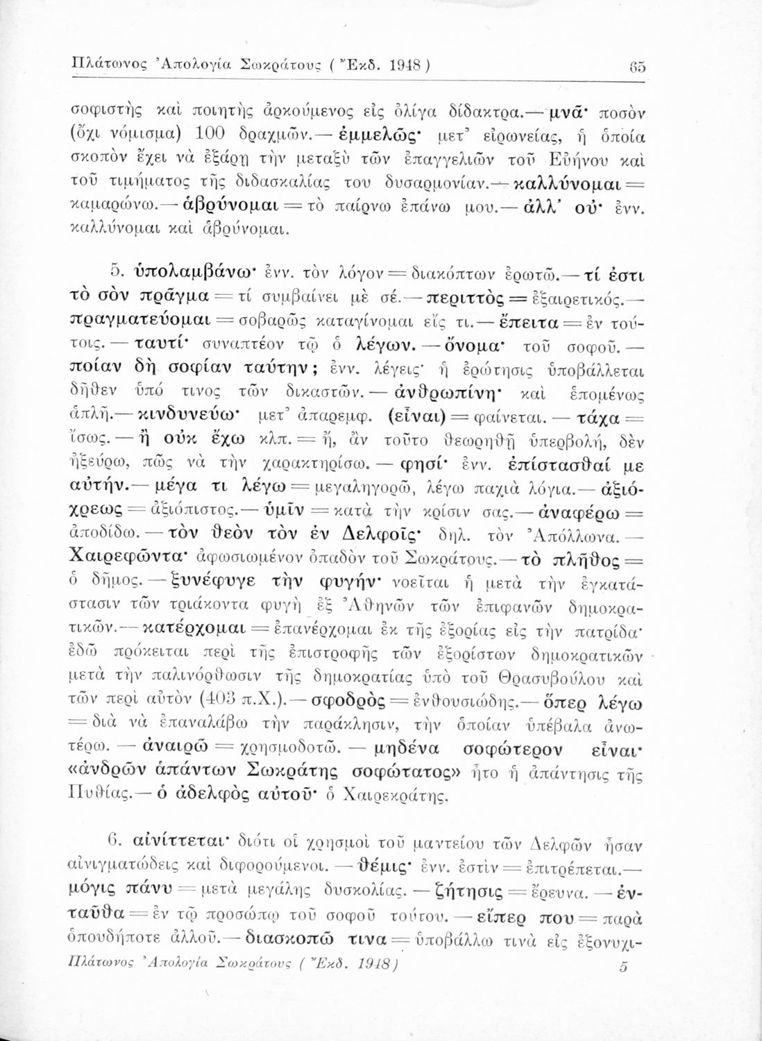 Σχολικό εγχειρίδιο της Ε΄ Γυμνασίου για το μάθημα των Αρχαίων Ελληνικών. Περιέχει το πρωτότυπο κείμενο του Πλάτωνα από την απολογία του Κρίτωνα με ερμηνευτικά, πραγματολογικά σχόλια και λεξιλογικές παρατηρήσεις του συγγραφέα.