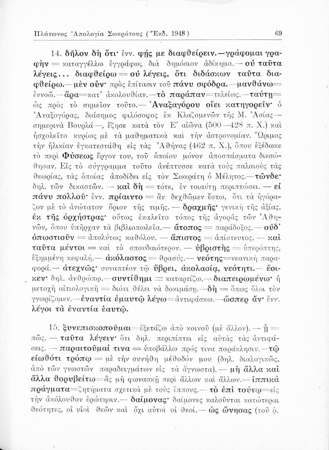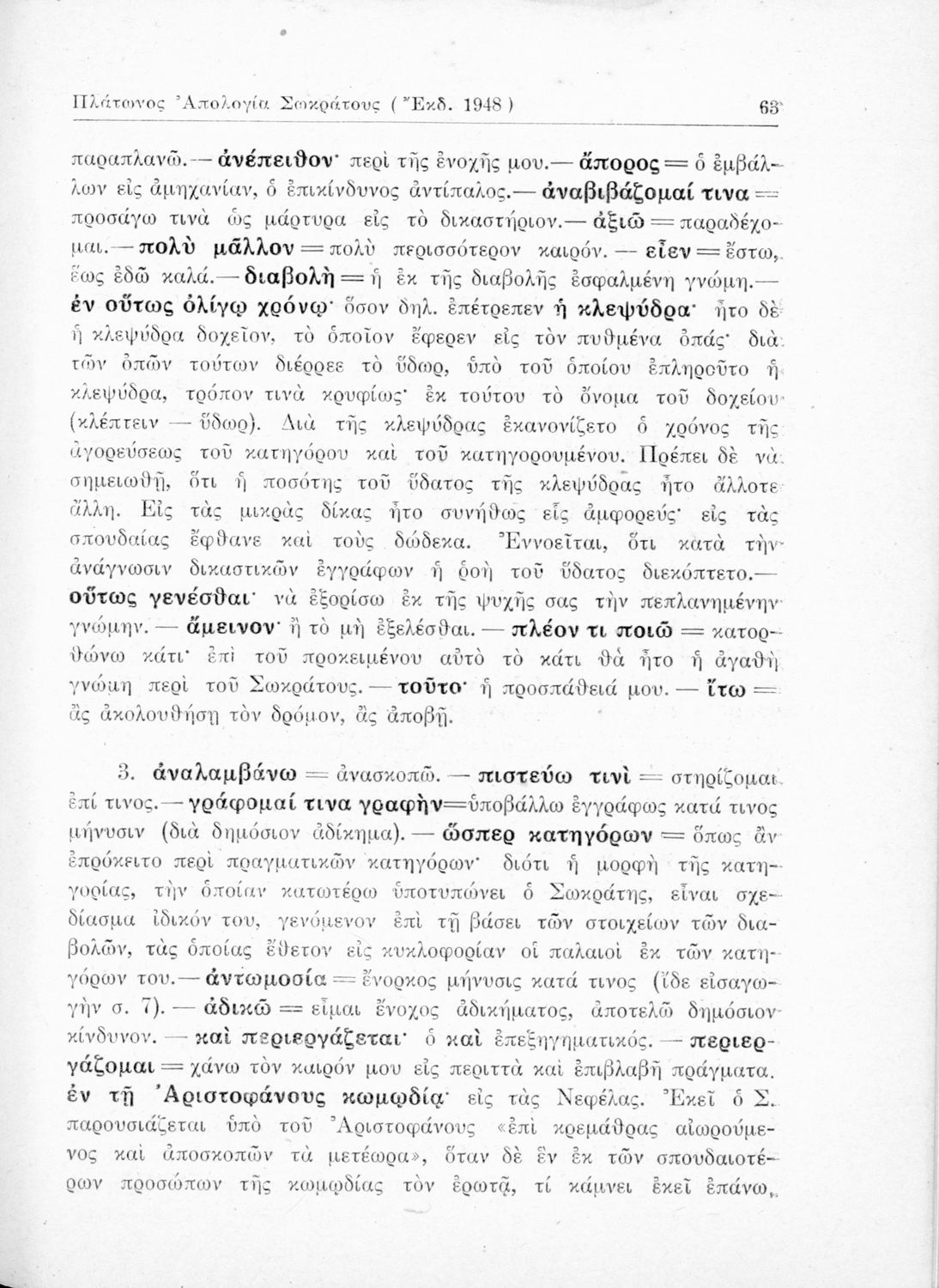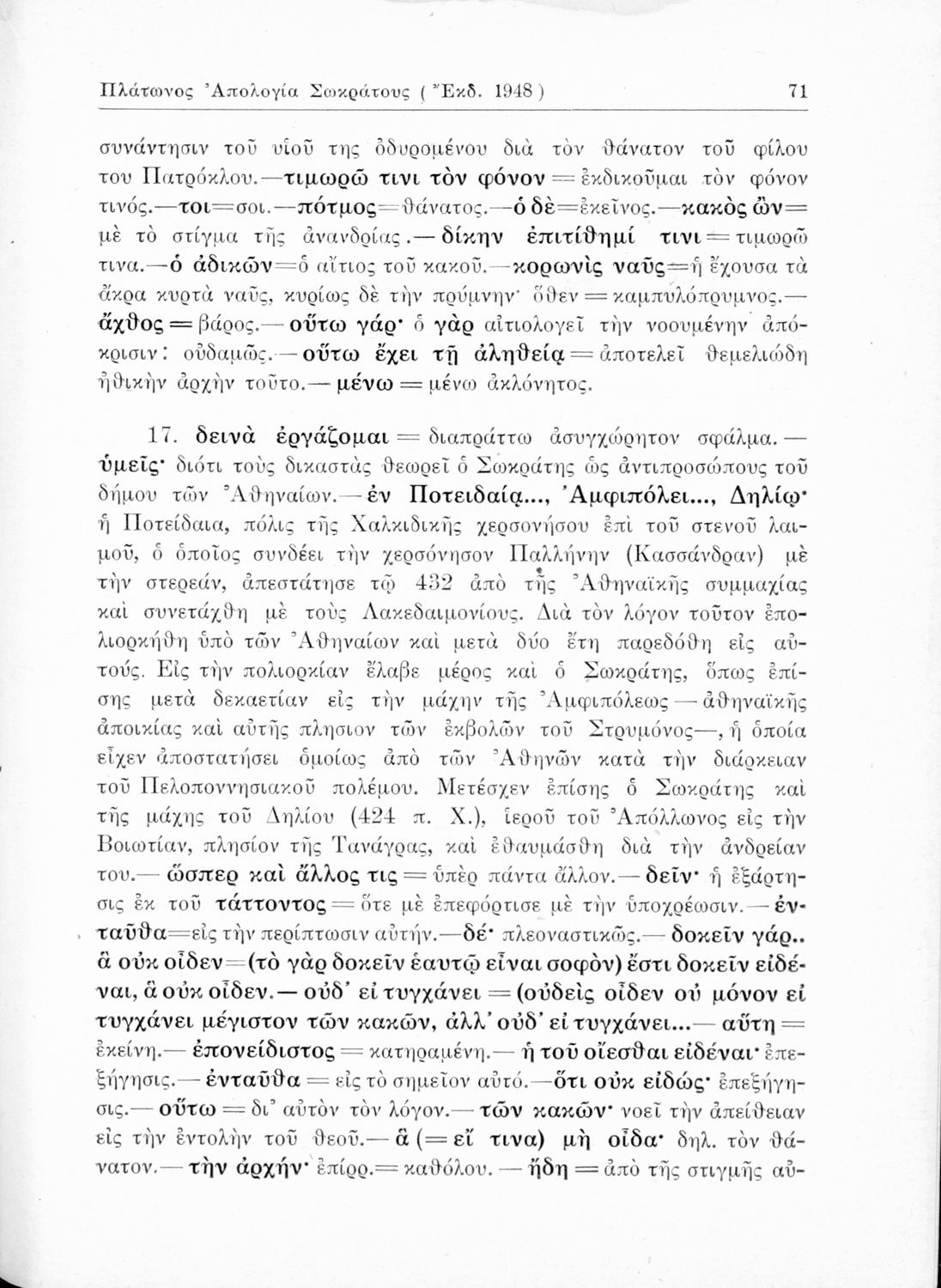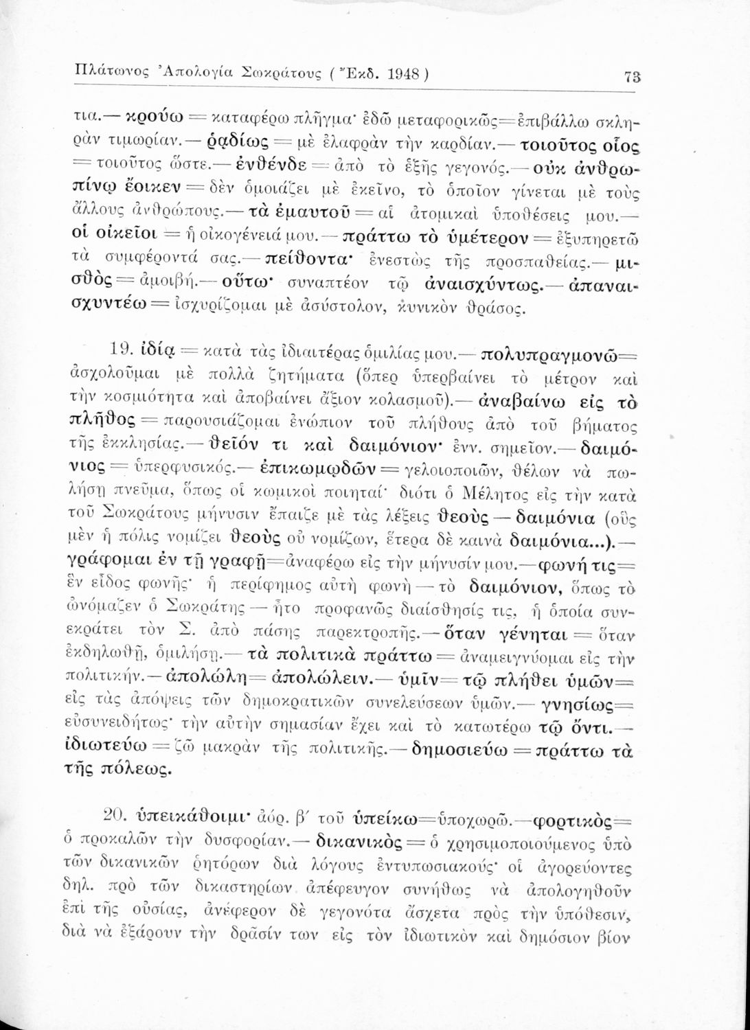 Σχολικό εγχειρίδιο της Ε΄ Γυμνασίου για το μάθημα των Αρχαίων Ελληνικών. Περιέχει το πρωτότυπο κείμενο του Πλάτωνα από την απολογία του Κρίτωνα με ερμηνευτικά, πραγματολογικά σχόλια και λεξιλογικές παρατηρήσεις του συγγραφέα.