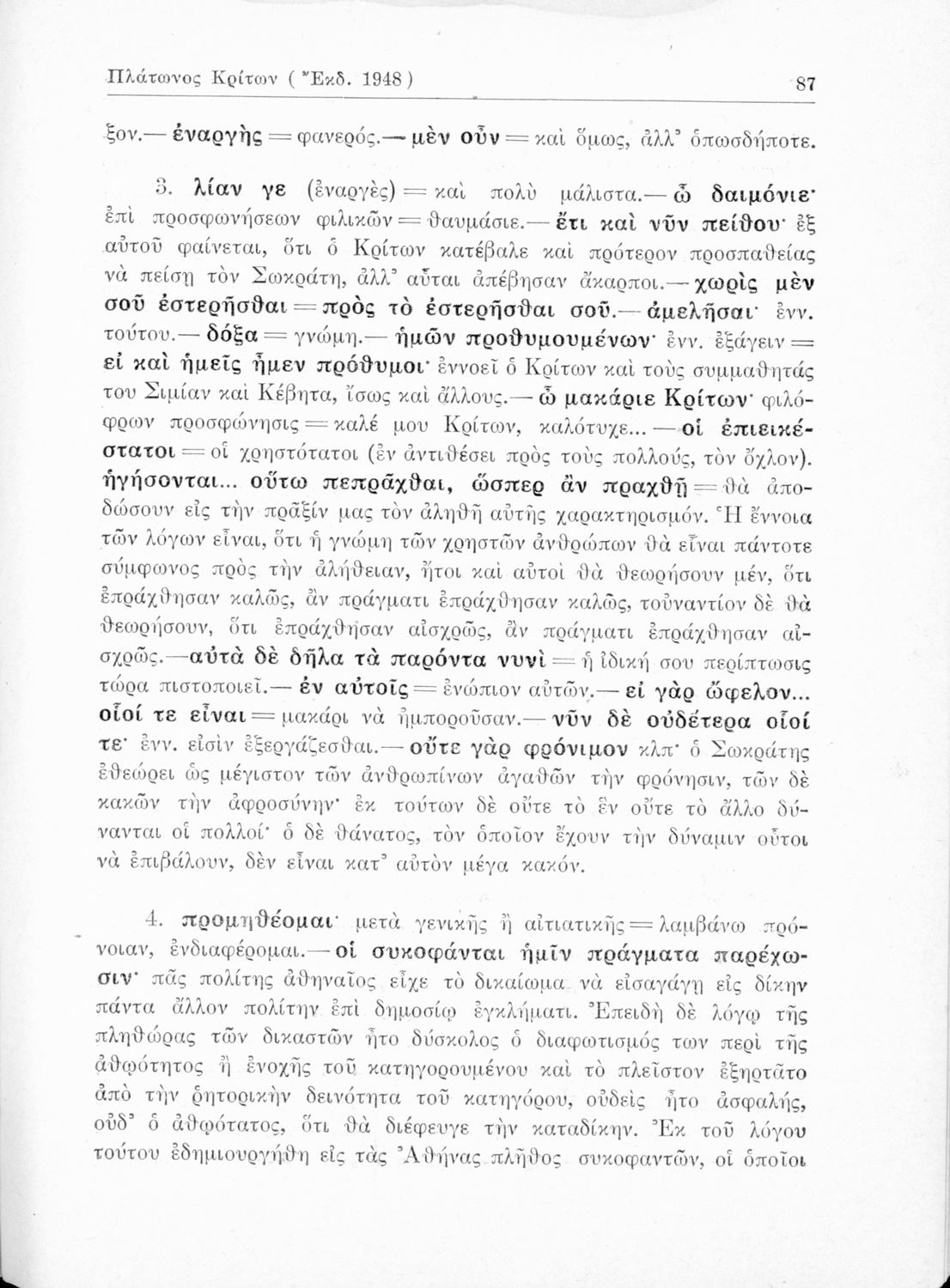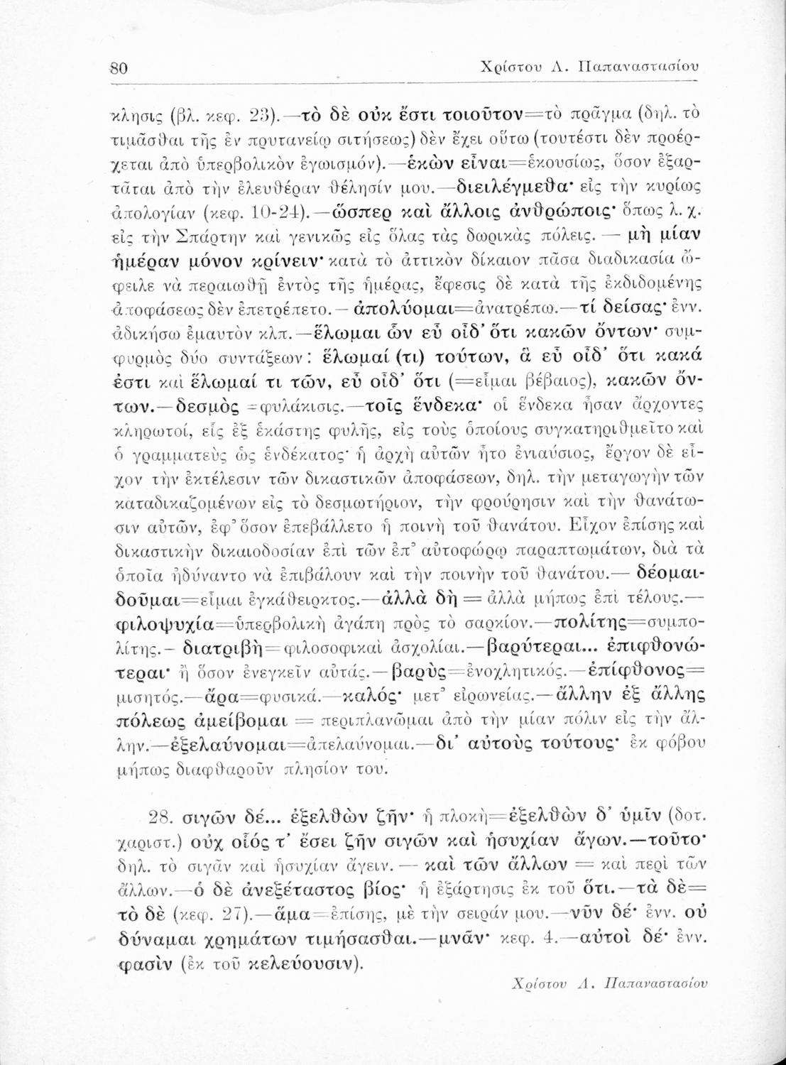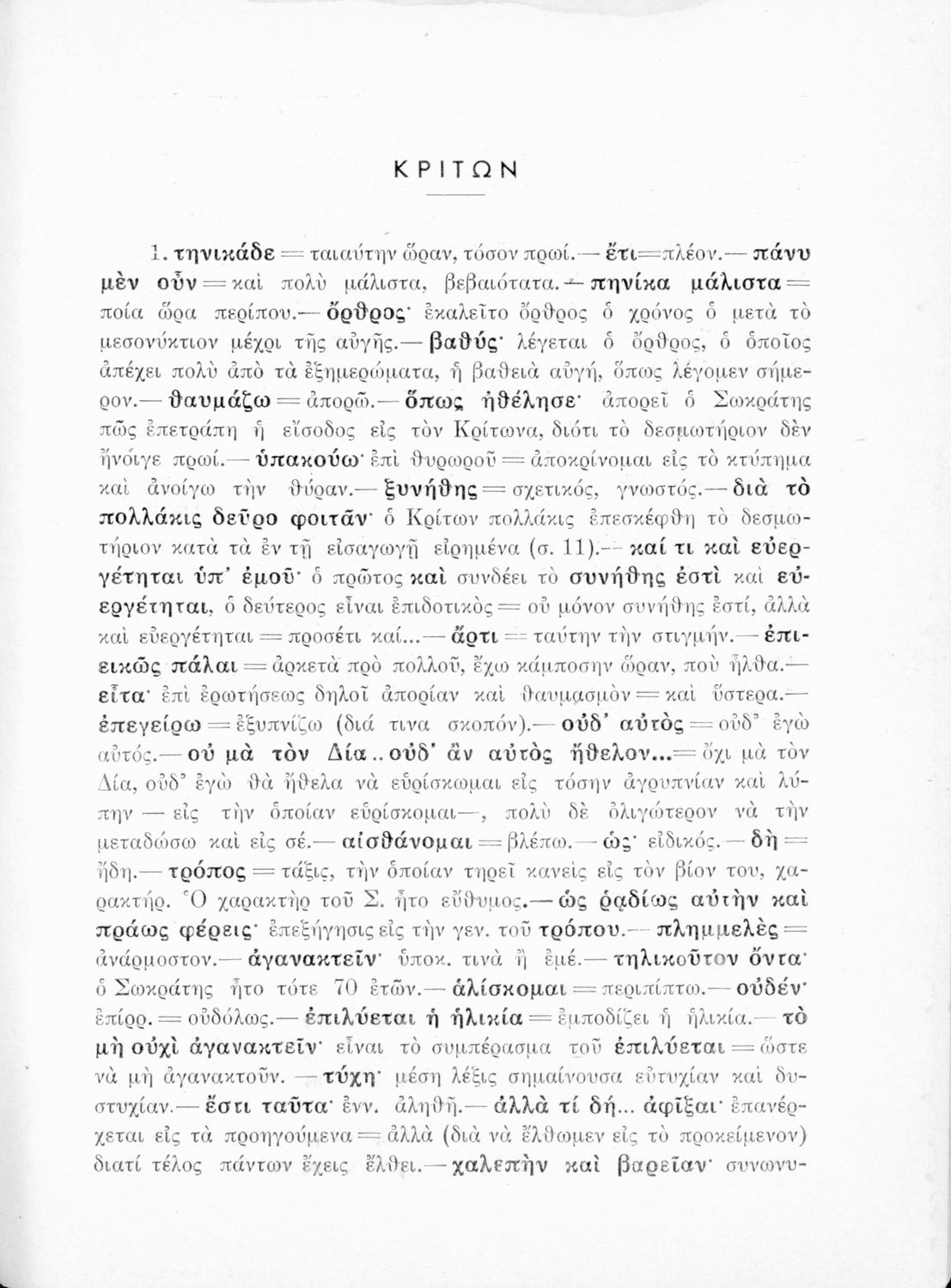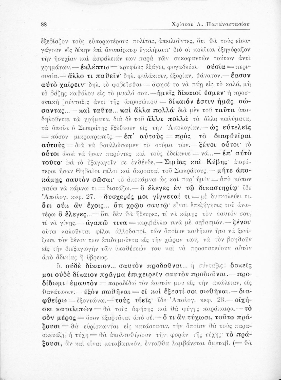 Σχολικό εγχειρίδιο της Ε΄ Γυμνασίου για το μάθημα των Αρχαίων Ελληνικών. Περιέχει το πρωτότυπο κείμενο του Πλάτωνα από την απολογία του Κρίτωνα με ερμηνευτικά, πραγματολογικά σχόλια και λεξιλογικές παρατηρήσεις του συγγραφέα.