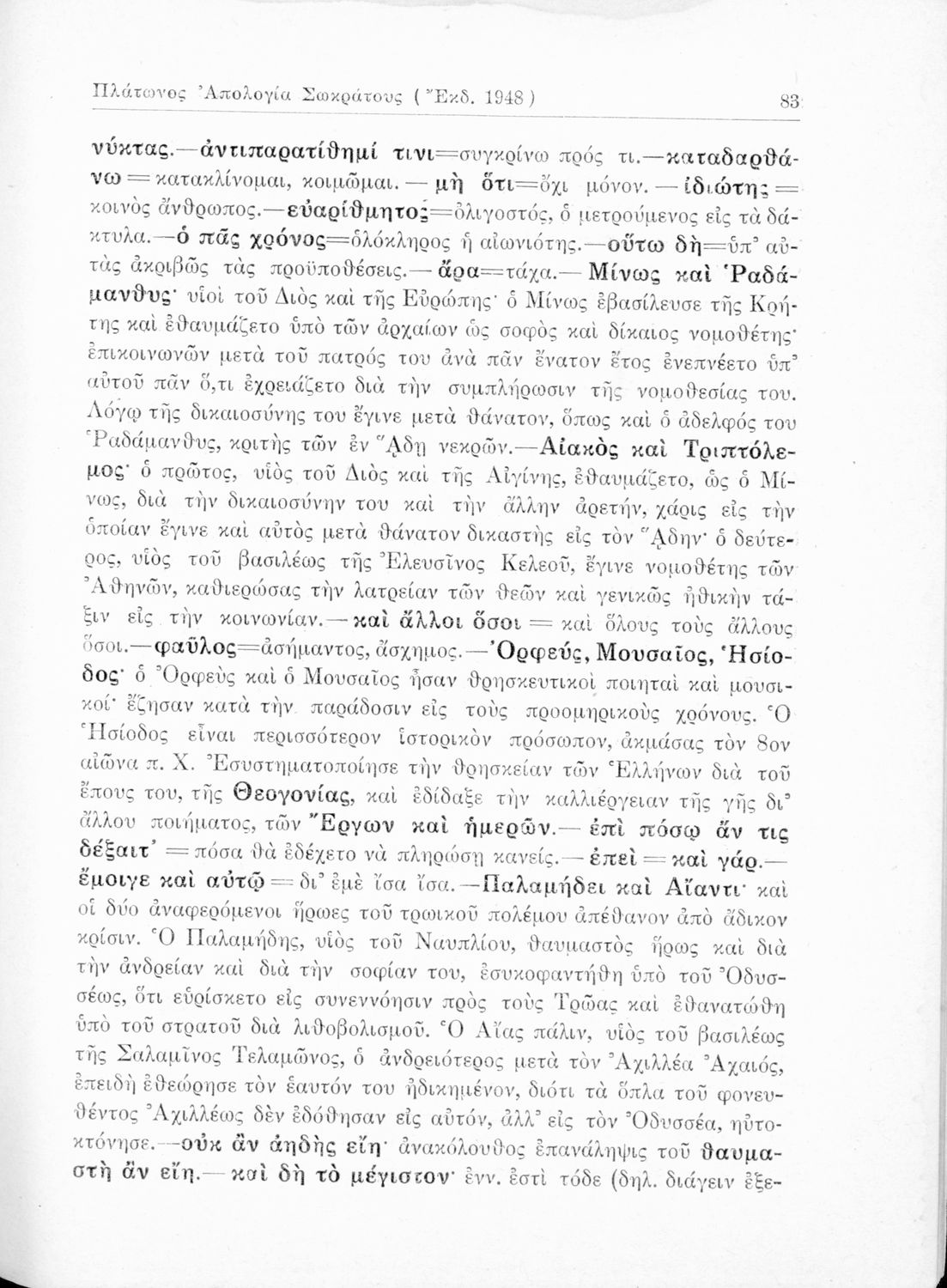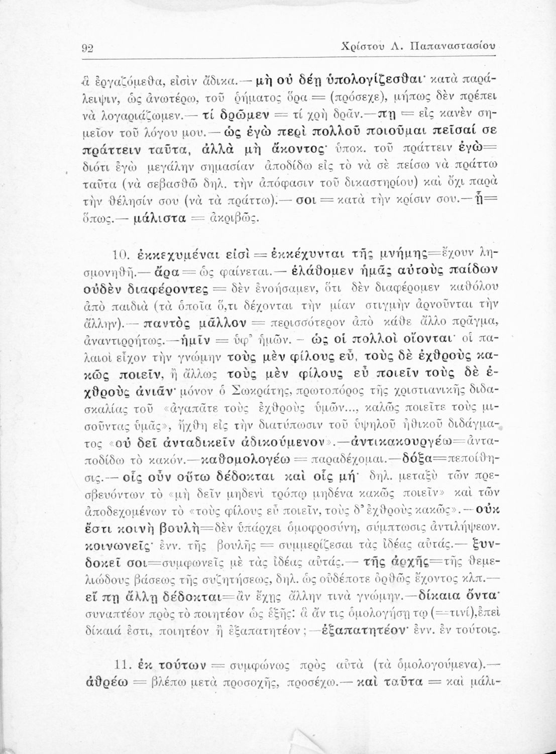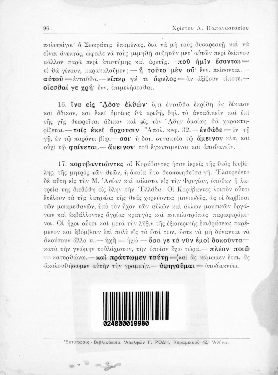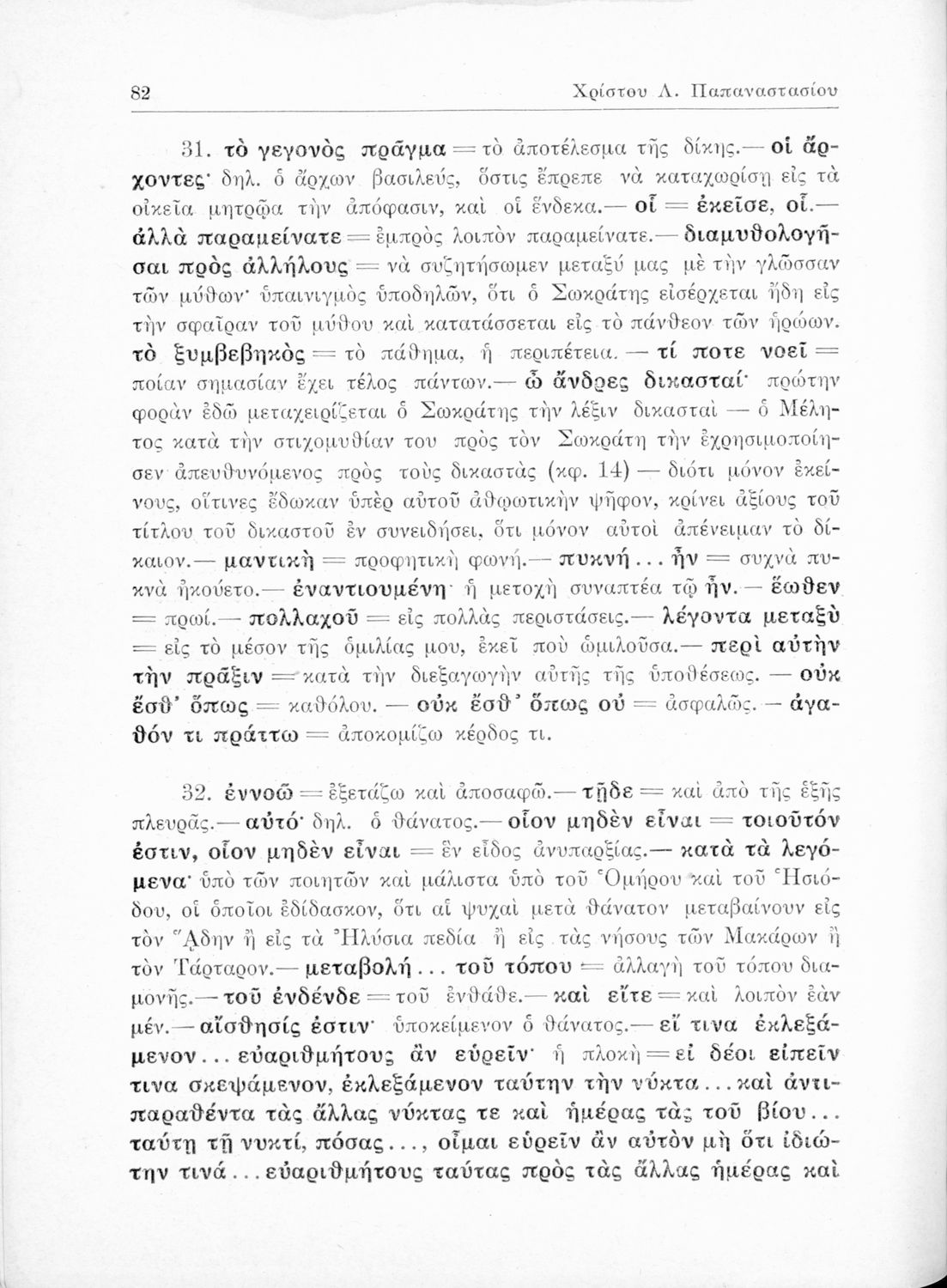 Σχολικό εγχειρίδιο της Ε΄ Γυμνασίου για το μάθημα των Αρχαίων Ελληνικών. Περιέχει το πρωτότυπο κείμενο του Πλάτωνα από την απολογία του Κρίτωνα με ερμηνευτικά, πραγματολογικά σχόλια και λεξιλογικές παρατηρήσεις του συγγραφέα.