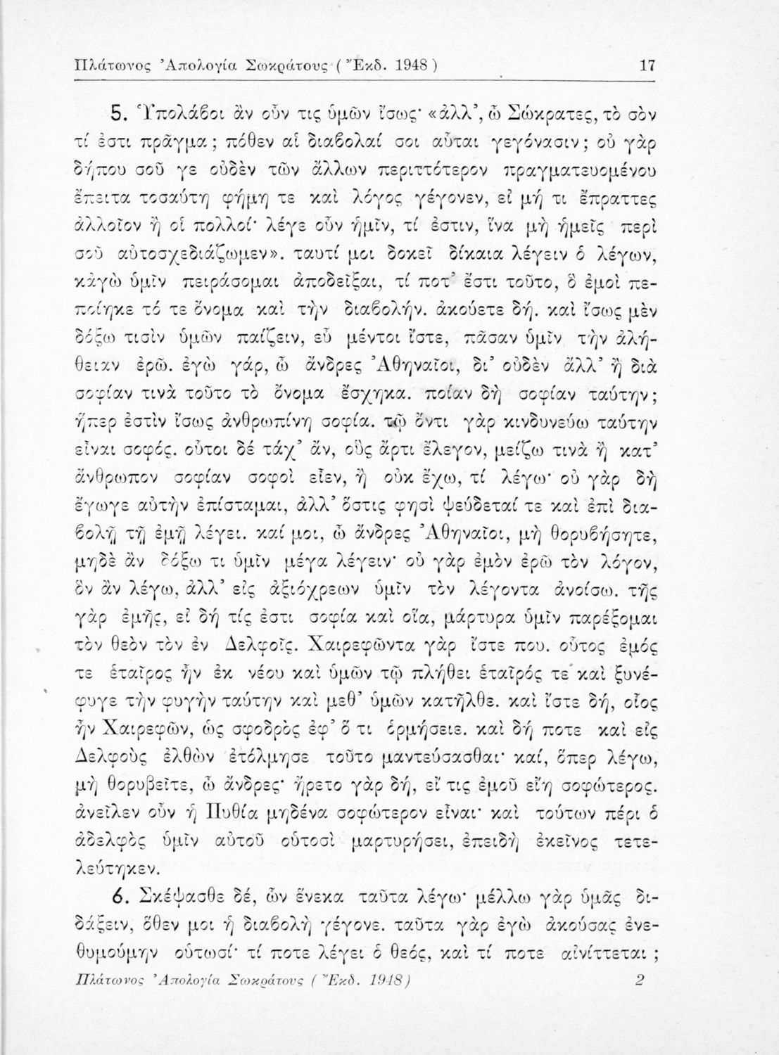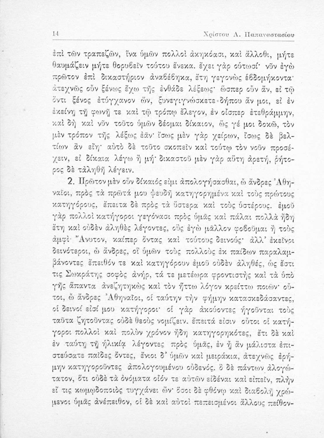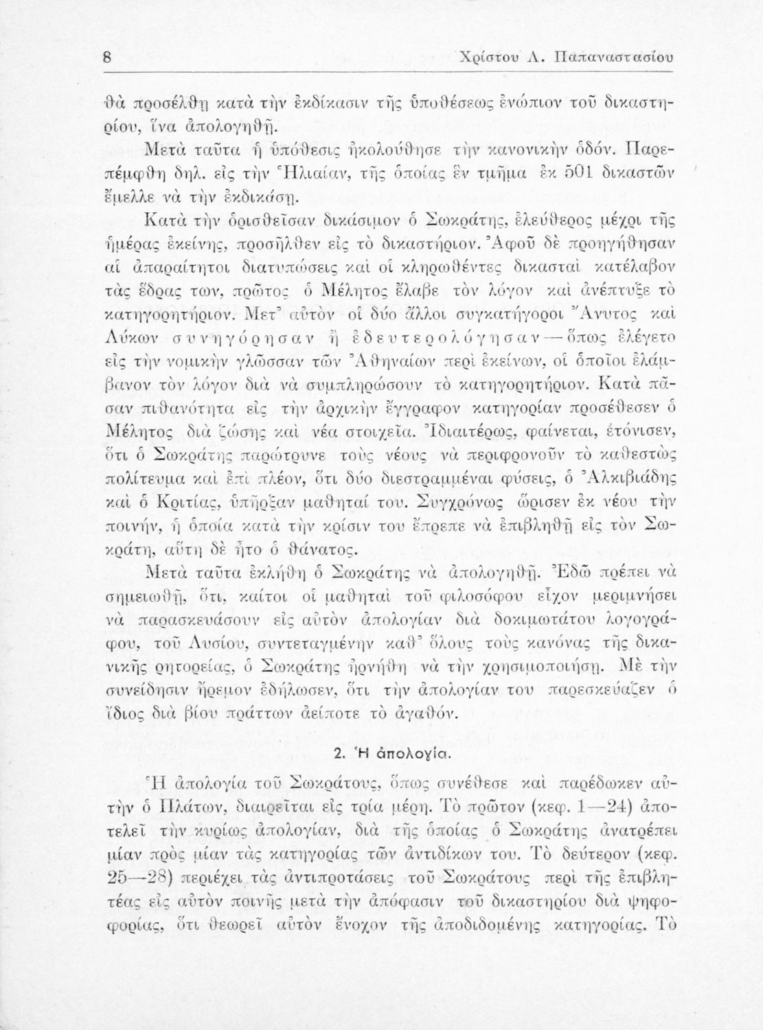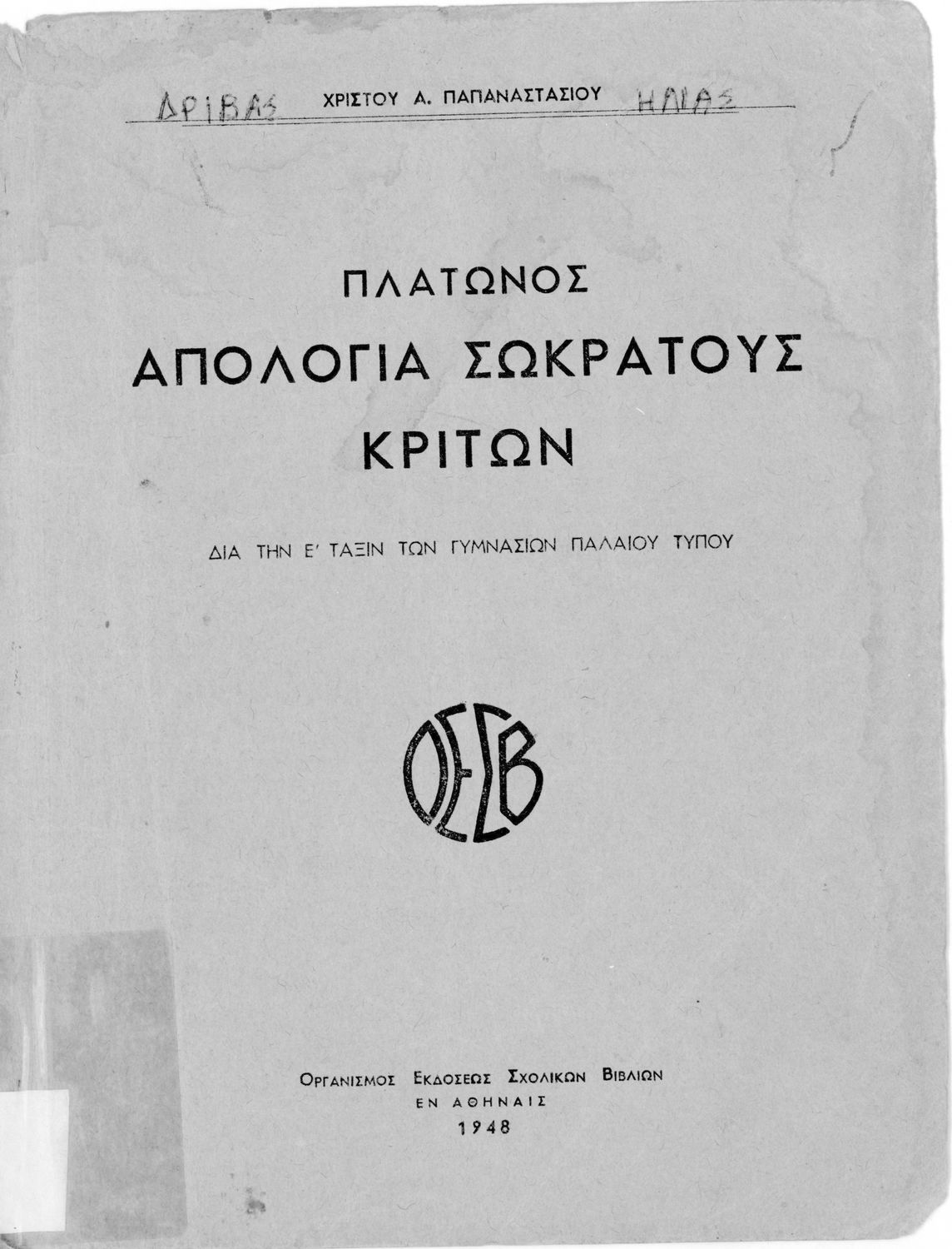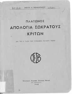 Σχολικό εγχειρίδιο της Ε΄ Γυμνασίου για το μάθημα των Αρχαίων Ελληνικών. Περιέχει το πρωτότυπο κείμενο του Πλάτωνα από την απολογία του Κρίτωνα με ερμηνευτικά, πραγματολογικά σχόλια και λεξιλογικές παρατηρήσεις του συγγραφέα.