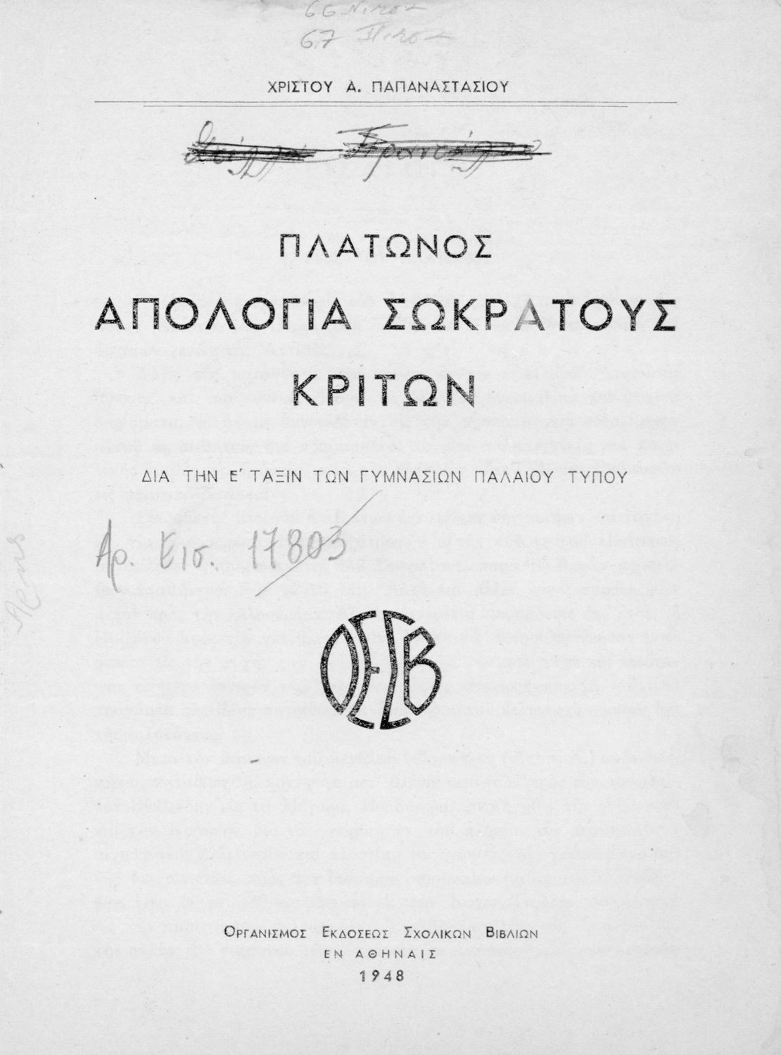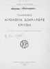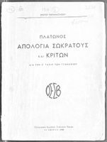 Κωδικός αναγνώρισης: 01-17809 Τίτλος: Πλάτωνος Απολογία Σωκράτους Κρίτων. Δια την Ε΄ Τάξιν Γυμνασίων Παλαιού Τύπου Συγγραφέας: Πλάτων, Χρίστος Α. Παπαναστασίου (σχόλια) Μέγεθος και υπόστρωμα: Σχολικό εγχειρίδιο, μαλακό εξώφυλλο, 55 σελίδες. Σκίτσα και πίνακες (ασπρόμαυρα). |