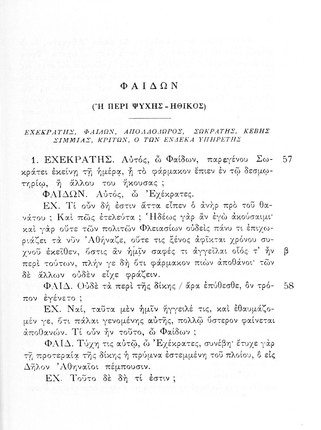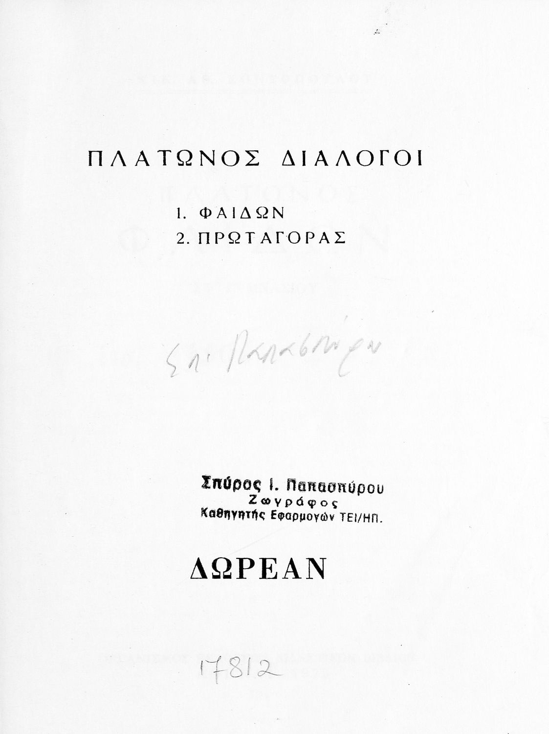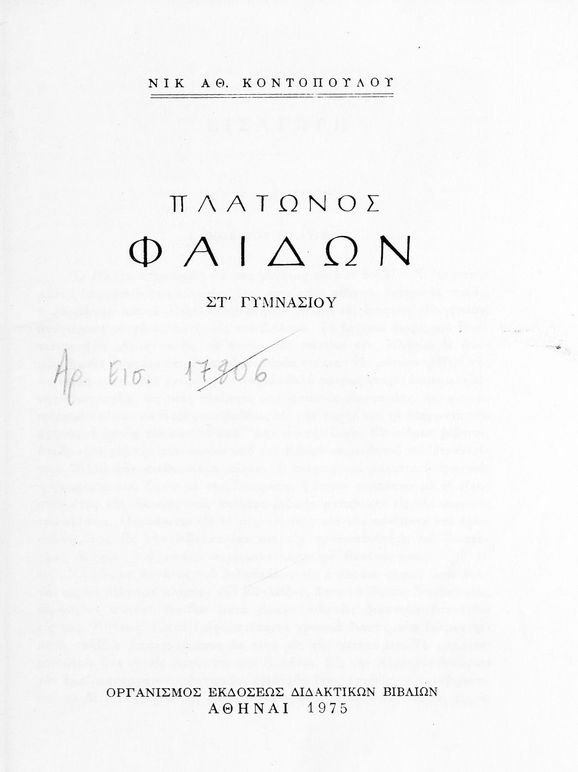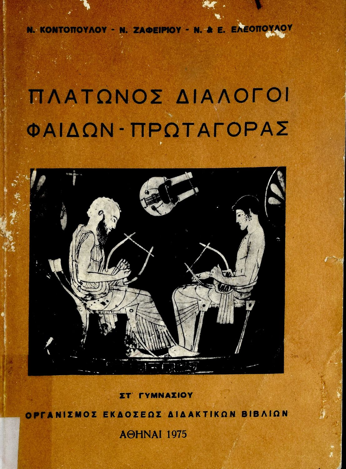 Σχολικό εγχειρίδιο Αρχαίων Ελληνικών για την ΣΤ΄ Γυμνασίου. Πρόκειται για βιβλίο με το πρωτότυπο κείμενο του Πλάτωνα. Υπάρχουν ερμηνευτικά σχόλια και εισαγωγή στη καθαρεύουσα. Το βιβλίο έχει εισαγωγές και ερμηνευτικά σχόλια.