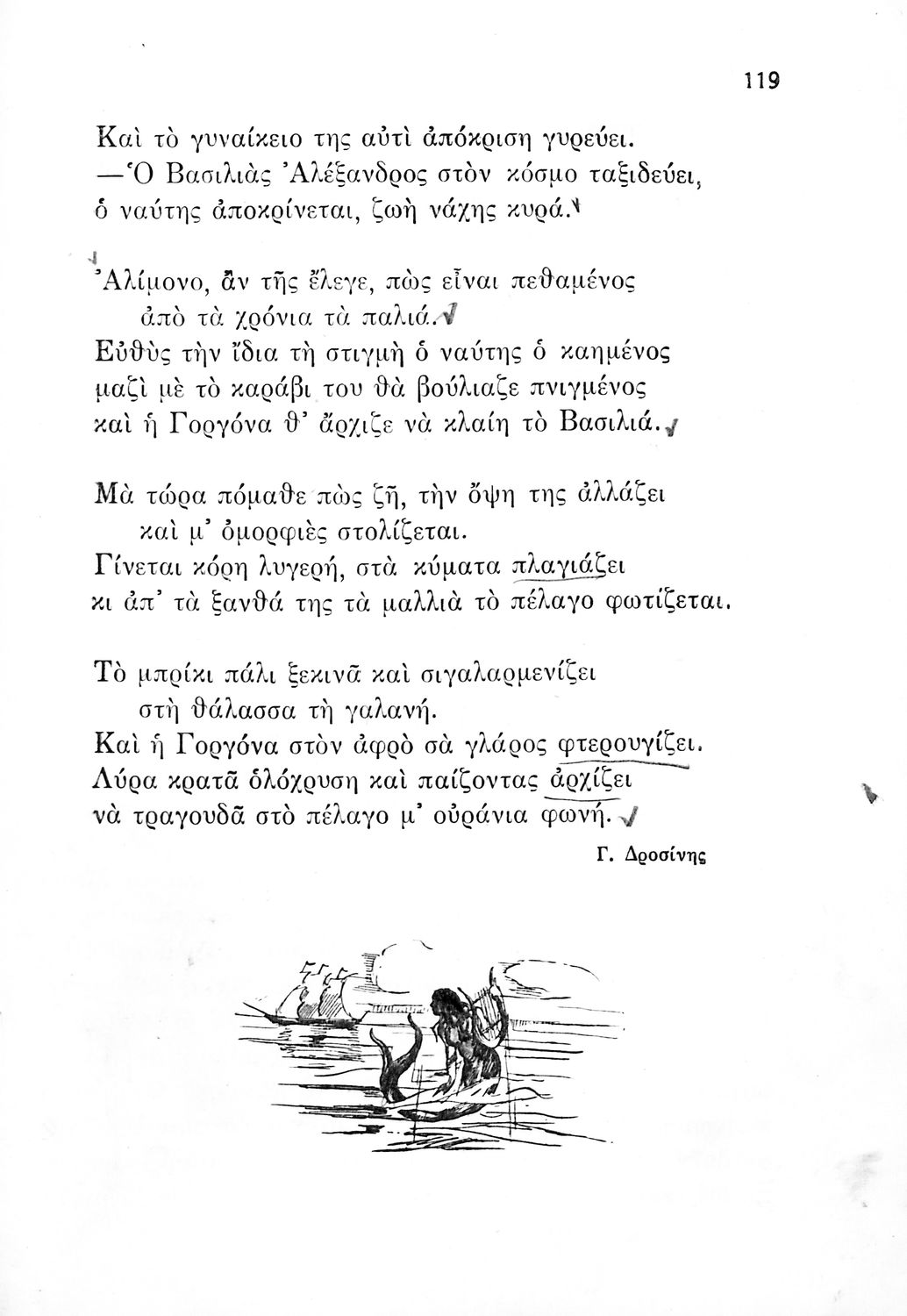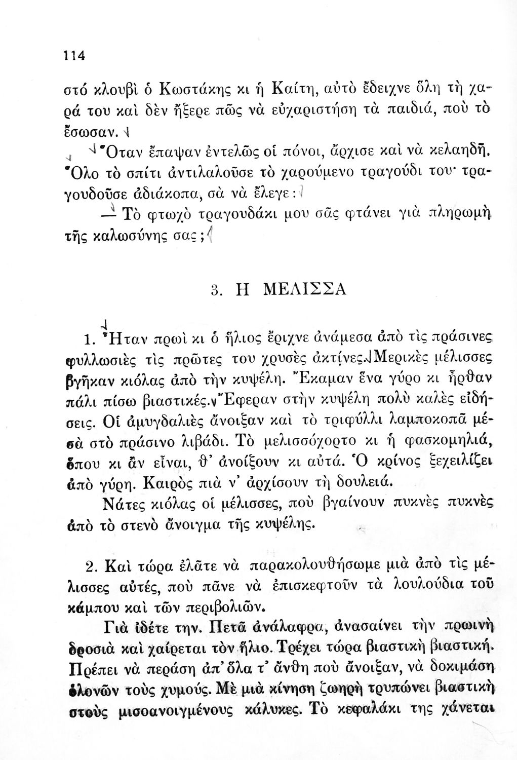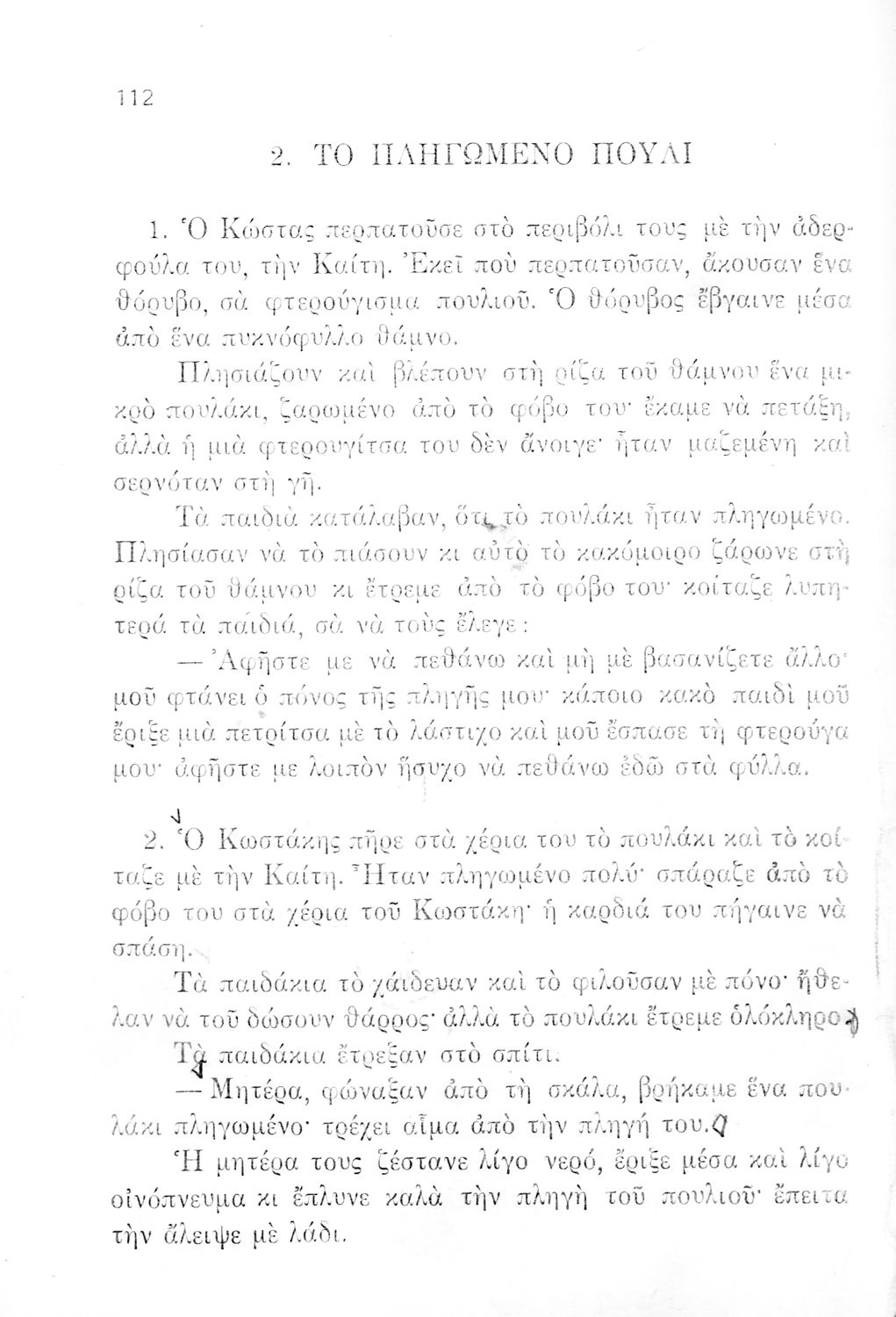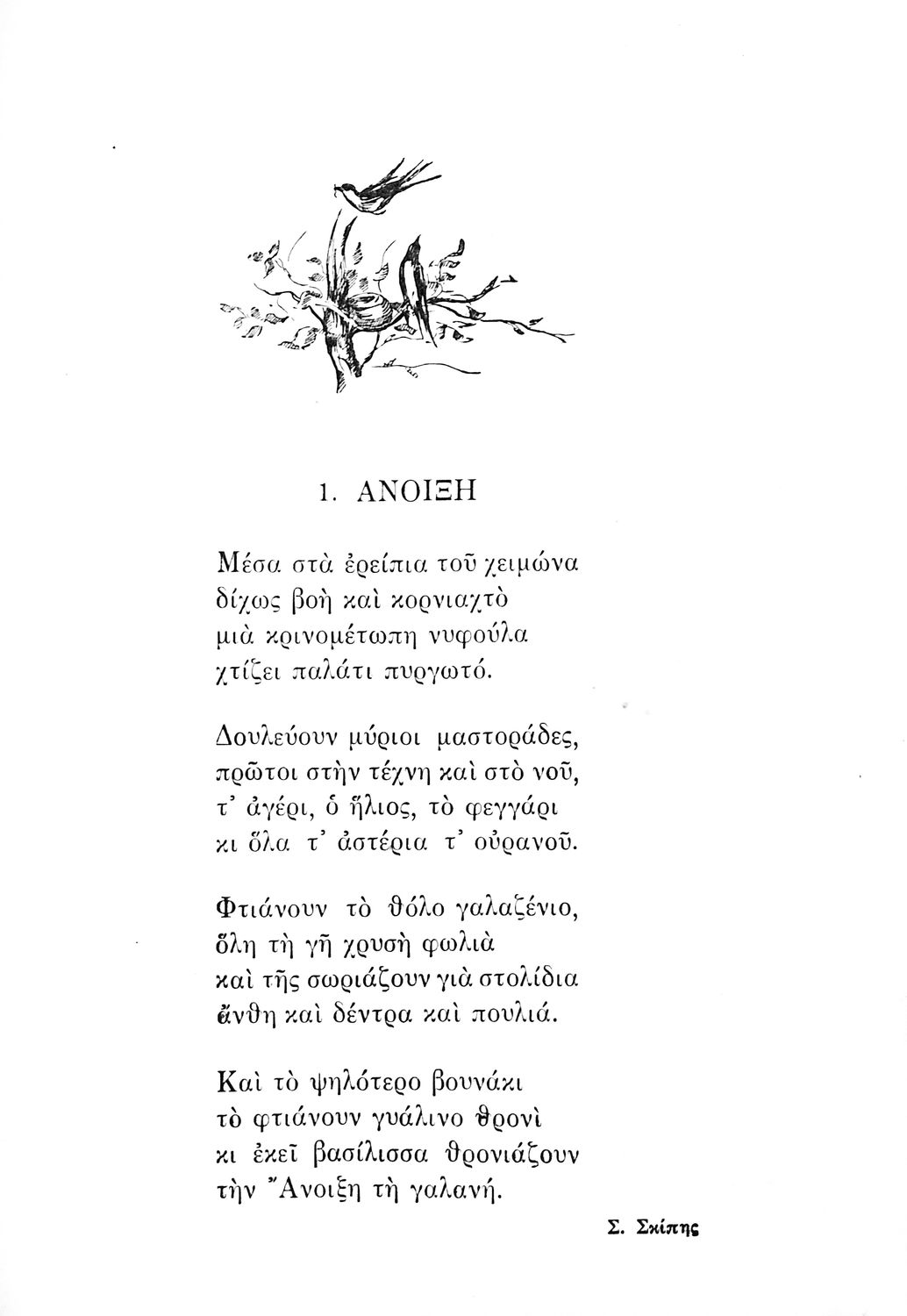 Αναγνωστικό για την Δ΄ τάξη του Δημοτικού. Περιλαμβάνει ένα κείμενο στο οποίο παρεμβάλλονται ποιήματα δημοτικά και Ελλήνων ποιητών.