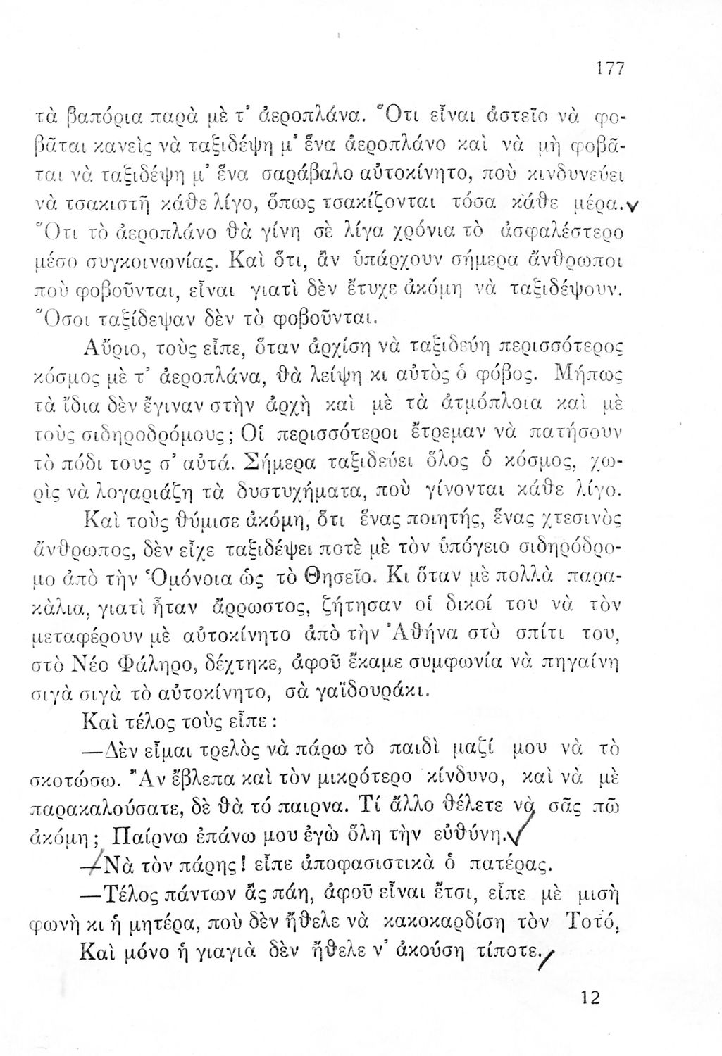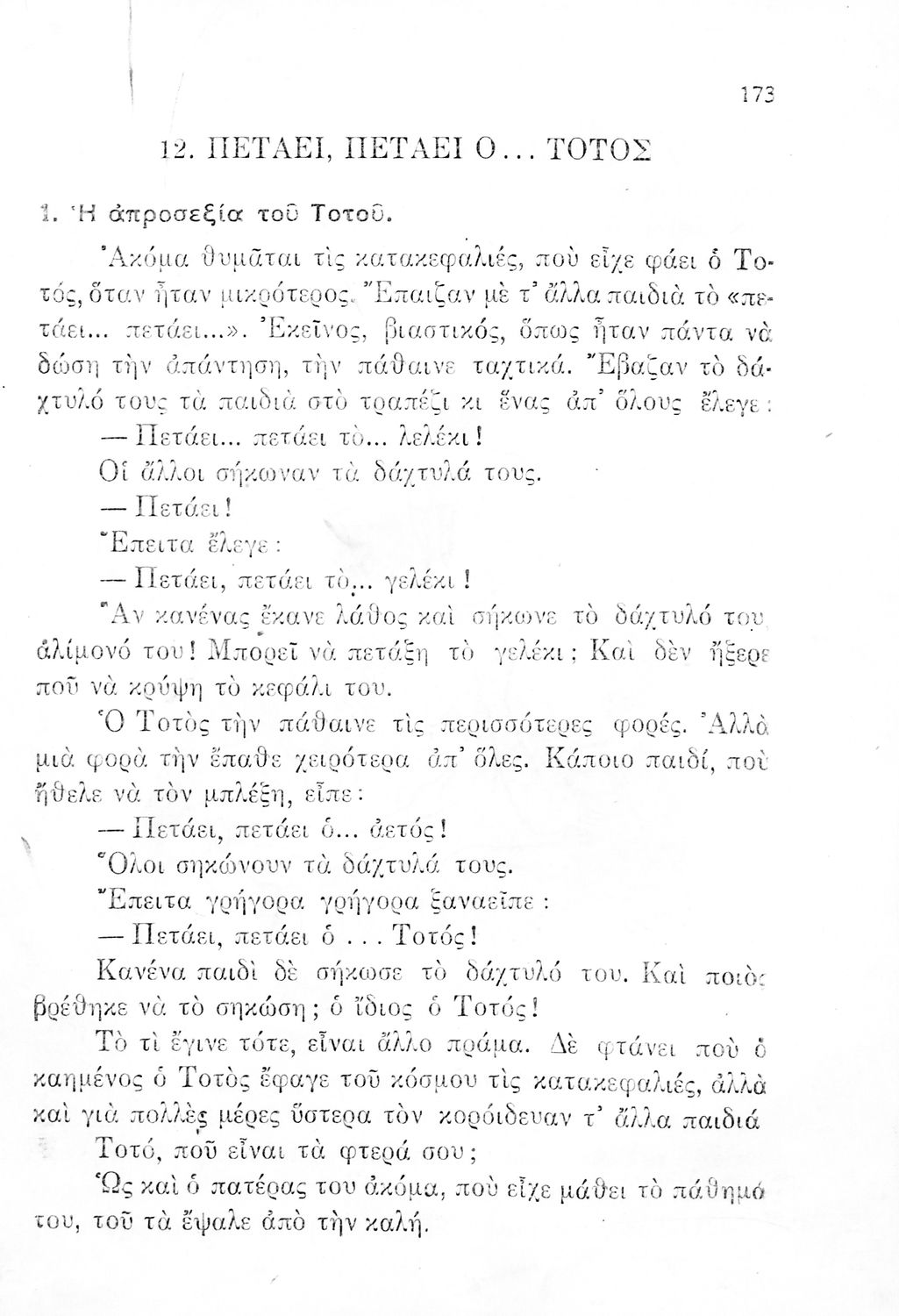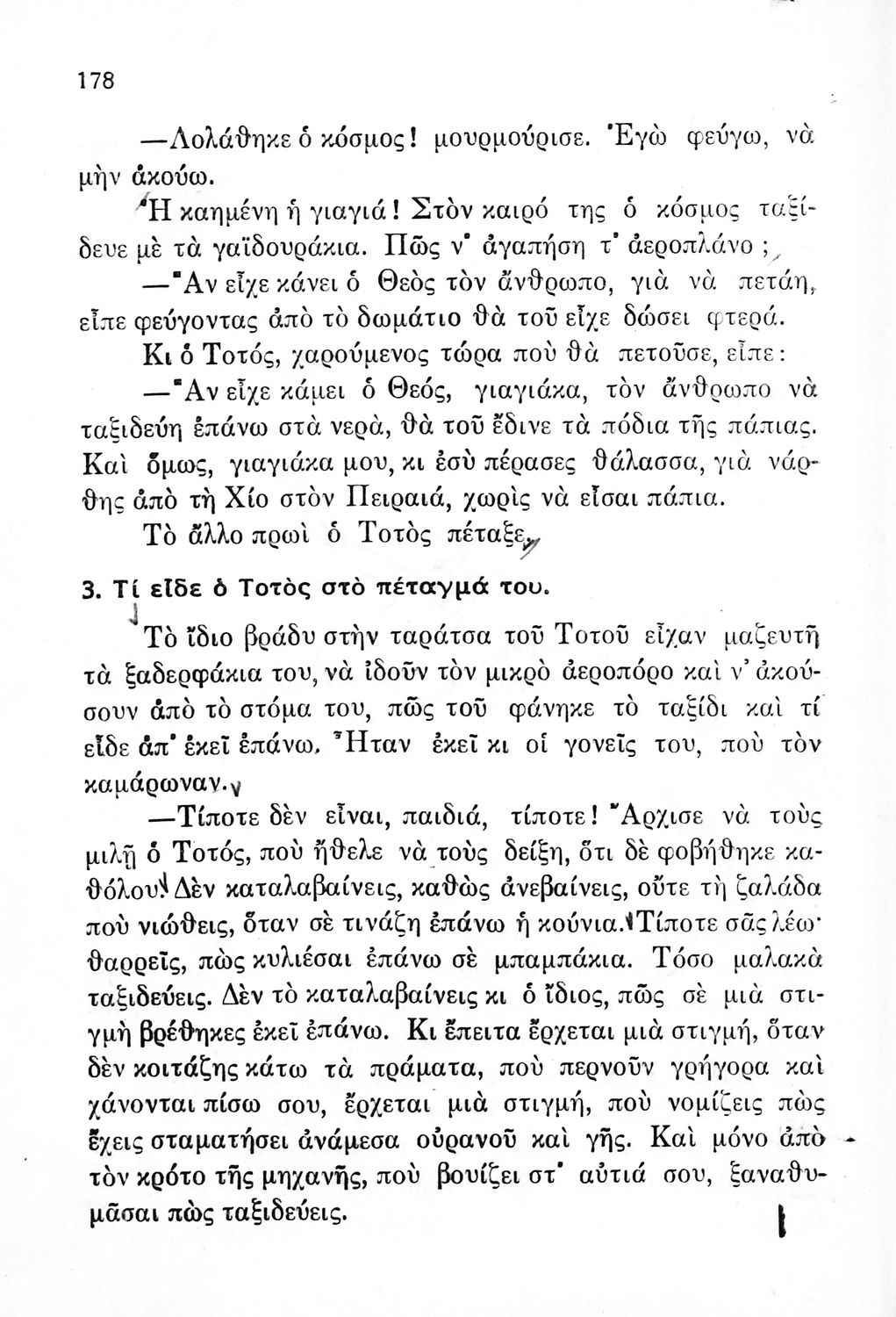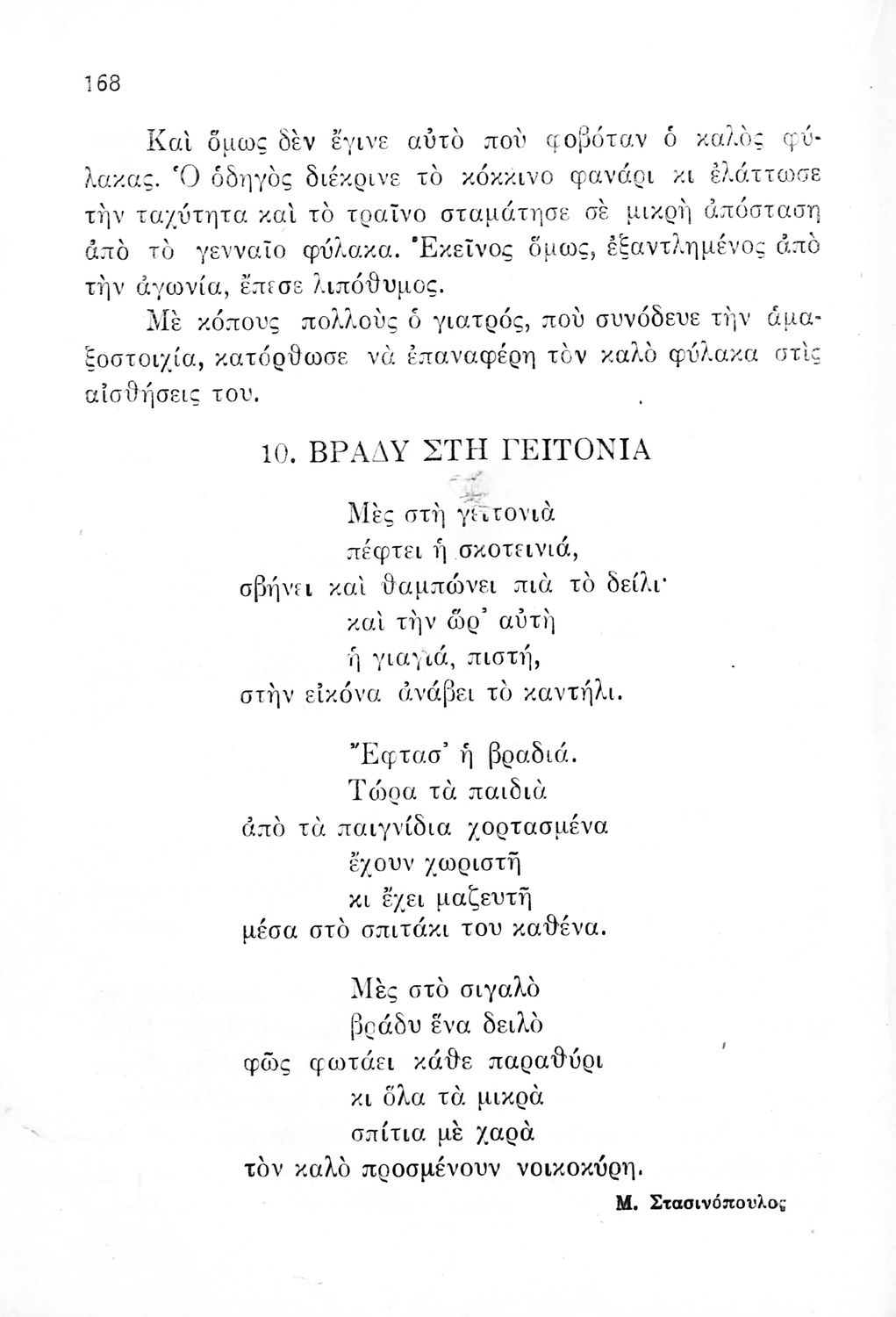 Αναγνωστικό για την Δ΄ τάξη του Δημοτικού. Περιλαμβάνει ένα κείμενο στο οποίο παρεμβάλλονται ποιήματα δημοτικά και Ελλήνων ποιητών.