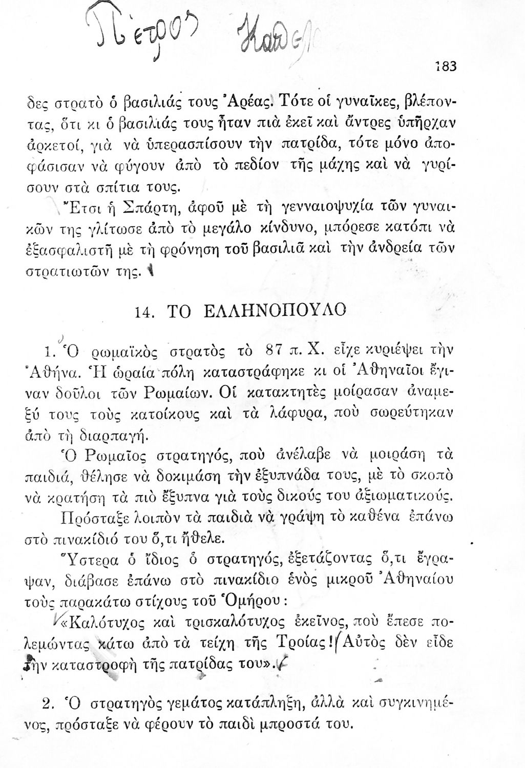 Αναγνωστικό Δ΄ Δημοτικού που περιέχει πεζά και ποιήματα με περιεχόμενο διδακτικό και ηθικοπλαστικό εμπνευσμένα από την ελληνική ιστορία και μυθολογία, και την αγροτική και κοινωνική ζωή.