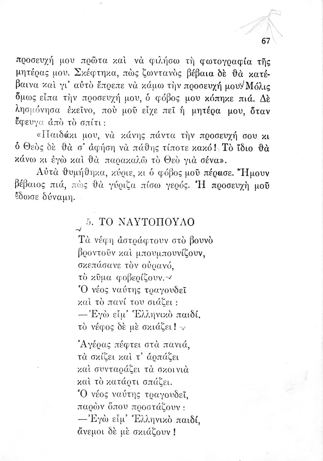 Αναγνωστικό για την Δ΄ τάξη του Δημοτικού. Περιλαμβάνει ένα κείμενο στο οποίο παρεμβάλλονται ποιήματα δημοτικά και Ελλήνων ποιητών.