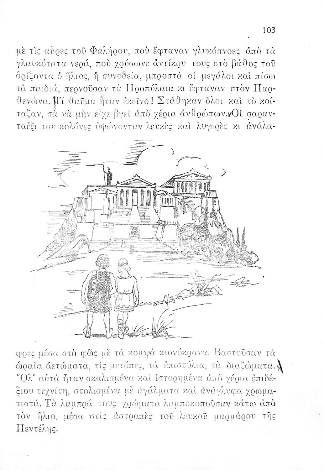 Αναγνωστικό Δ΄ Δημοτικού που περιέχει πεζά και ποιήματα εμπνευσμένα από την ελληνική ιστορία και μυθολογία, την κοινωνική ζωή και την ελληνική φύση.