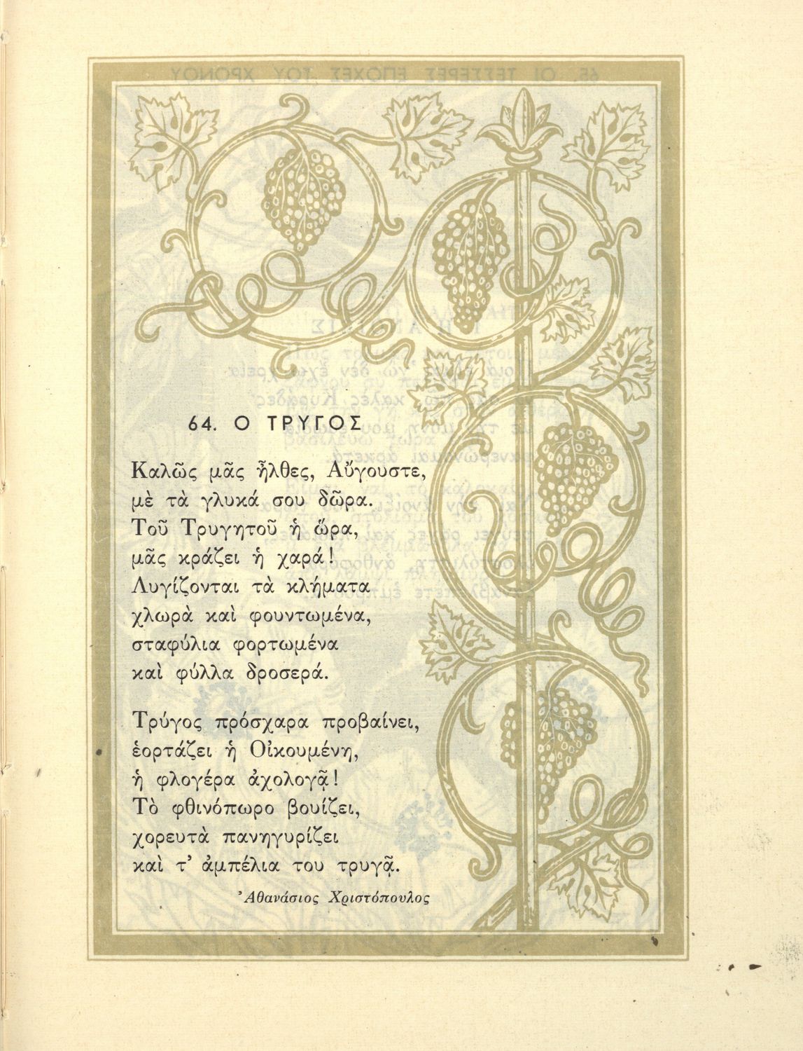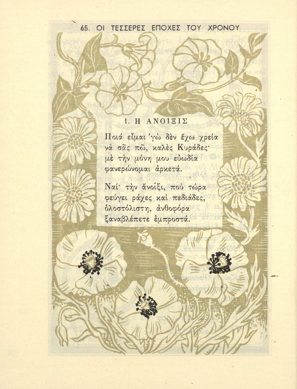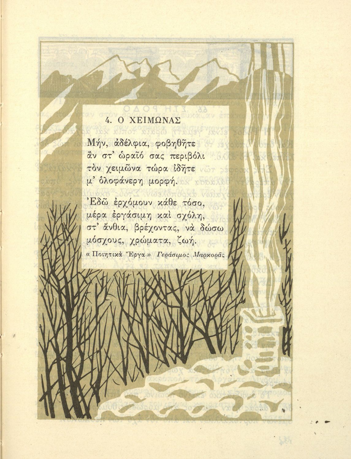 Αναγνωστικό Δ' Δημοτικού που είναι χωρισμένο σύμφωνα με τις εποχές του χρόνου και περιλαμβάνει ποιήματα και πεζά εμπνευσμένα από τη ζωή στην ύπαιθρο, την εθνική, οικογενειακή και κοινωνική ζωή, τη θρησκευτική ...