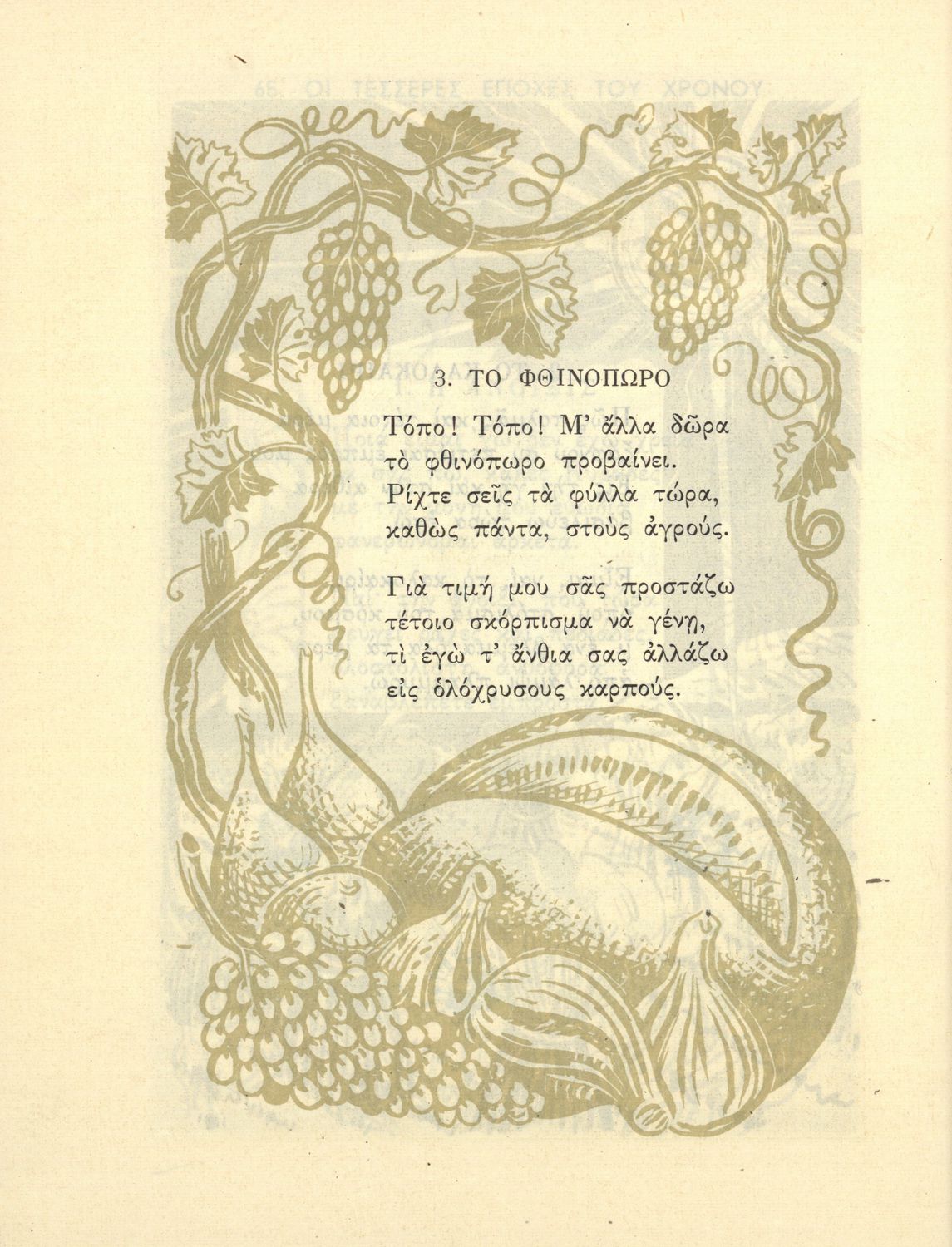 Αναγνωστικό Γ' Δημοτικού που είναι χωρισμένο σύμφωνα με τις εποχές του χρόνου και περιλαμβάνει ποιήματα και πεζά εμπνευσμένα από τη ζωή στην ύπαιθρο, την εθνική, οικογενειακή και κοινωνική ζωή, τη θρησκευτική ...