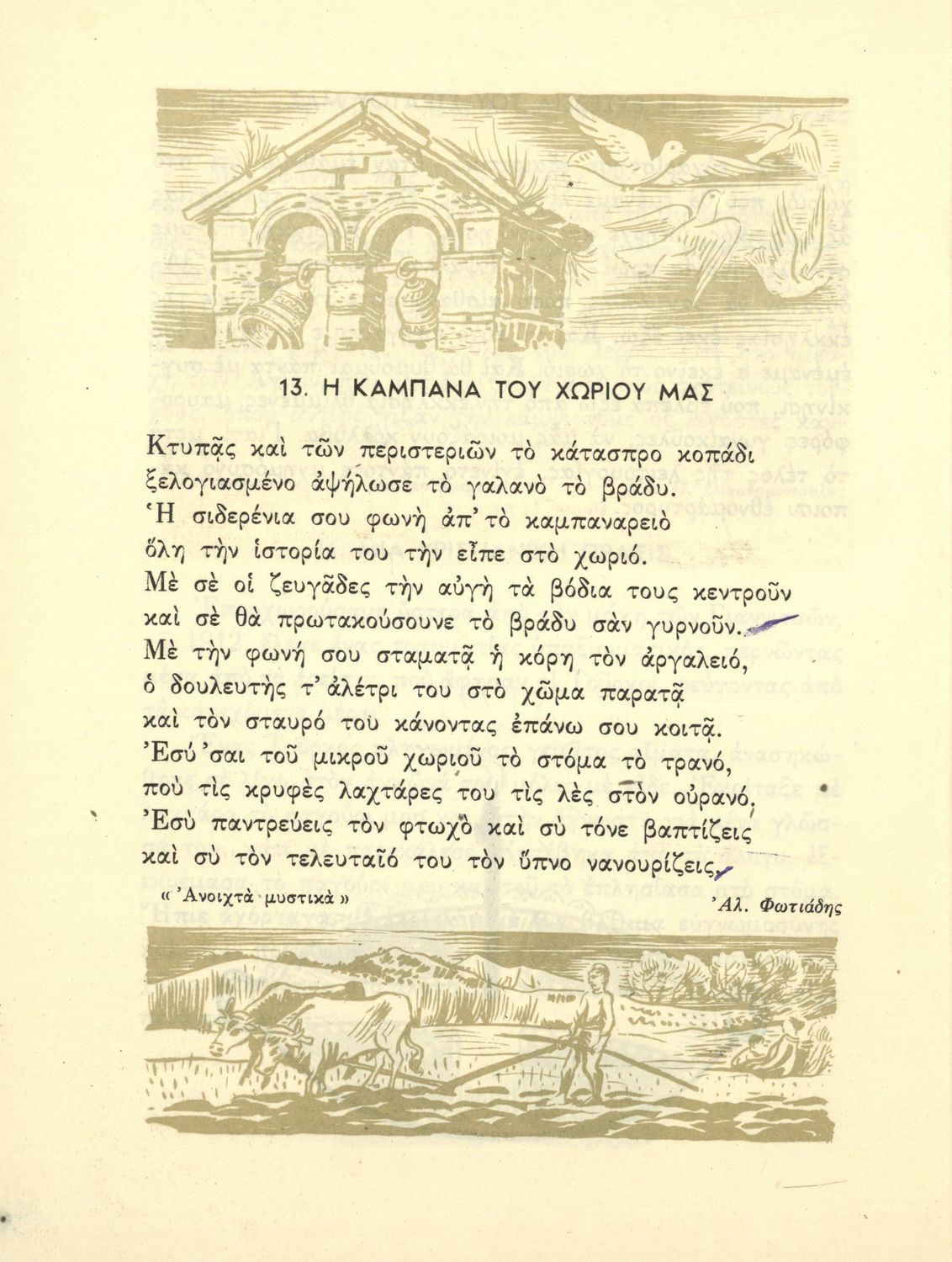 Αναγνωστικό Β' Δημοτικού που είναι χωρισμένο σύμφωνα με τις εποχές του χρόνου και περιλαμβάνει κείμενα ηθοποιητικού περιεχομένου εμπνευσμένα από τη θρησκευτική, εθνική, κοινωνική και οικογενειακή ζωή. Φέρει το