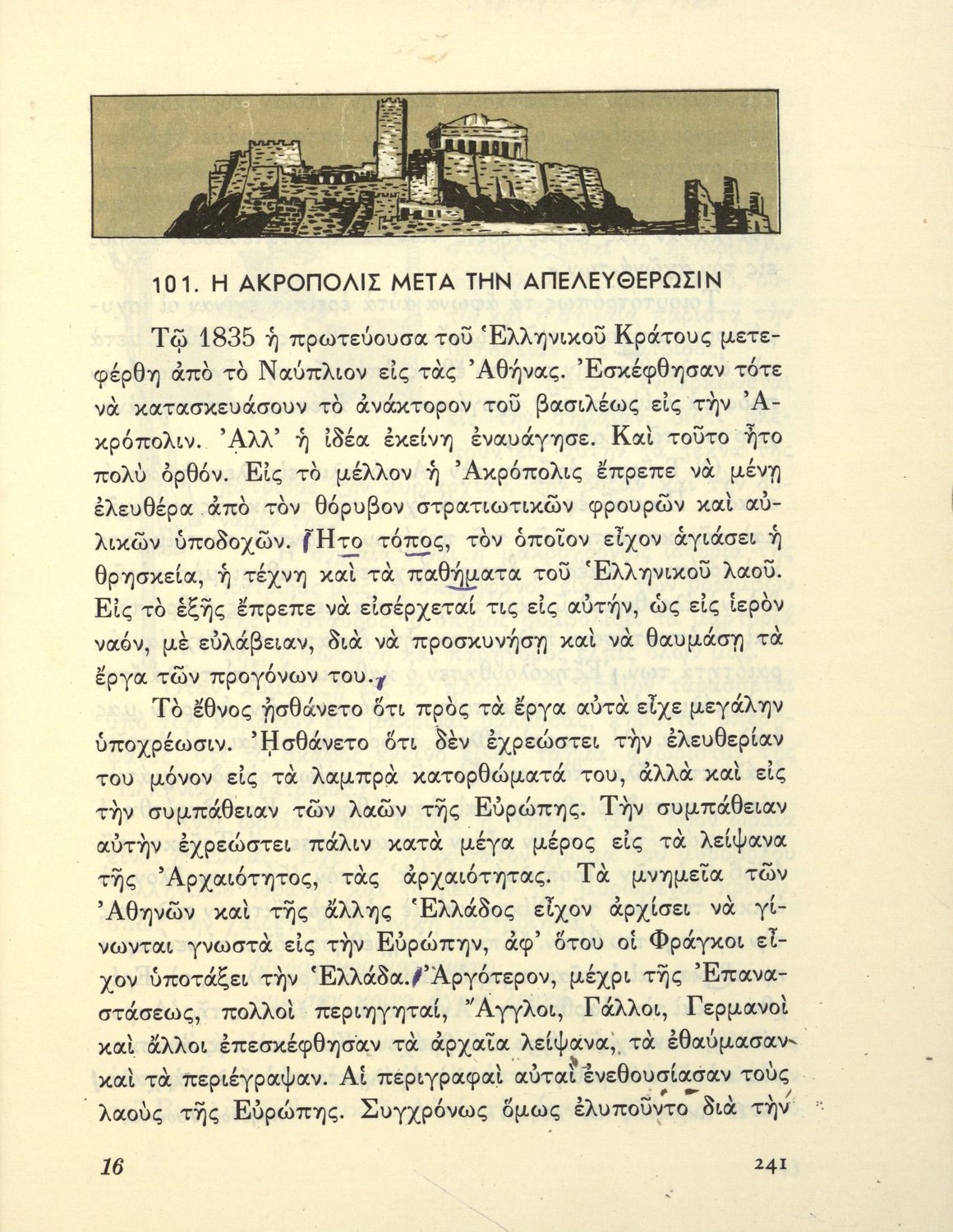 Βαθμίδα εκπαίδευσης: Πρωτοβάθμια Τάξη: ΣΤ' Δημοτικού Μάθημα: Νέα Ελληνικά Γλώσσα: Καθαρεύουσα Παρουσίαση περιεχομένου: Αναγνωστικό ΣΤ΄ Δημοτικού που αντλεί τα θέματά του από τη θρησκευτική, εθνική, οικογενειακή, κοινωνική και επαγγελματική ζωή και την σύγχρονη ελληνική ιστορία. |