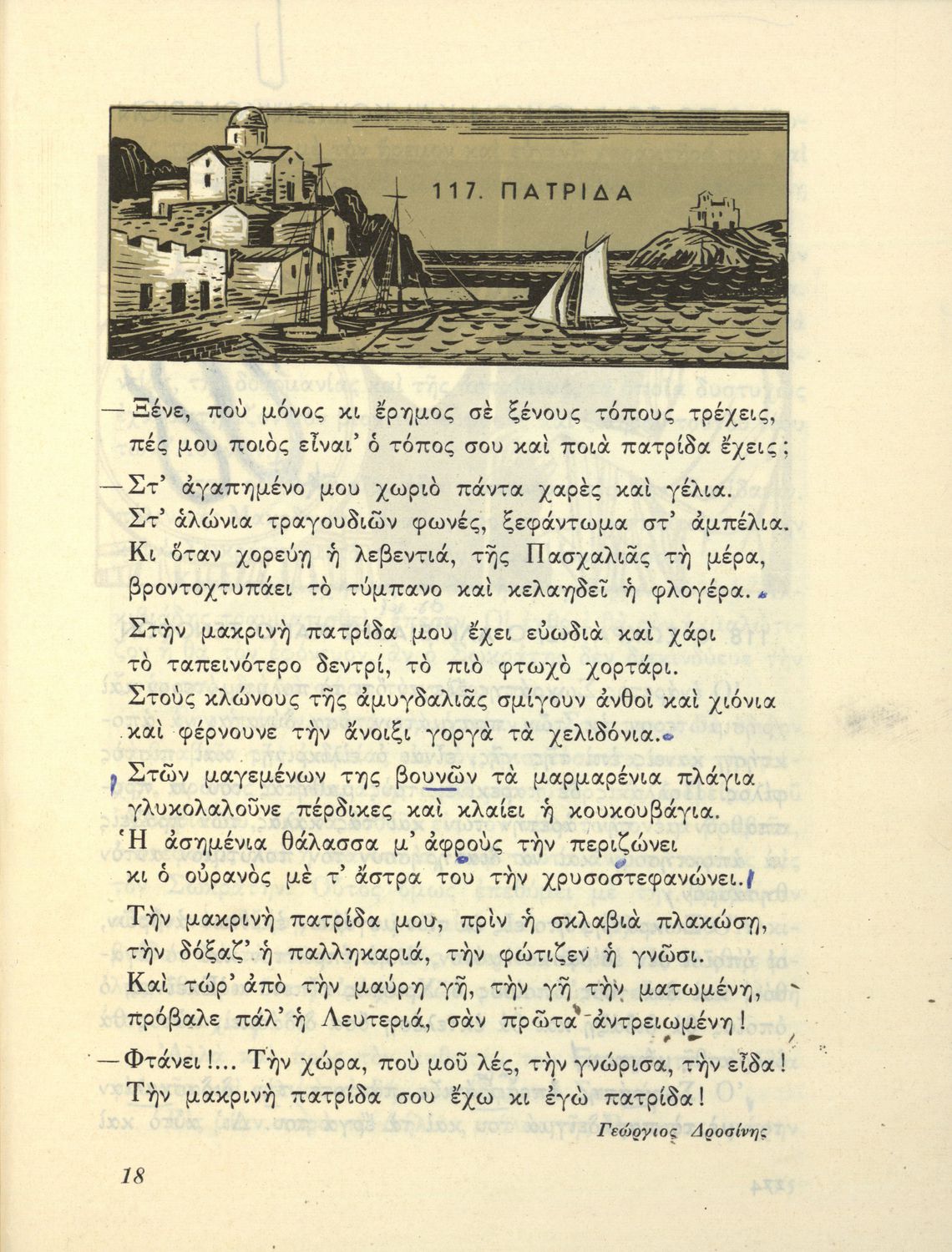 Αναγνωστικό Δ' Δημοτικού που είναι χωρισμένο σύμφωνα με τις εποχές του χρόνου και περιλαμβάνει ποιήματα και πεζά εμπνευσμένα από τη ζωή στην ύπαιθρο, την εθνική, οικογενειακή και κοινωνική ζωή, τη θρησκευτική ...