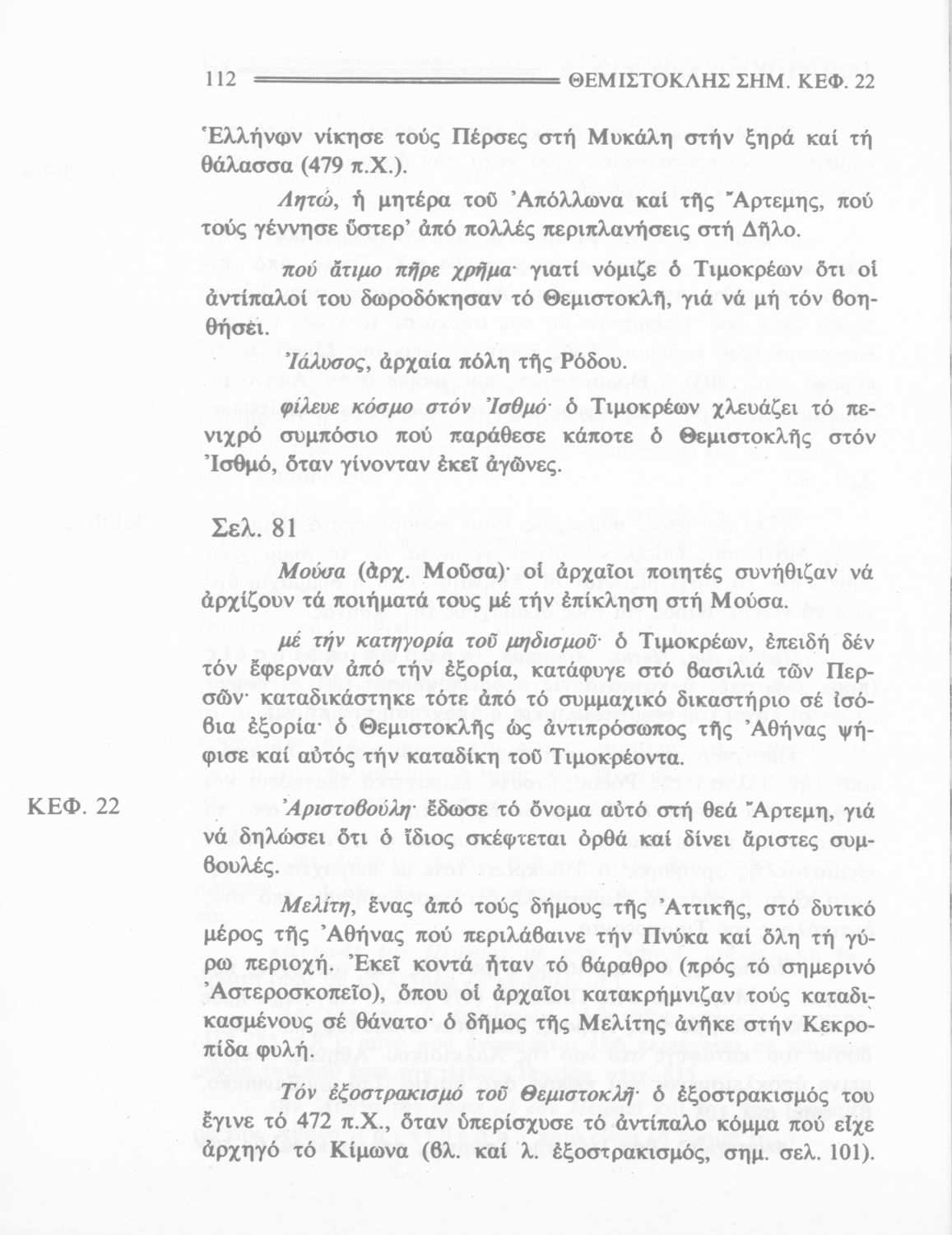 Σχολικό εγχειρίδιο Αρχαίων Ελληνικών Α΄ Γυμνασίου που περιλαμβάνει το έργο του Πλούταρχου Θεμιστοκλής, εισαγωγή στη ζωή και το έργο του, ερμηνευτικά και πραγματολογικά σχόλια, και αλφαβητικό πίνακα των ...