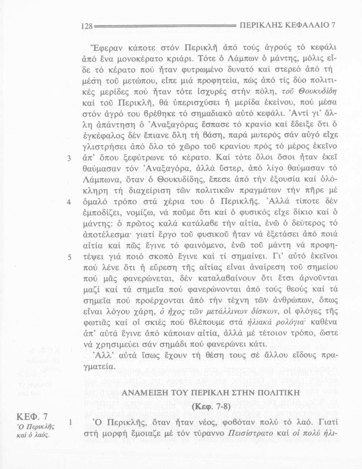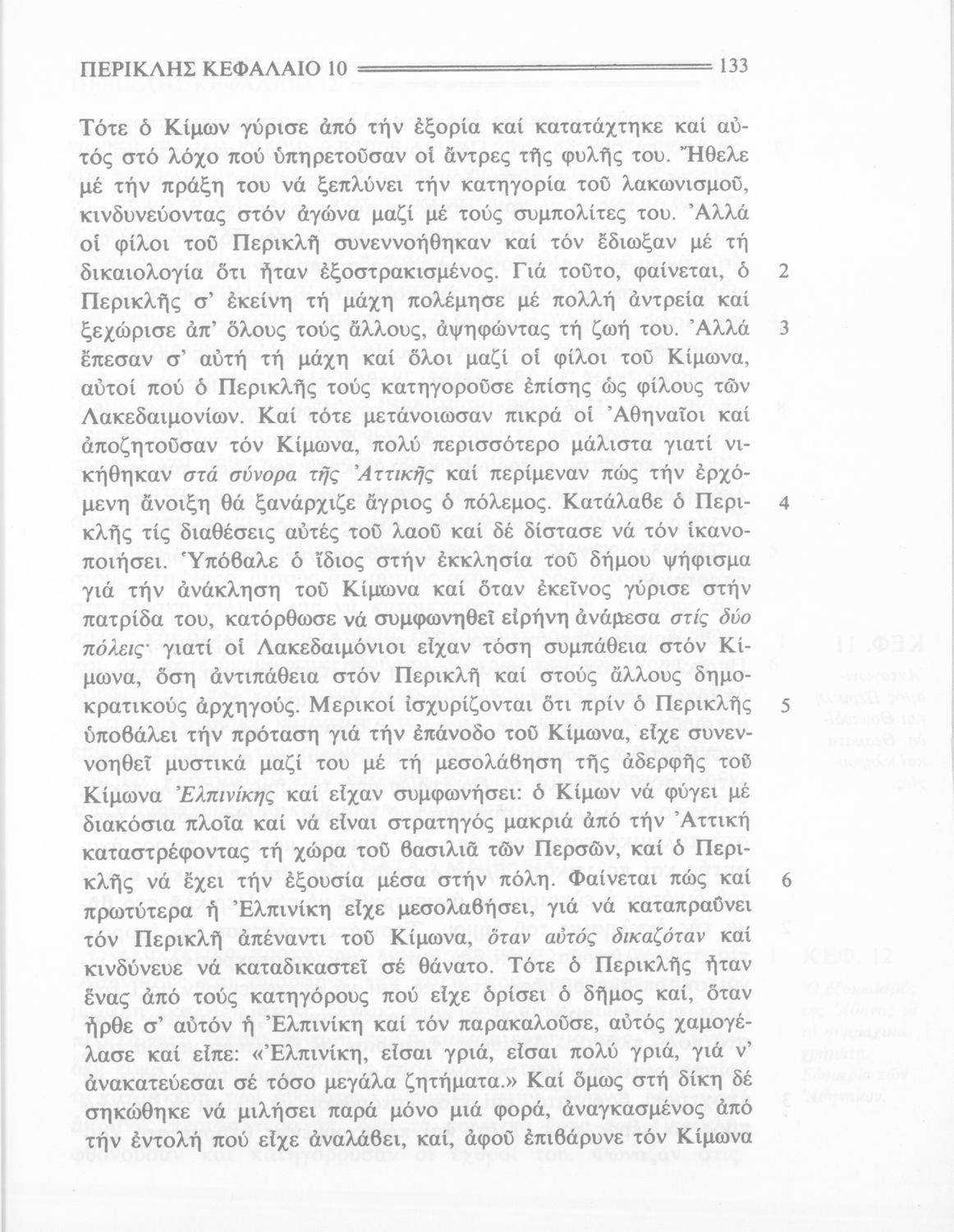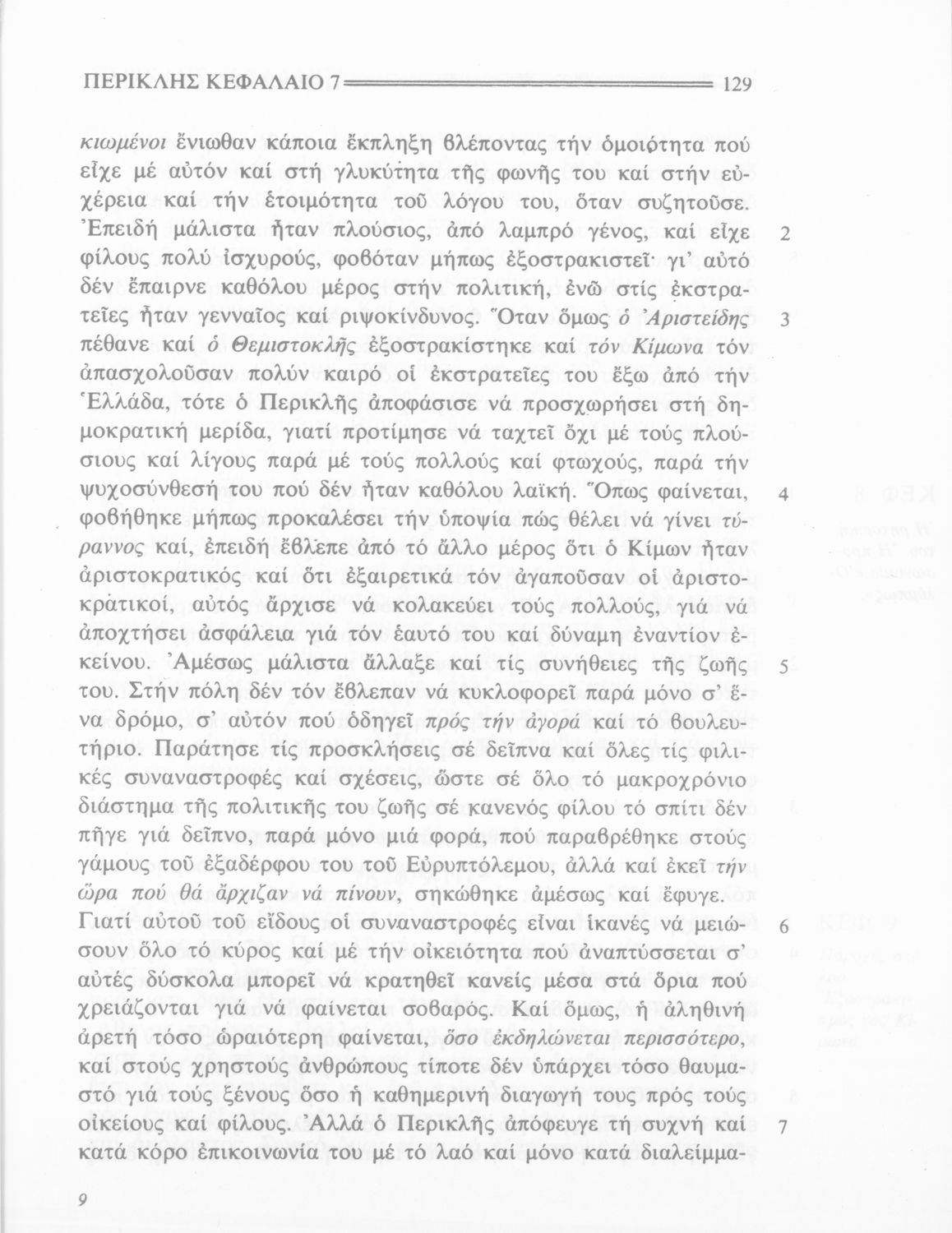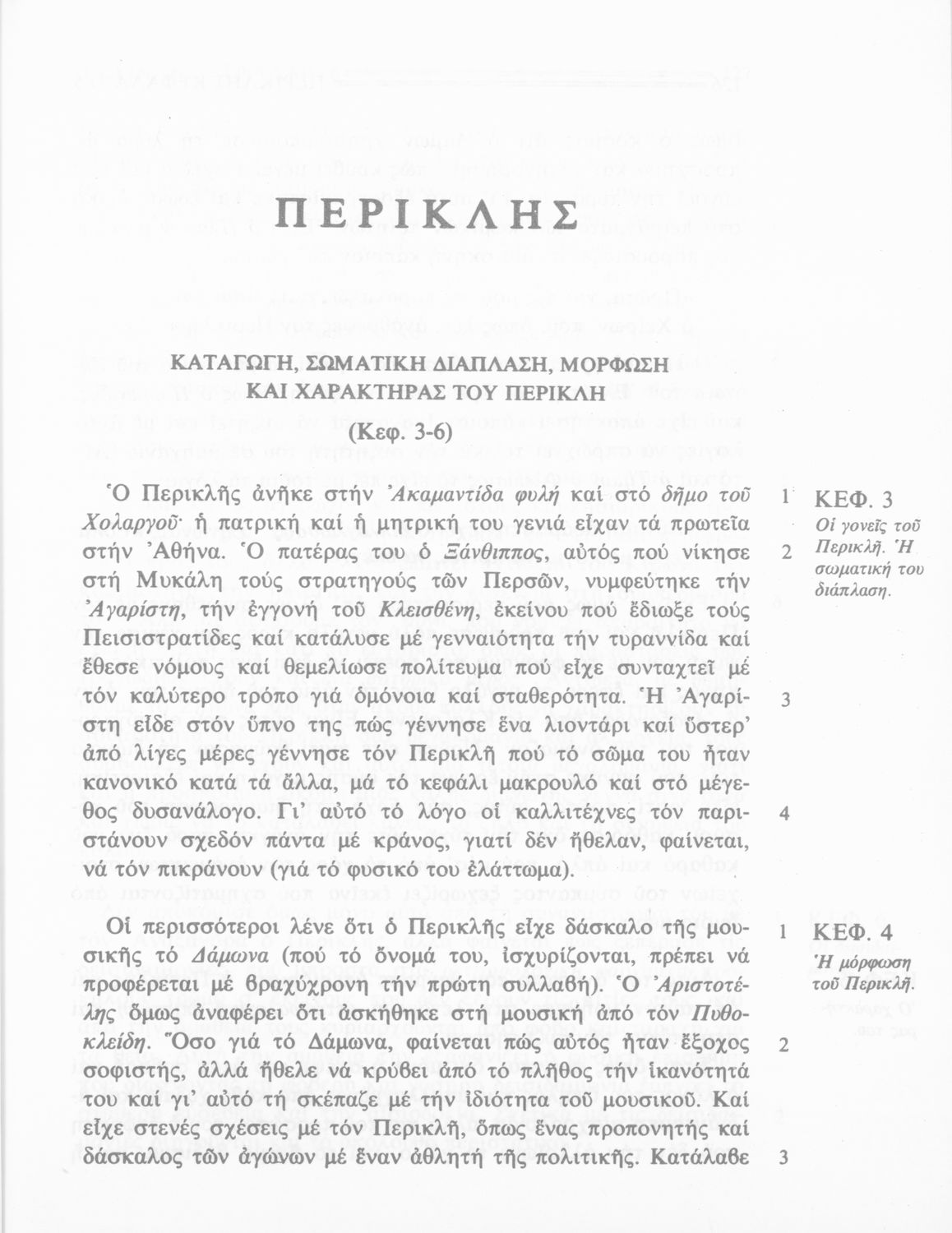 Σχολικό εγχειρίδιο Αρχαίων Ελληνικών. Αρχικά ένα εισαγωγικό σημείωμα αναφέρεται στη ζωή και το έργο του Πλουτάρχου. Ακολουθούν από το έργο του "Παράλληλοι Βίοι", σε μετάφραση, οι βιογραφίες του Σόλωνα, του Θεμιστοκλή και του Περικλή. Η κάθε βιογραφία συνοδεύεται από σημειώσεις και διανθίζεται με σχέδια, χάρτες και εικόνες.