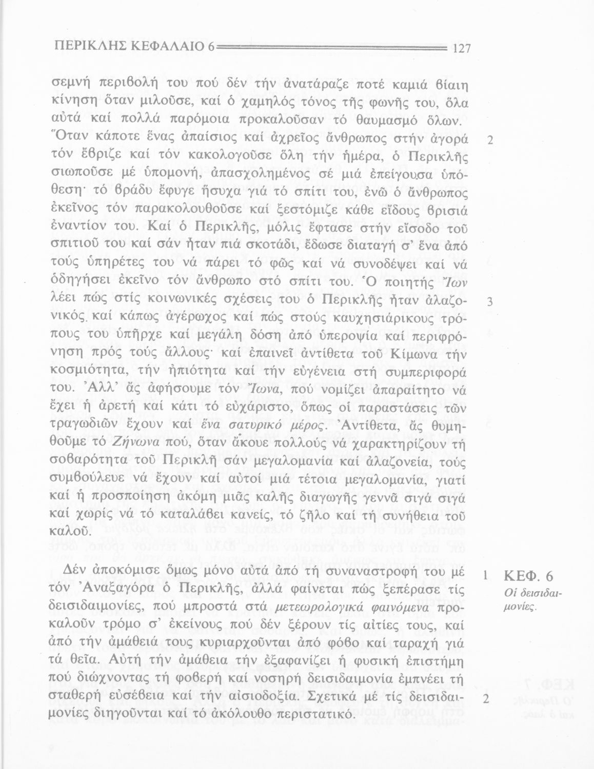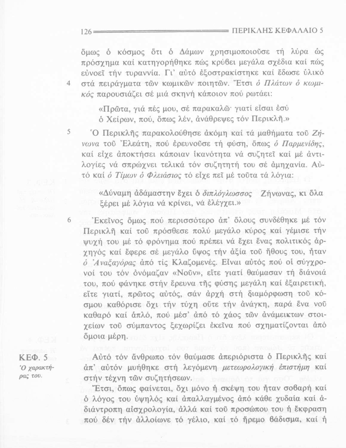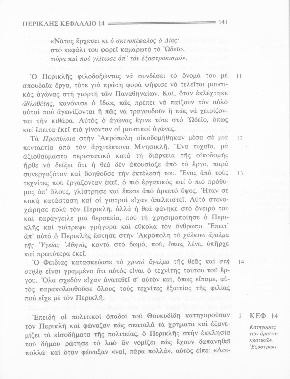 Σχολικό εγχειρίδιο Αρχαίων Ελληνικών. Αρχικά ένα εισαγωγικό σημείωμα αναφέρεται στη ζωή και το έργο του Πλουτάρχου. Ακολουθούν από το έργο του "Παράλληλοι Βίοι", σε μετάφραση, οι βιογραφίες του Σόλωνα, του Θεμιστοκλή και του Περικλή. Η κάθε βιογραφία συνοδεύεται από σημειώσεις και διανθίζεται με σχέδια, χάρτες και εικόνες.