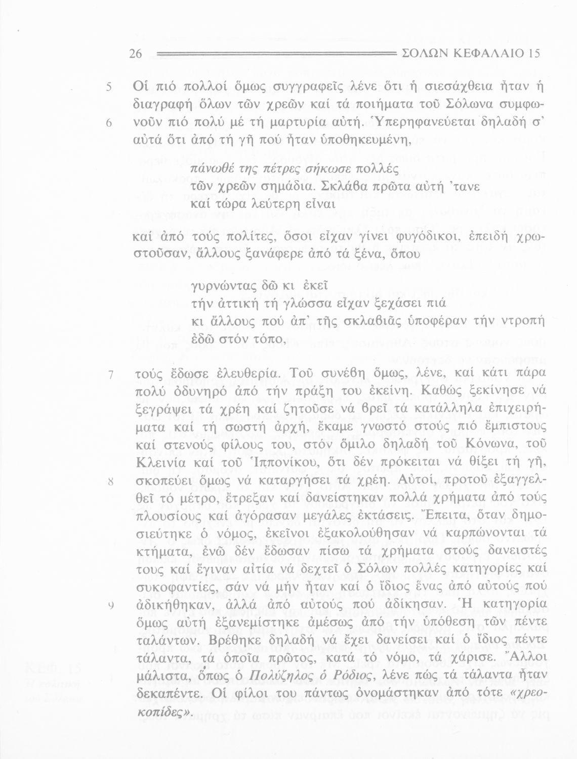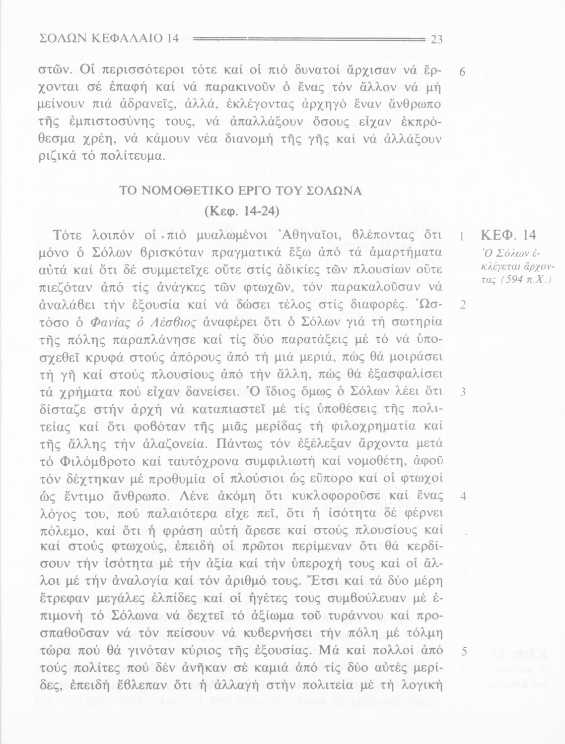 Βαθμίδα εκπαίδευσης: Δευτεροβάθμια Τάξη: Β' Γυμνασίου Μάθημα: Αρχαία Ελληνικά Γλώσσα: Δημοτική Παρουσίαση περιεχομένου: Σχολικό εγχειρίδιο Αρχαίων Ελληνικών. Αρχικά ένα εισαγωγικό σημείωμα αναφέρεται στη ζωή και το έργο του Πλουτάρχου. Ακολουθούν από το έργο του "Παράλληλοι Βίοι", σε μετάφραση, οι βιογραφίες του Σόλωνα, του Θεμιστοκλή και του Περικλή. Η κάθε βιογραφία συνοδεύεται από σημειώσεις και διανθίζεται με σχέδια, χάρτες και εικόνες. |
