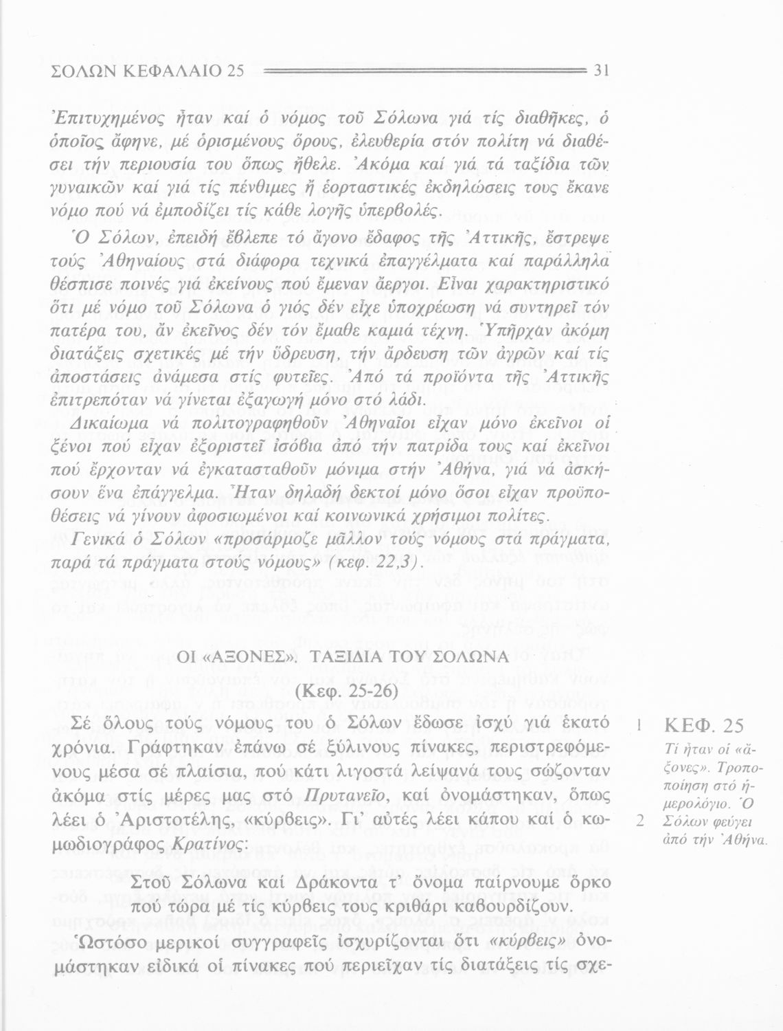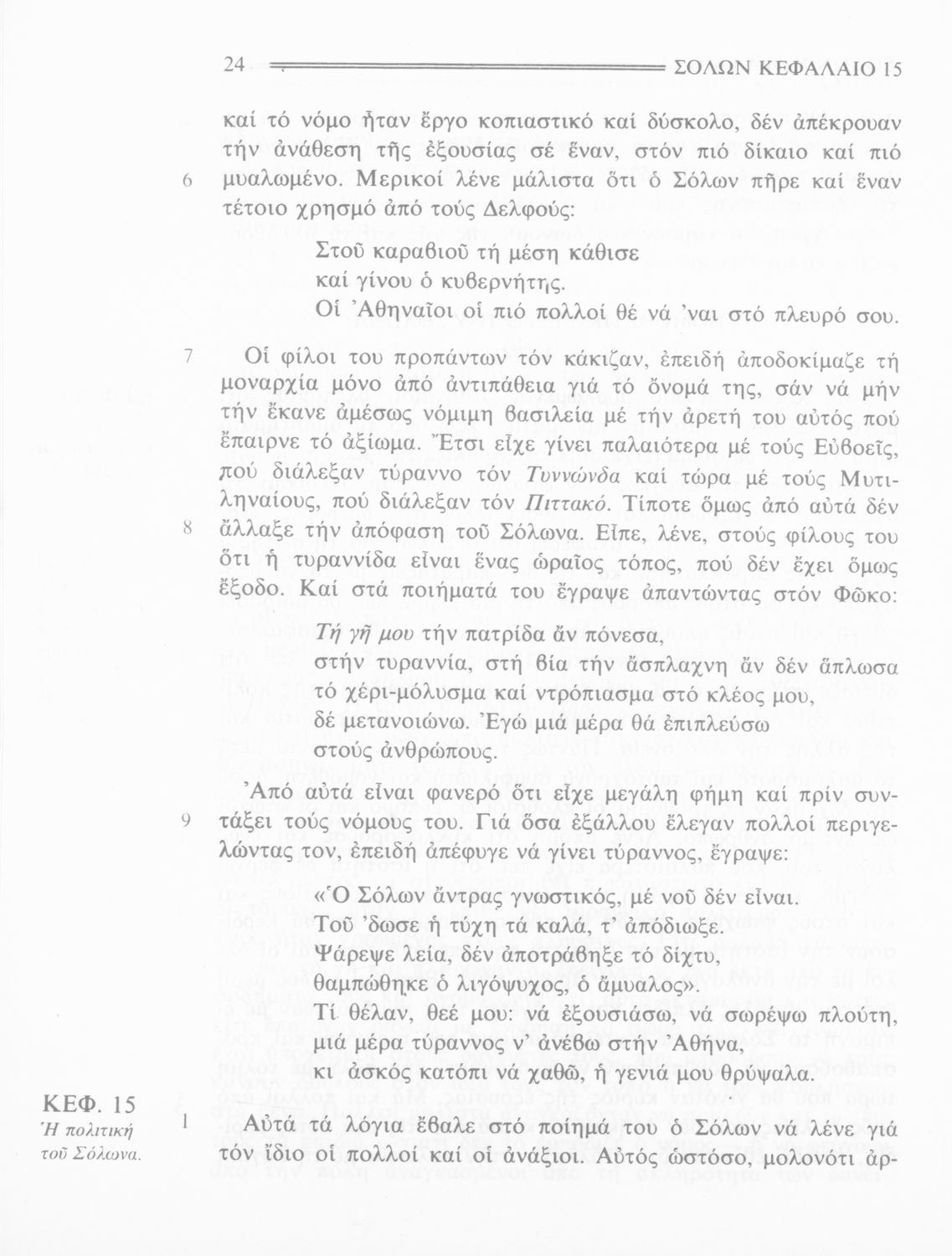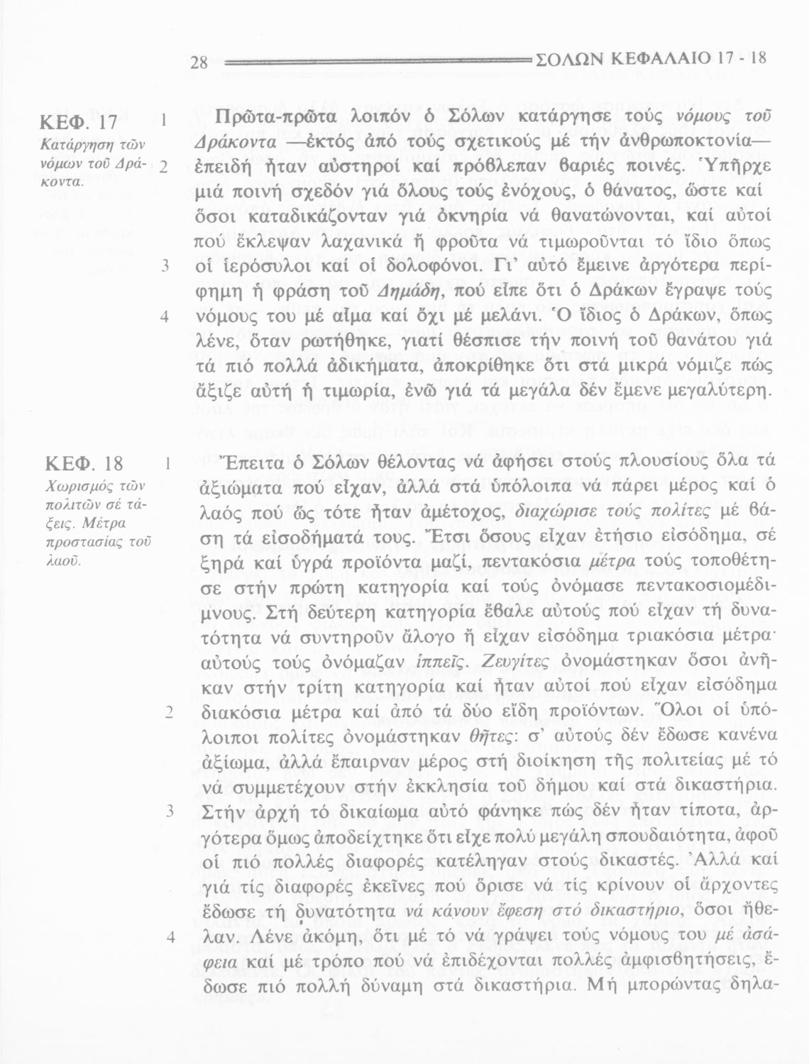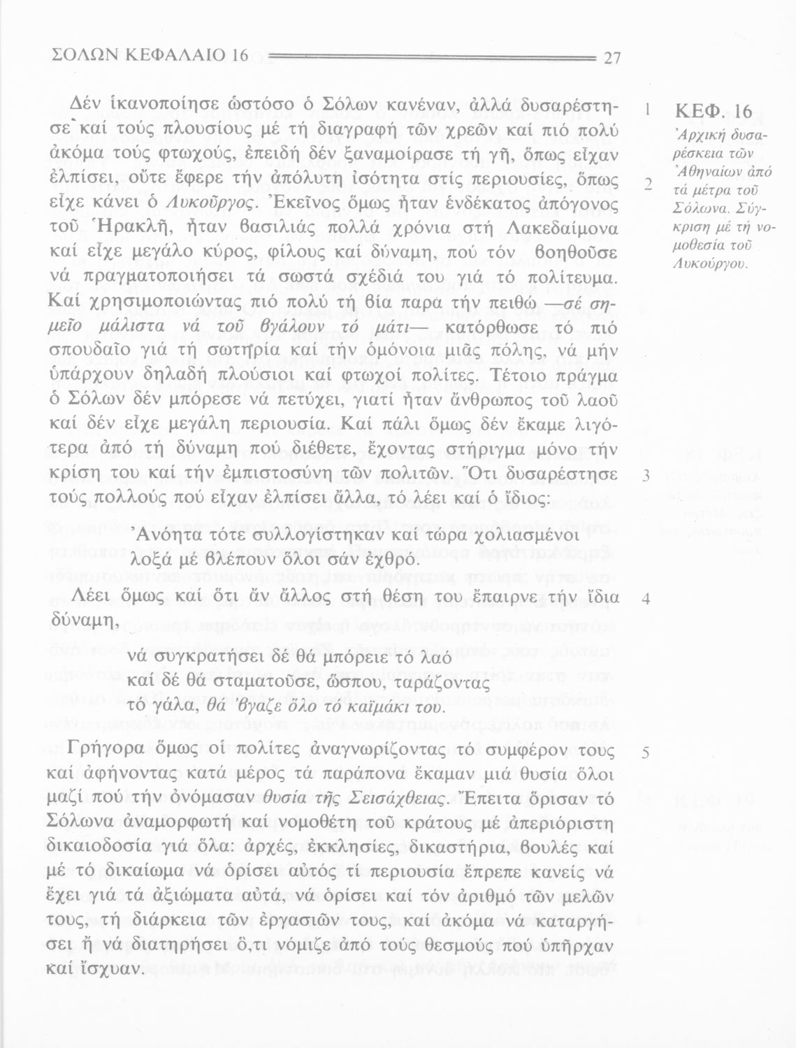 Σχολικό εγχειρίδιο Αρχαίων Ελληνικών. Αρχικά ένα εισαγωγικό σημείωμα αναφέρεται στη ζωή και το έργο του Πλουτάρχου. Ακολουθούν από το έργο του "Παράλληλοι Βίοι", σε μετάφραση, οι βιογραφίες του Σόλωνα, του Θεμιστοκλή και του Περικλή. Η κάθε βιογραφία συνοδεύεται από σημειώσεις και διανθίζεται με σχέδια, χάρτες και εικόνες.