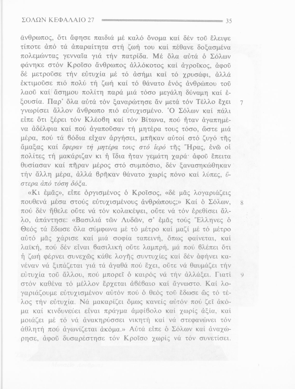 LDR 01688 2200229 4500 035 ## _a01-17823 040 ## _aΙνστιτούτο Εκπαιδευτικής Πολιτικής 041 ## _ael 100 ## _aΠλούταρχος _aΜιχ. Χ. Οικονόμου _aΒασ. Η. Τσακατίκας (εισαγωγή _aμετάφραση _aσημειώσεις) 110 ## _a17823 245 0# _aΠλουτάρχου Σόλων, Θεμιστοκλής, Περικλής Β΄ Γυμνασίου 250 ## _a1η Έκδοση 260 ## _aΑθήνα _bΟργανισμός Εκδόσεως Διδακτικών Βιβλίων _c1977 300 ## _a184 _bΣχέδια και εικόνες (ασπρόμαυρα) _c20 520 ## _aΣχολικό εγχειρίδιο Αρχαίων Ελληνικών. Αρχικά ένα εισαγωγικό σημείωμα αναφέρεται στη ζωή και το έργο του Πλουτάρχου. Ακολουθούν από το έργο του "Παράλληλοι Βίοι", σε μετάφραση, οι βιογραφίες του Σόλωνα, του Θεμιστοκλή και του Περικλή. Η κάθε βιογραφία συνοδεύεται από σημειώσεις και διανθίζεται με σχέδια, χάρτες και εικόνες. 521 ## _aΒ' Γυμνασίου 522 ## _aΕλλάδα 546 ## _aΔημοτική 563 ## _aΜαλακό Εξώφυλλο 583 ## _a2904/12-8-1977 _c1977 650 #4 _aΆξονες _aΕξοστρακισμός _aΚίμωνας _aΚροίσος _aΝόμοι _aΞέρξης _aΠεισίστρατος _aΣαλαμίνα 700 ## _aΛουΐζα Μοντεσάντου