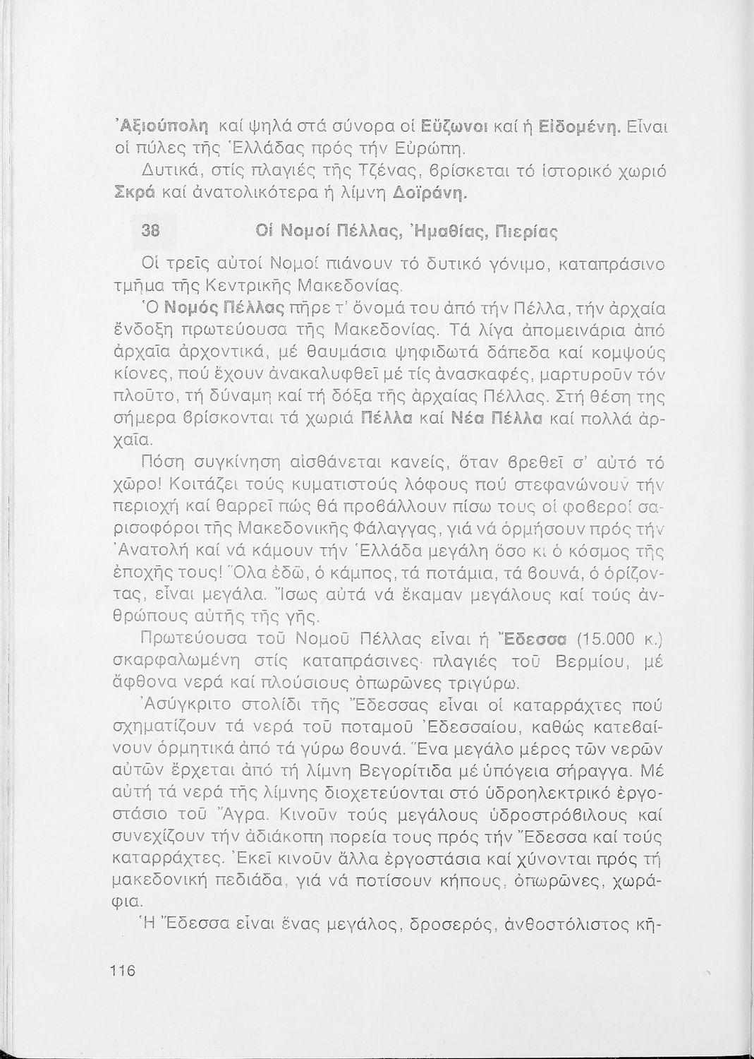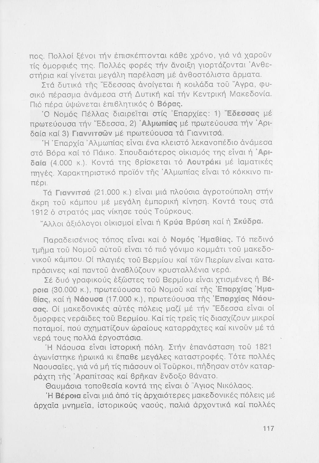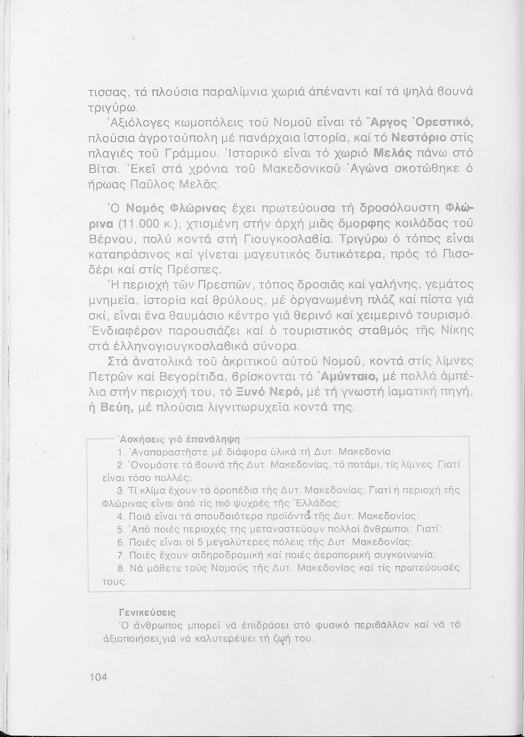 Σχολικό εγχειρίδιο Γεωγραφίας για τη Γ΄, Δ΄ Δημοτικού. Μελετά την Ελλάδα ανά γεωγραφικό νομό με πληροφορίες από το χάρτη της περιοχής και στοιχεία της ιστορίας και της οικονομικής ζωής.