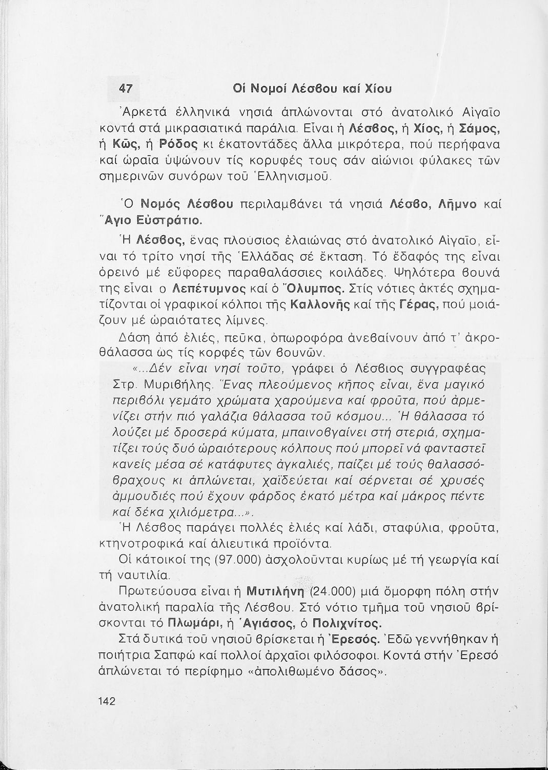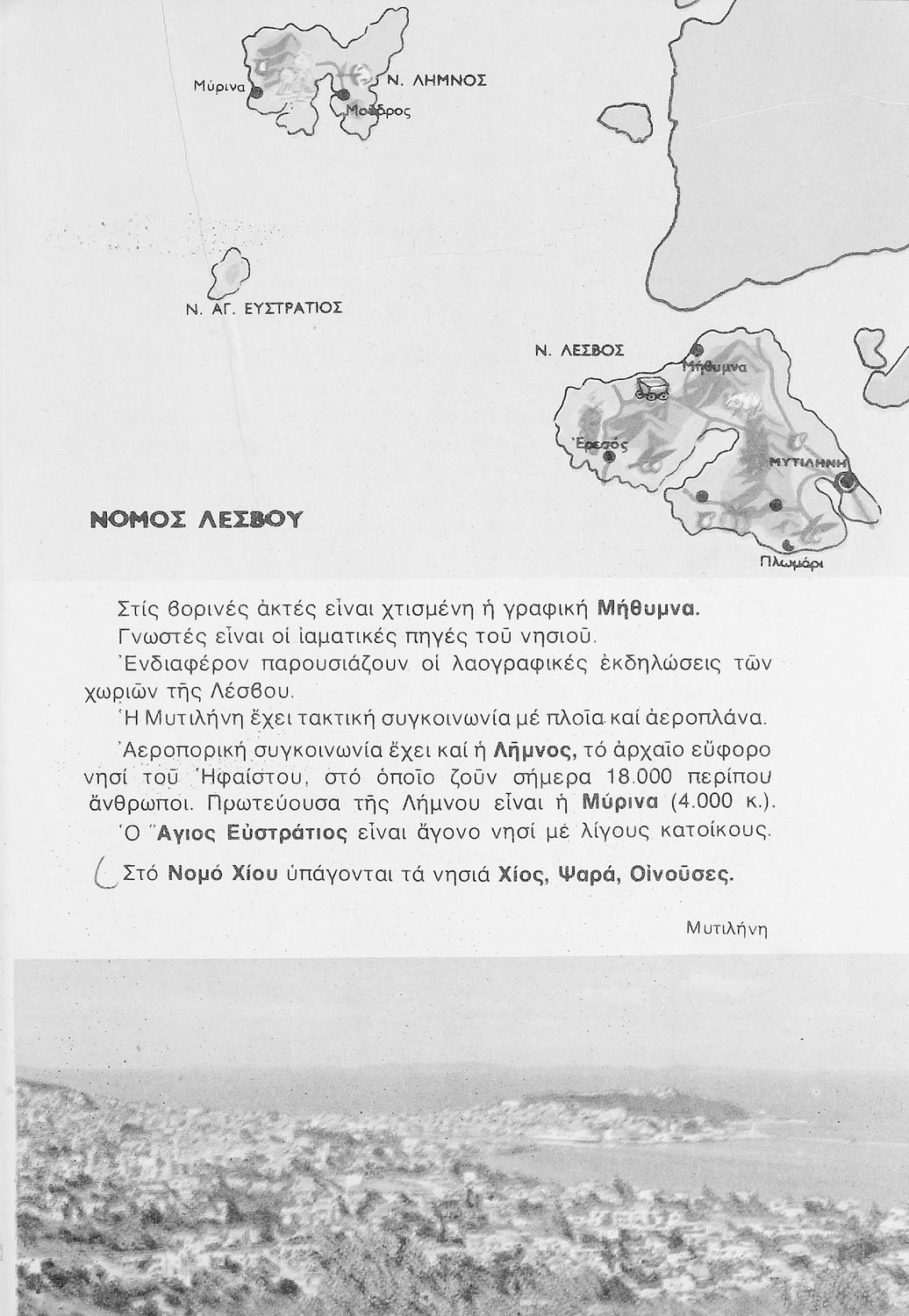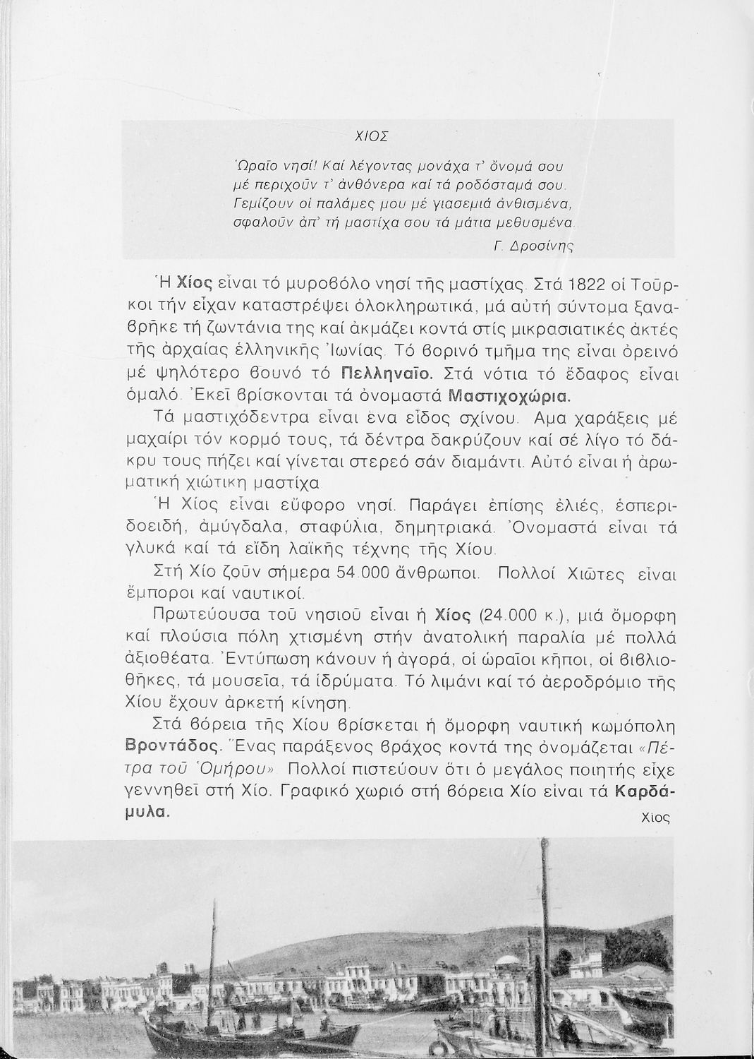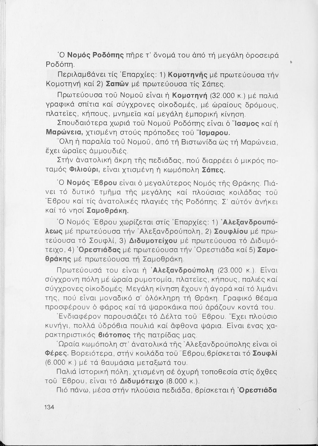 Σχολικό εγχειρίδιο Γεωγραφίας για τη Γ΄, Δ΄ Δημοτικού. Μελετά την Ελλάδα ανά γεωγραφικό νομό με πληροφορίες από το χάρτη της περιοχής και στοιχεία της ιστορίας και της οικονομικής ζωής.
