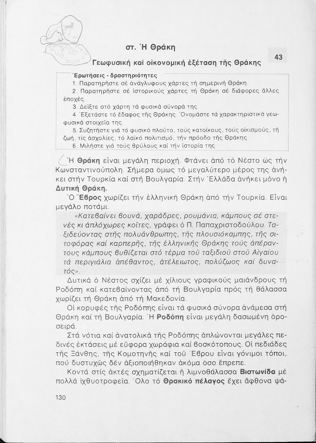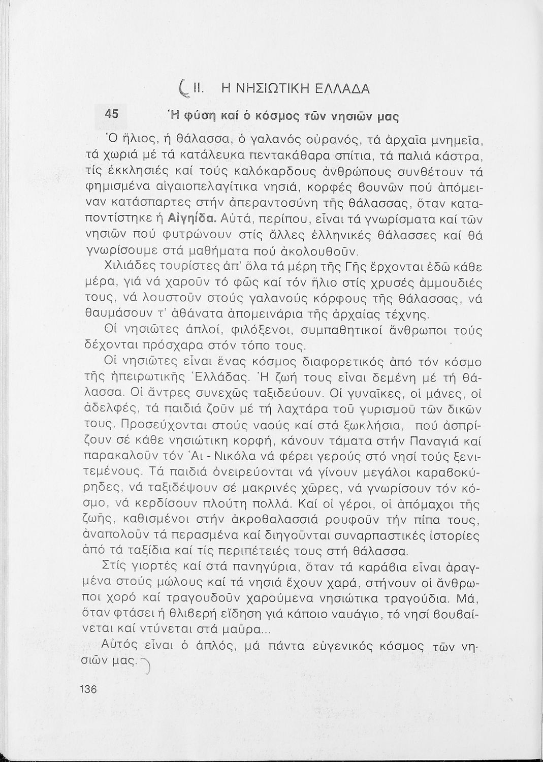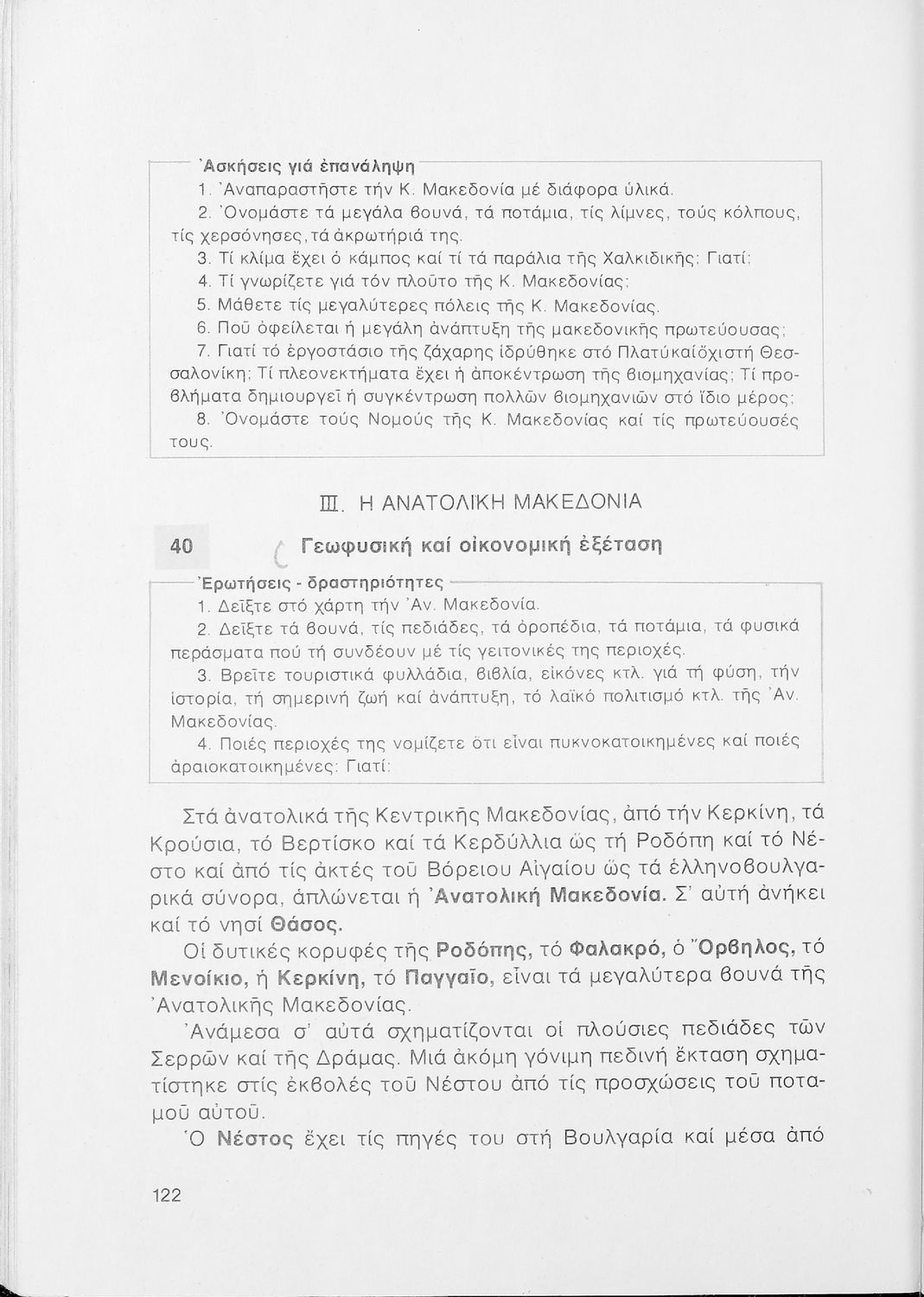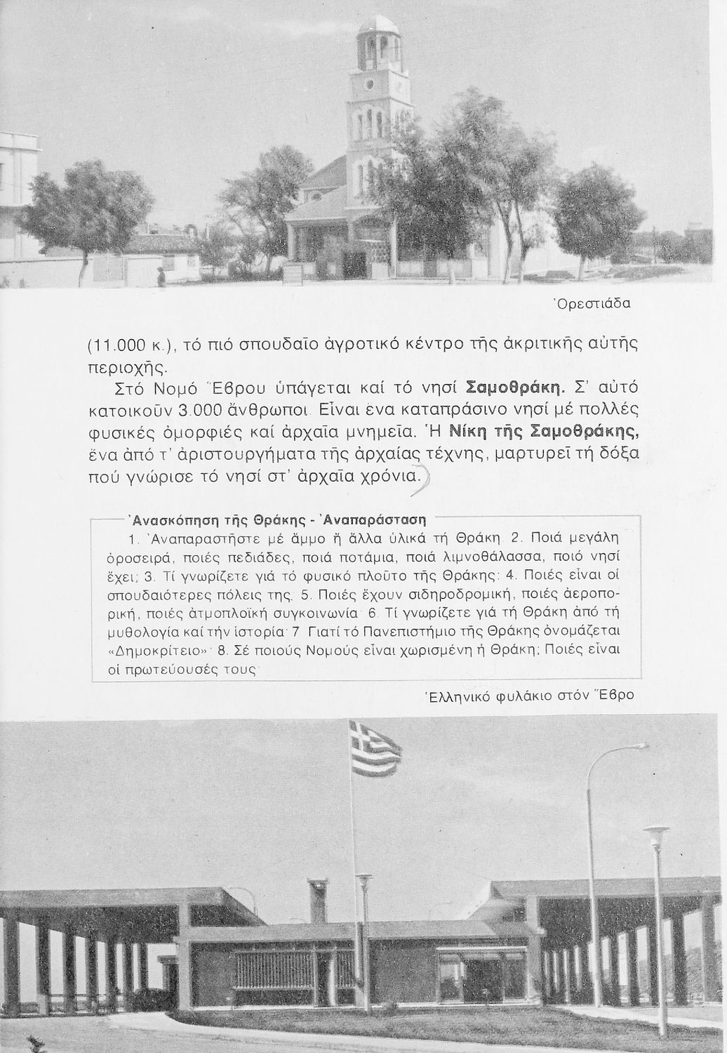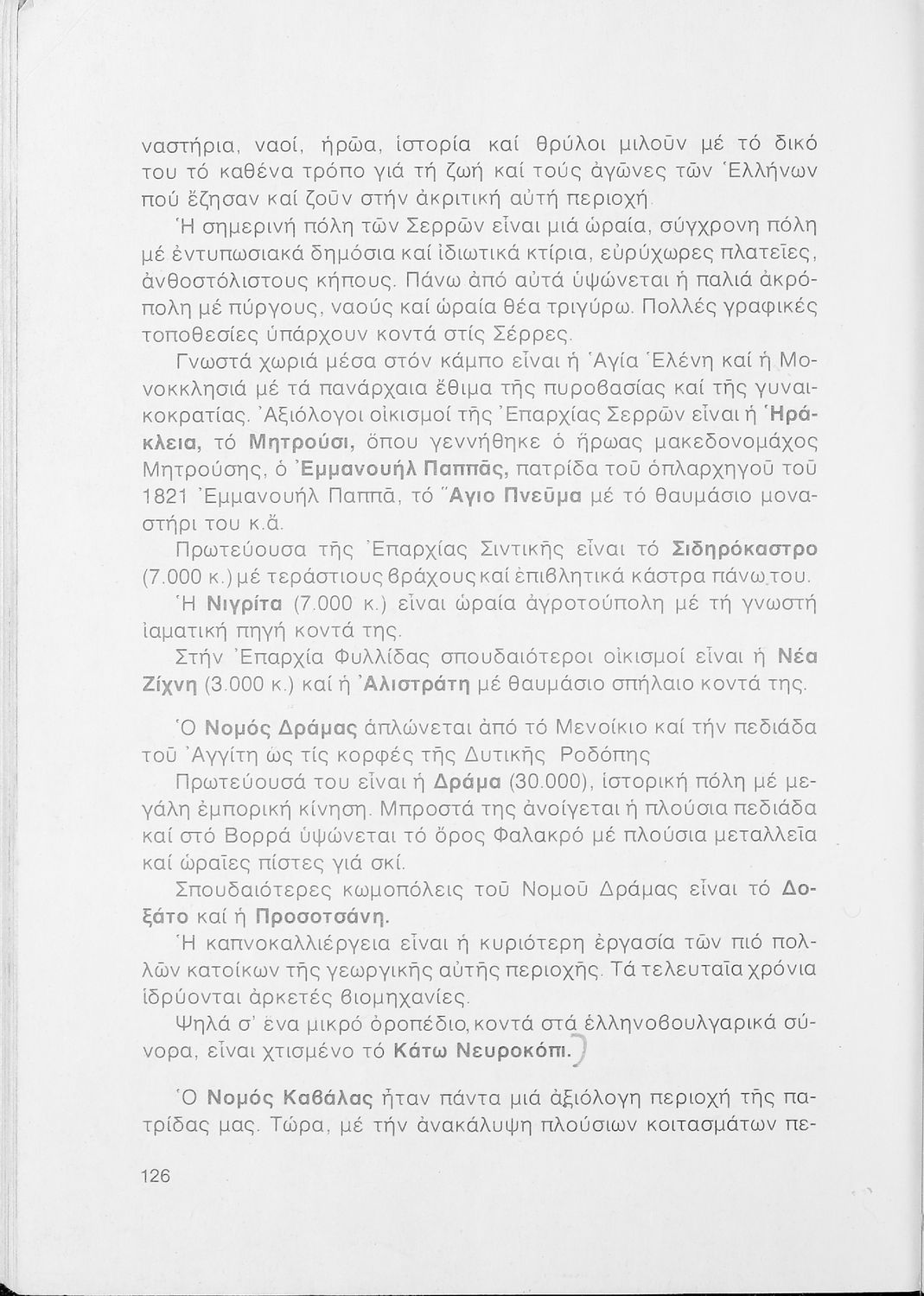 Σχολικό εγχειρίδιο Γεωγραφίας για τη Γ΄, Δ΄ Δημοτικού. Μελετά την Ελλάδα ανά γεωγραφικό νομό με πληροφορίες από το χάρτη της περιοχής και στοιχεία της ιστορίας και της οικονομικής ζωής.