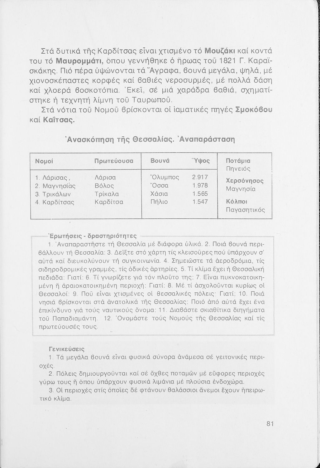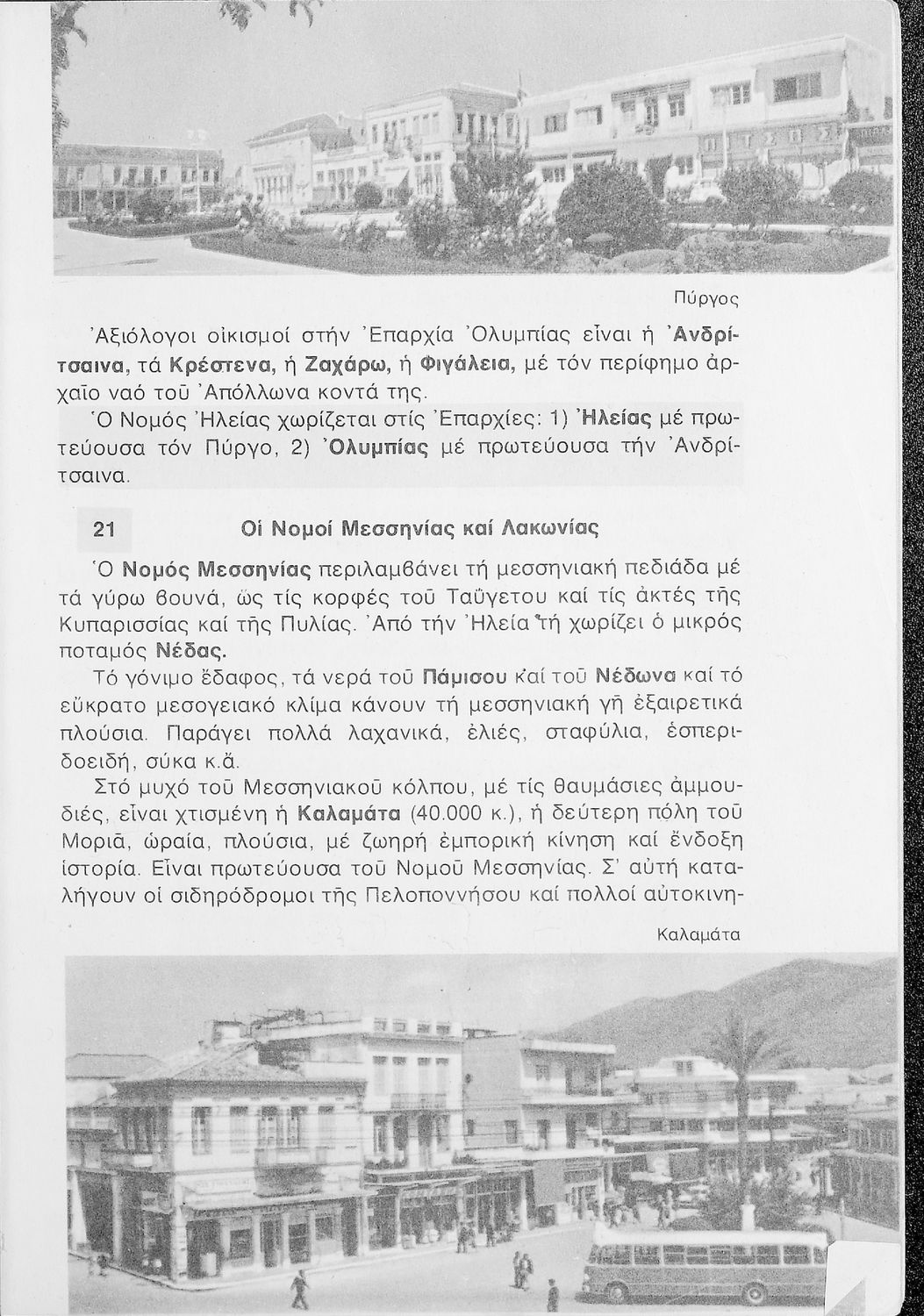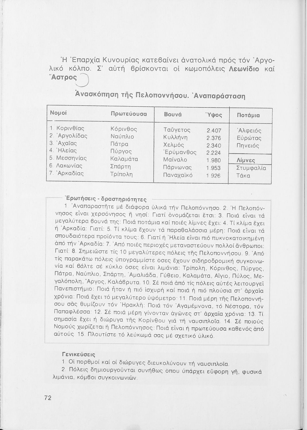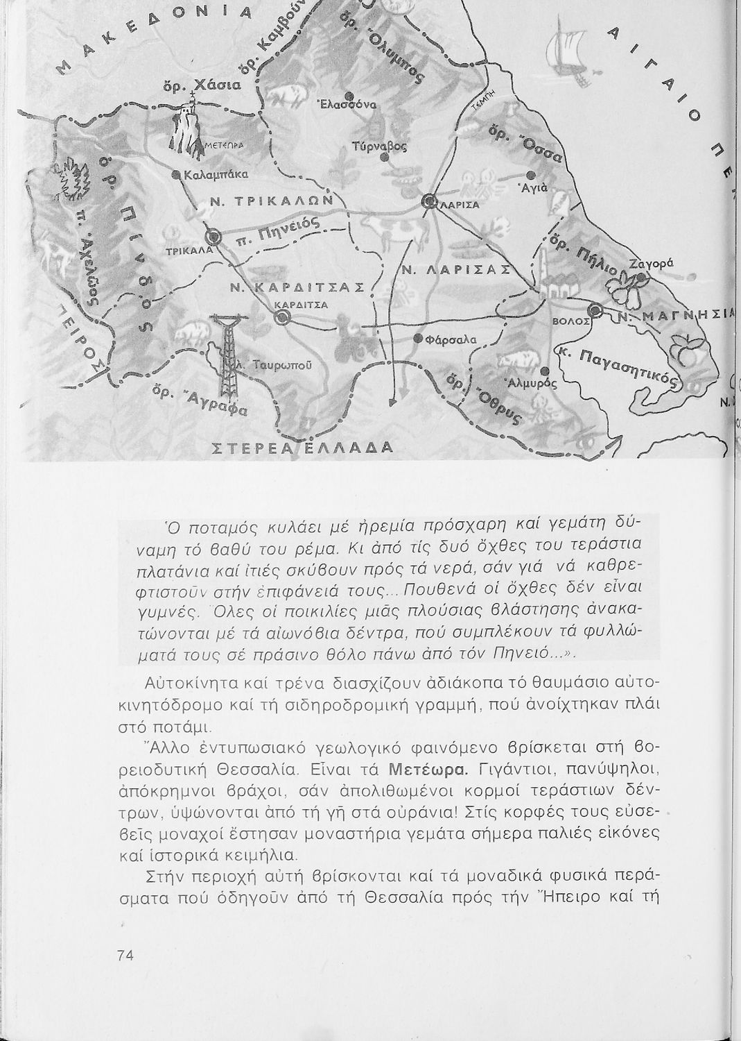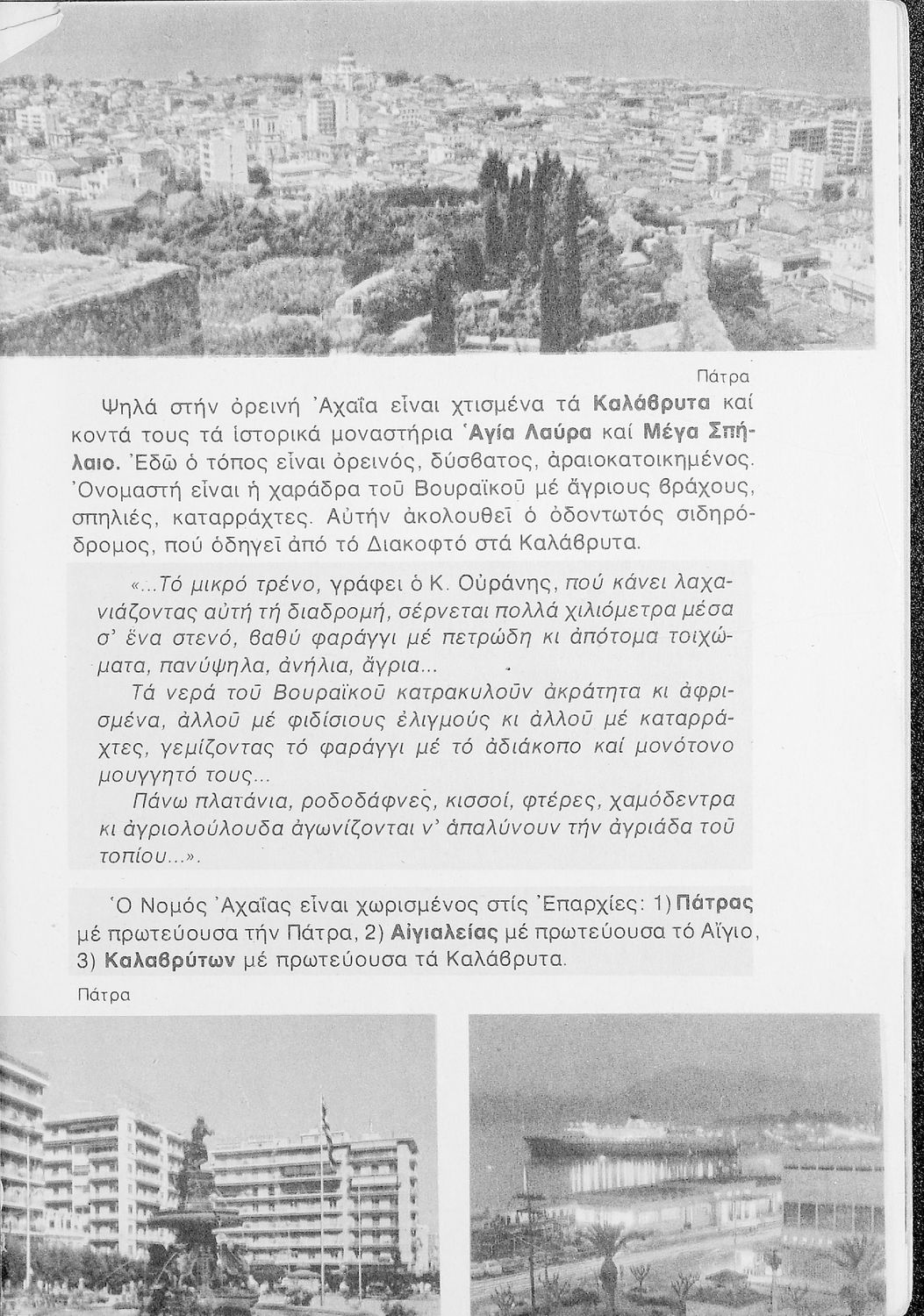 Σχολικό εγχειρίδιο Γεωγραφίας για τη Γ΄, Δ΄ Δημοτικού. Μελετά την Ελλάδα ανά γεωγραφικό νομό με πληροφορίες από το χάρτη της περιοχής και στοιχεία της ιστορίας και της οικονομικής ζωής.