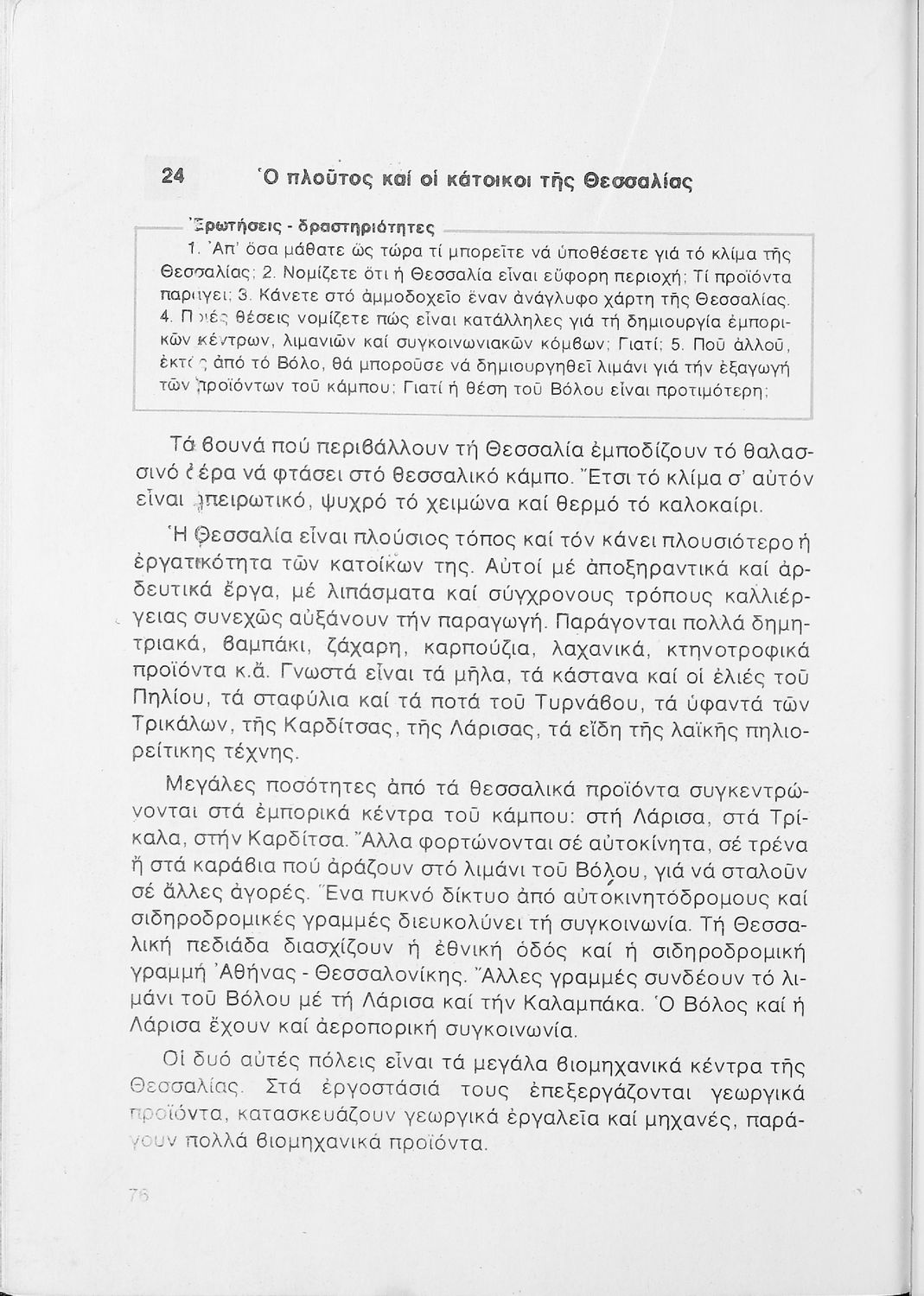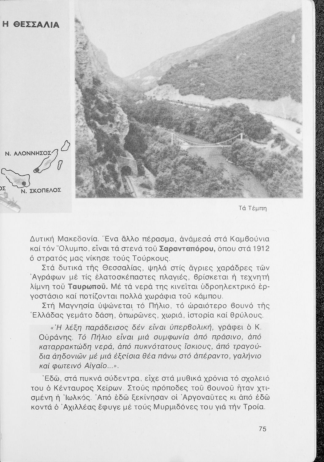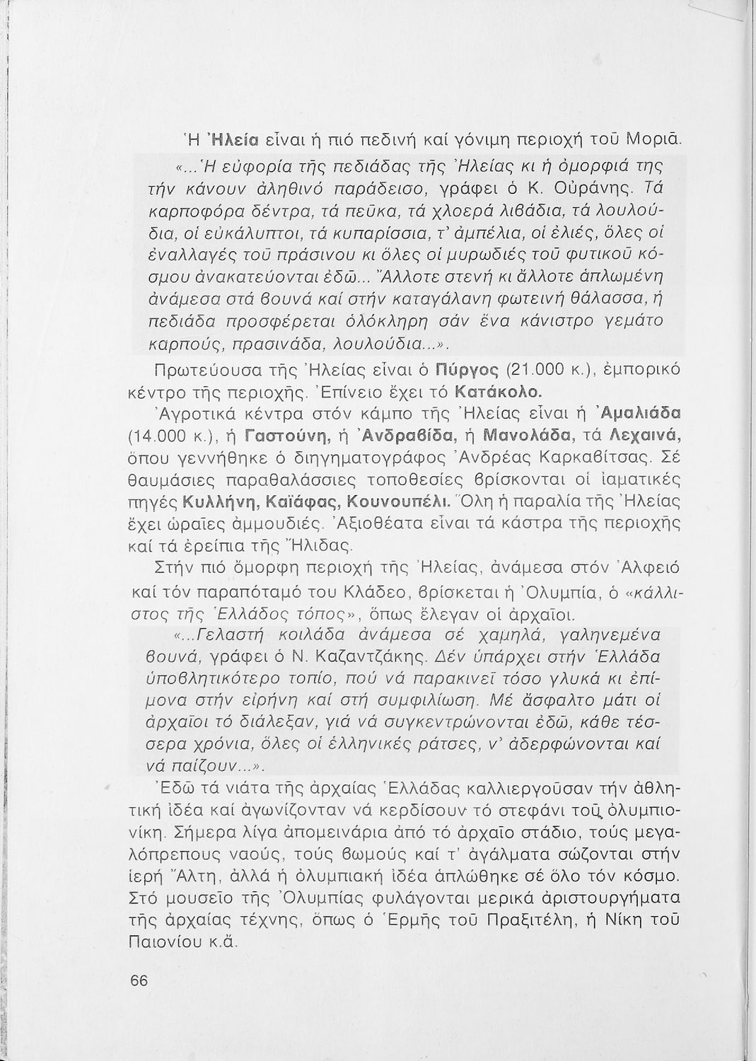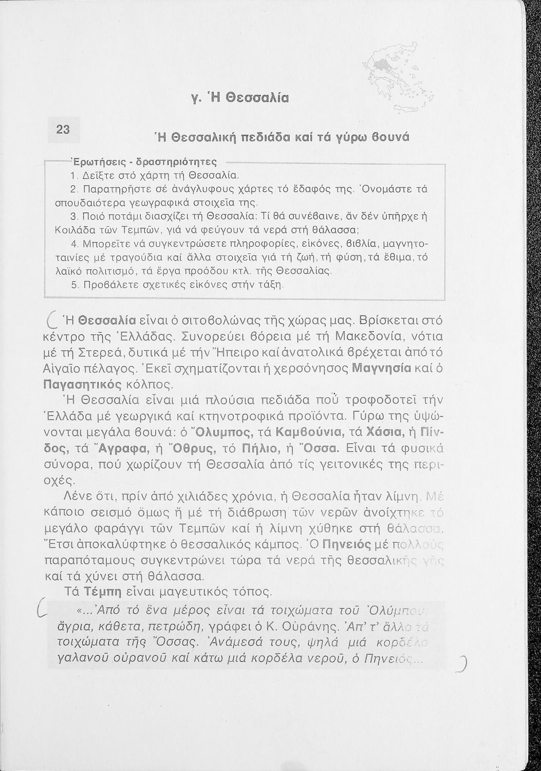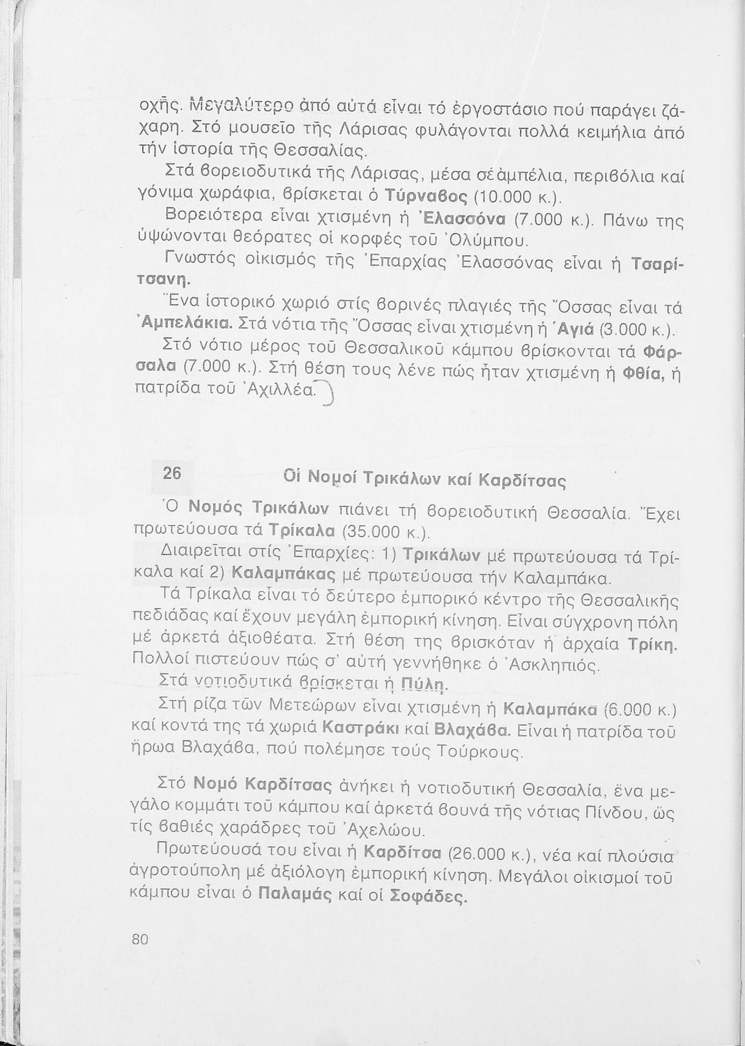 Σχολικό εγχειρίδιο Γεωγραφίας για τη Γ΄, Δ΄ Δημοτικού. Μελετά την Ελλάδα ανά γεωγραφικό νομό με πληροφορίες από το χάρτη της περιοχής και στοιχεία της ιστορίας και της οικονομικής ζωής.