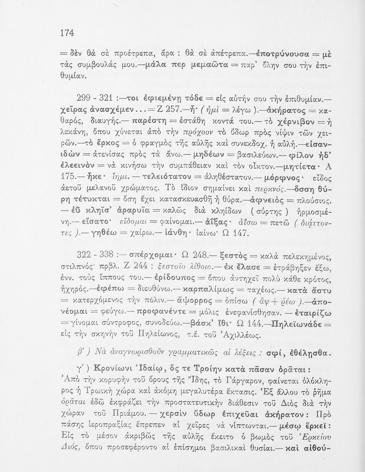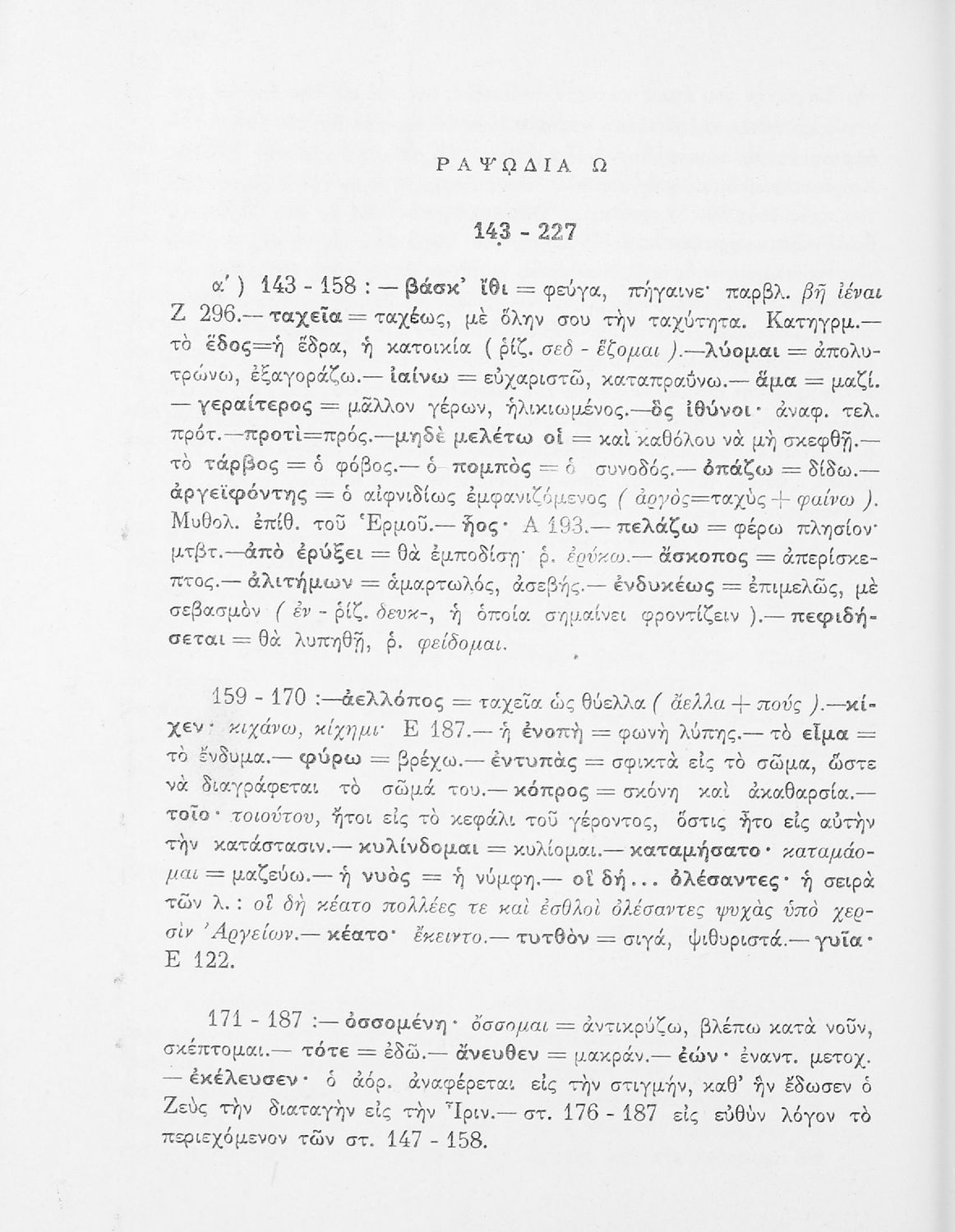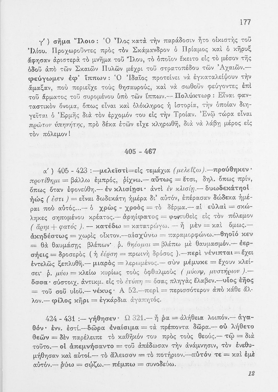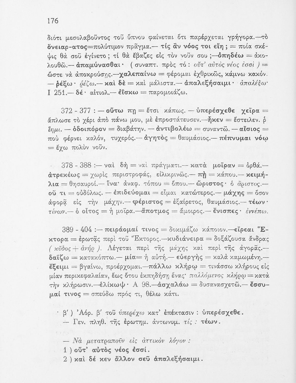 Μαθητικό βοήθημα του Ελληνικού Σχολείου, των Παρθεναγωγείων και του Γυμνασίου για το μάθημα των Αρχαίων Ελληνικών. Περιέχει τις ραψωδίες Ο, Π, Ρ, Σ, Τ, Χ, ψ, Ω από το πρωτότυπο με σχόλια και ερμηνευτικές ...