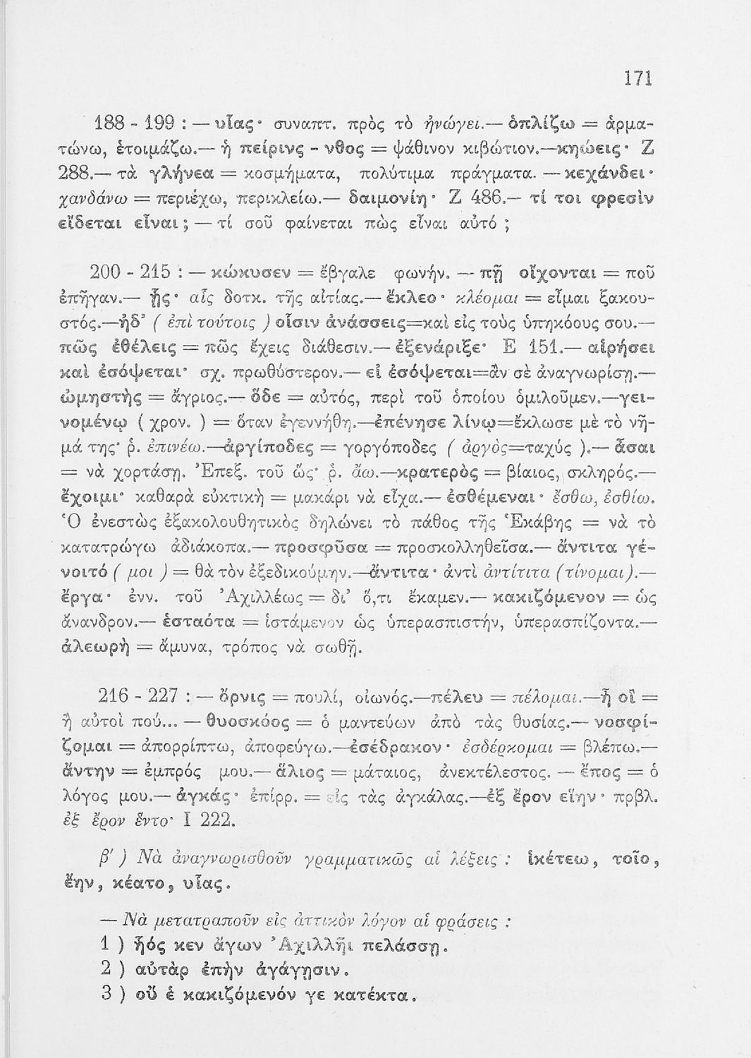 Σχολικό εγχειρίδιο της Δευτεροβάθμιας Εκπαίδευσης για το μάθημα των Αρχαίων Ελληνικών. Πρόκειται για το κείμενο της Ιλιάδας μεταφρασμένο, με ερμηνευτικές και πραγματολογικές παρατηρήσεις. Στο τέλος περιλαμβάνει λεξιλόγιο.