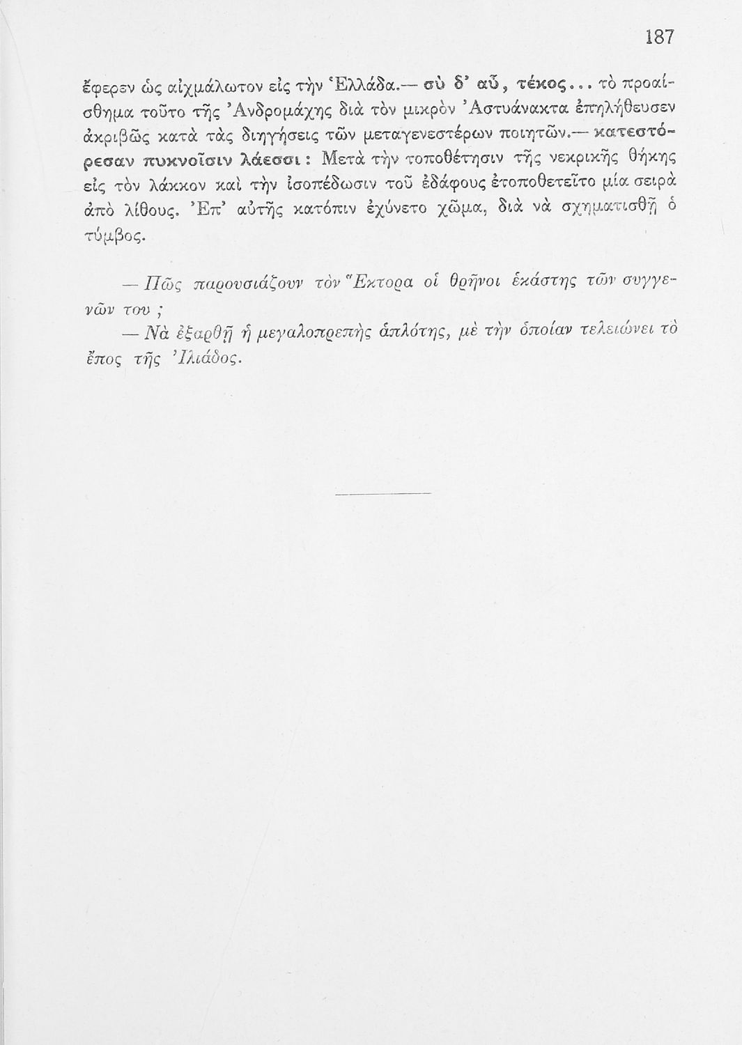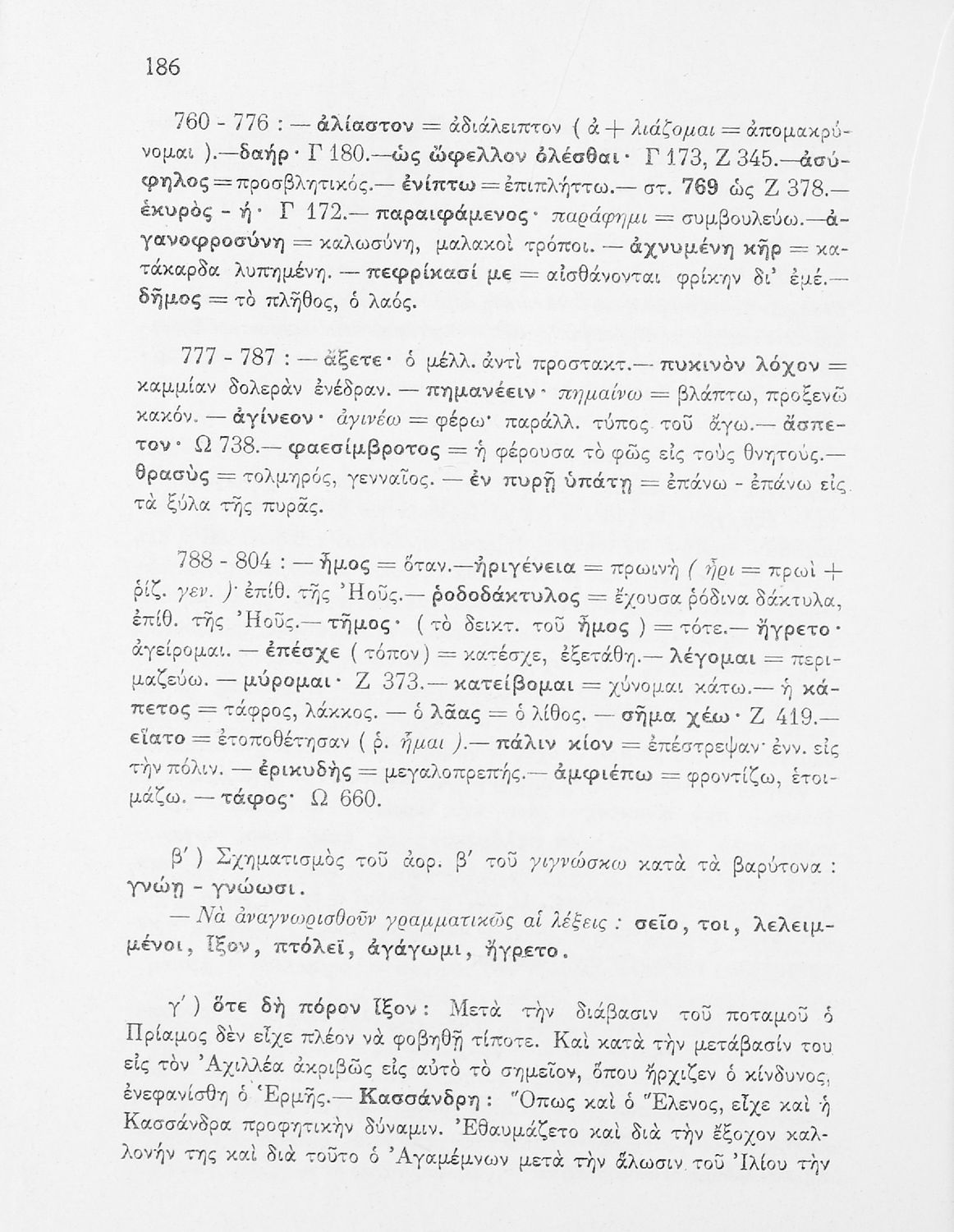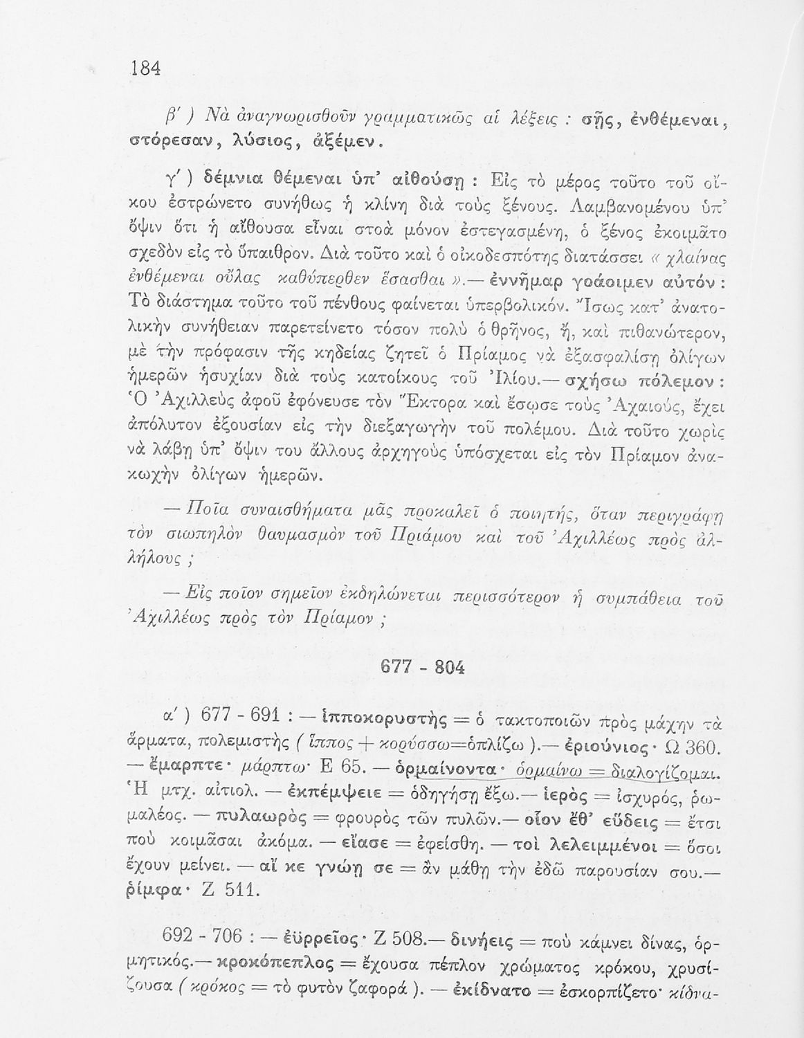 Μαθητικό βοήθημα του Ελληνικού Σχολείου, των Παρθεναγωγείων και του Γυμνασίου για το μάθημα των Αρχαίων Ελληνικών. Περιέχει τις ραψωδίες Ο, Π, Ρ, Σ, Τ, Χ, ψ, Ω από το πρωτότυπο με σχόλια και ερμηνευτικές ...
