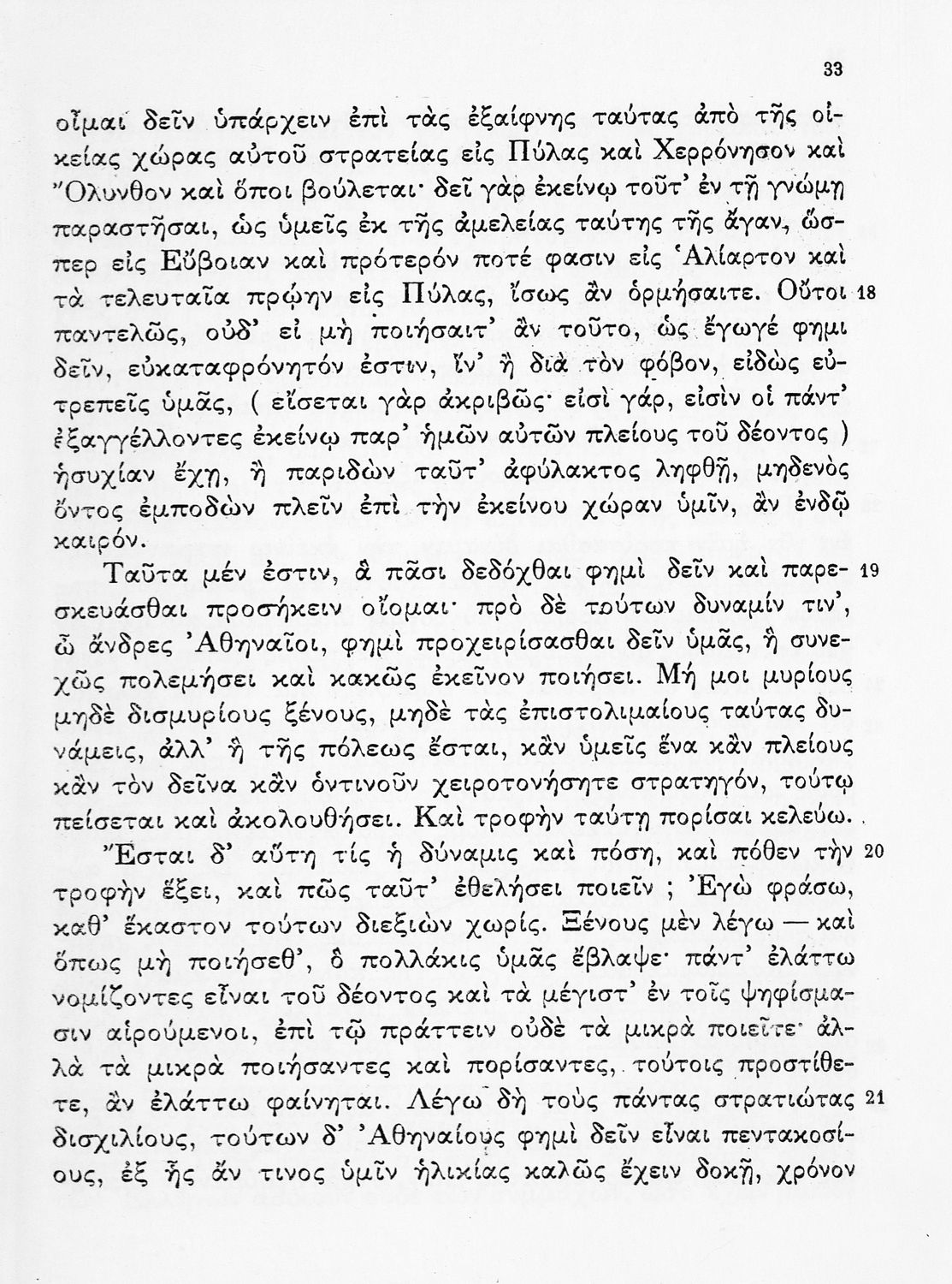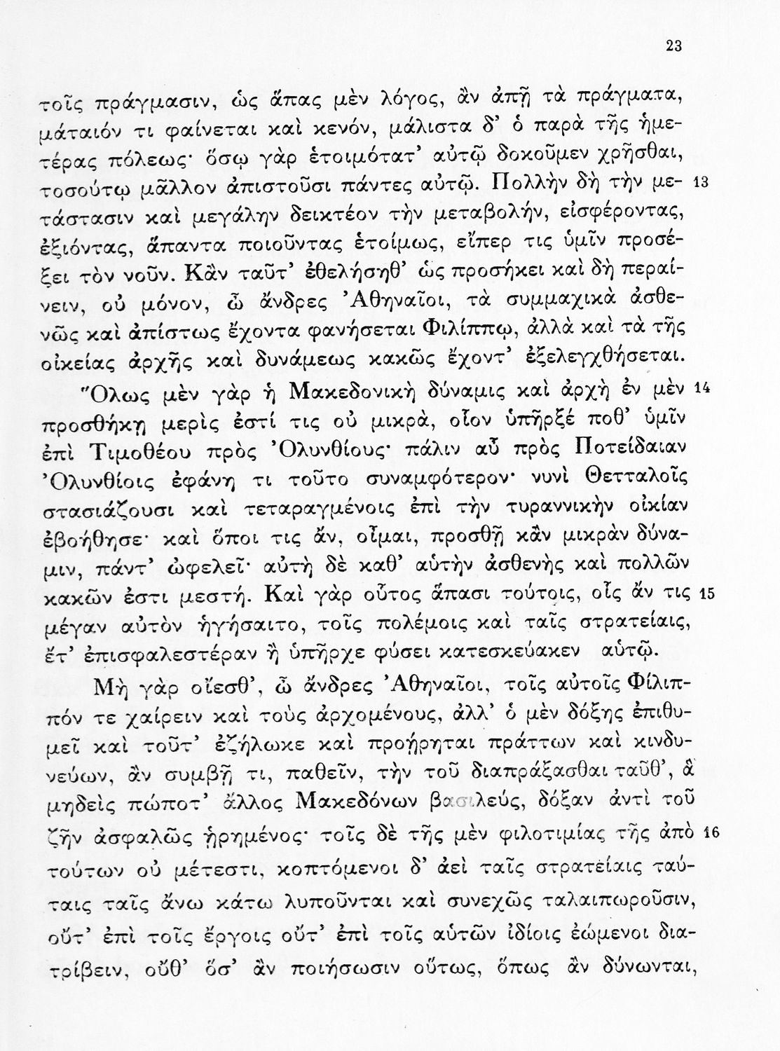 Σχολικό εγχειρίδιο Αρχαίων Ελληνικών Γυμνασίου που περιλαμβάνει τους Ολυνθιακούς Α΄ και Β΄ και τους Φιλιππικούς Α΄ και Β' του Δημοσθένη, εισαγωγή και ερμηνευτικά σχόλια.