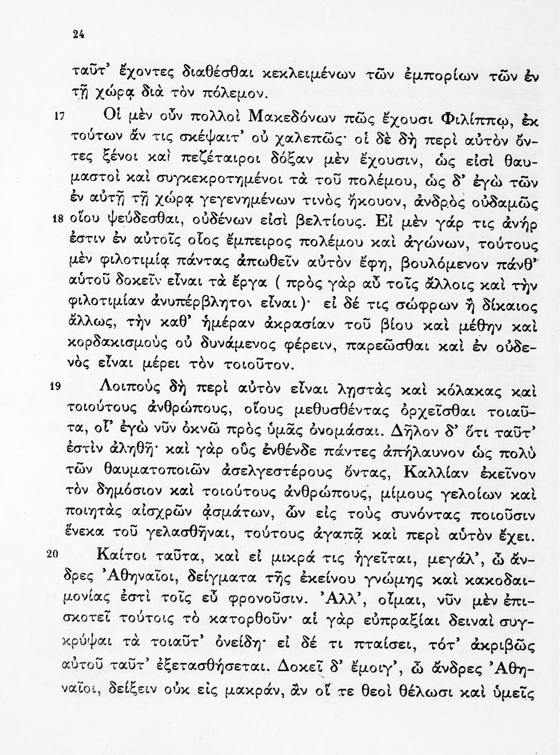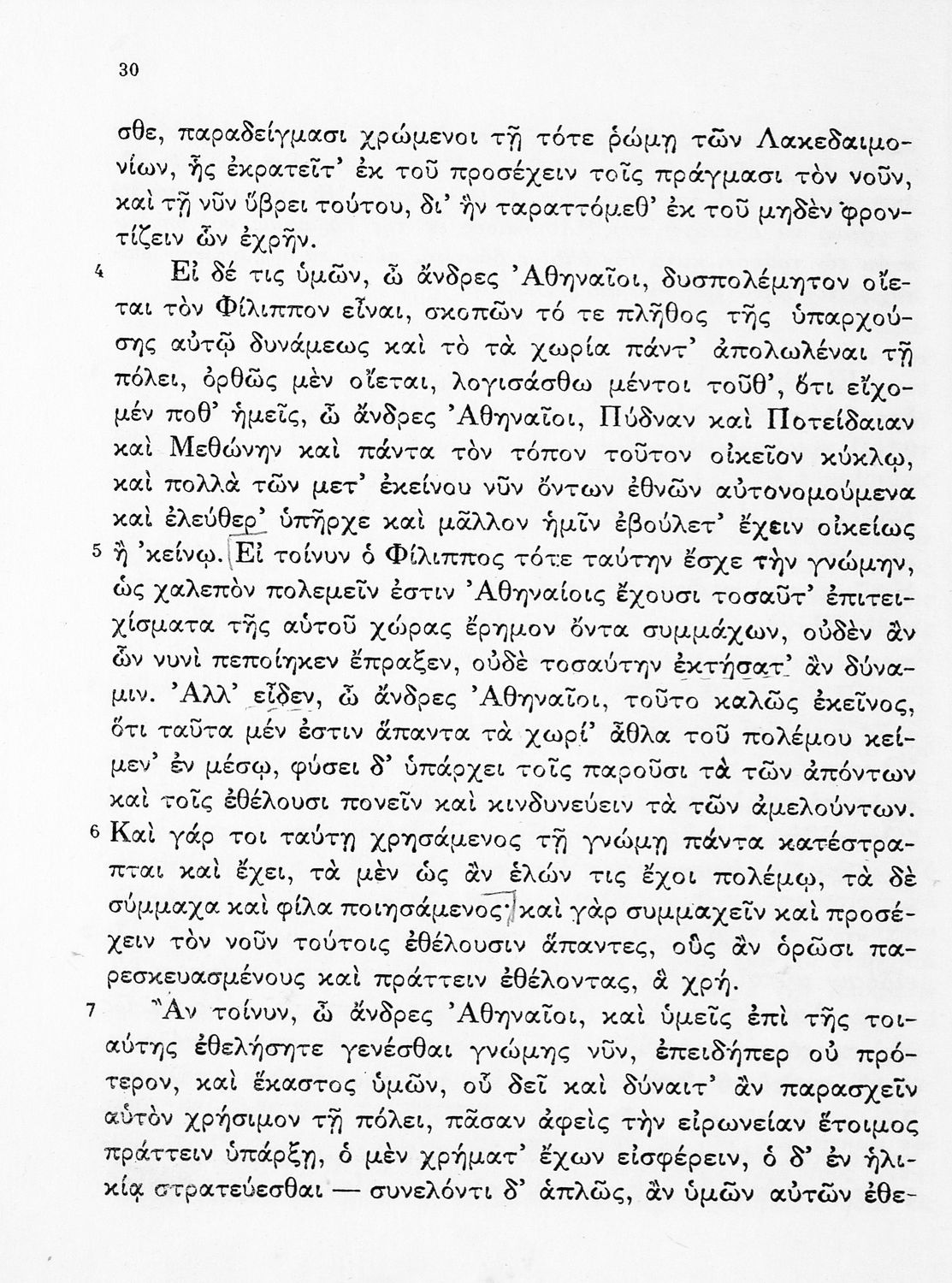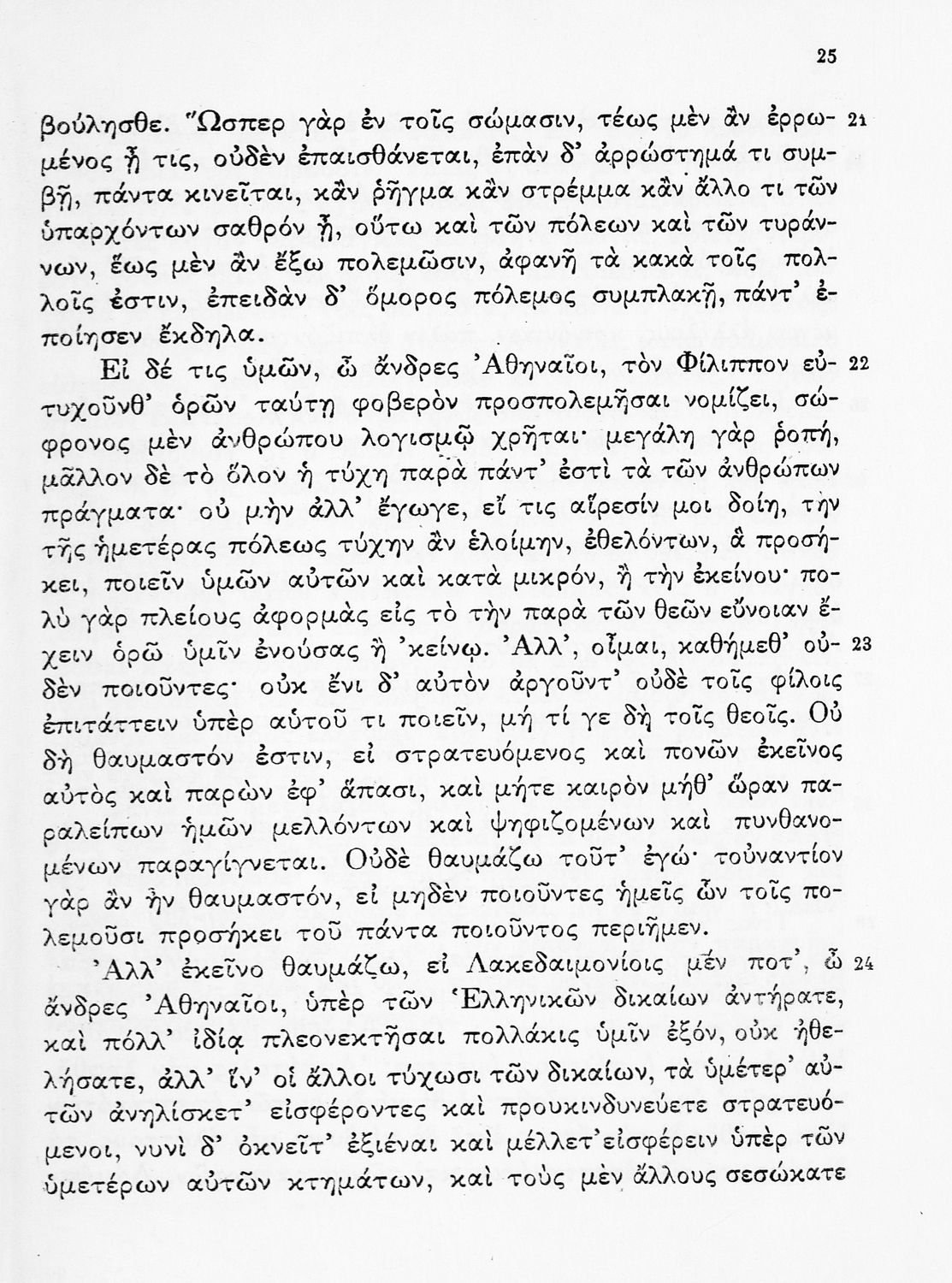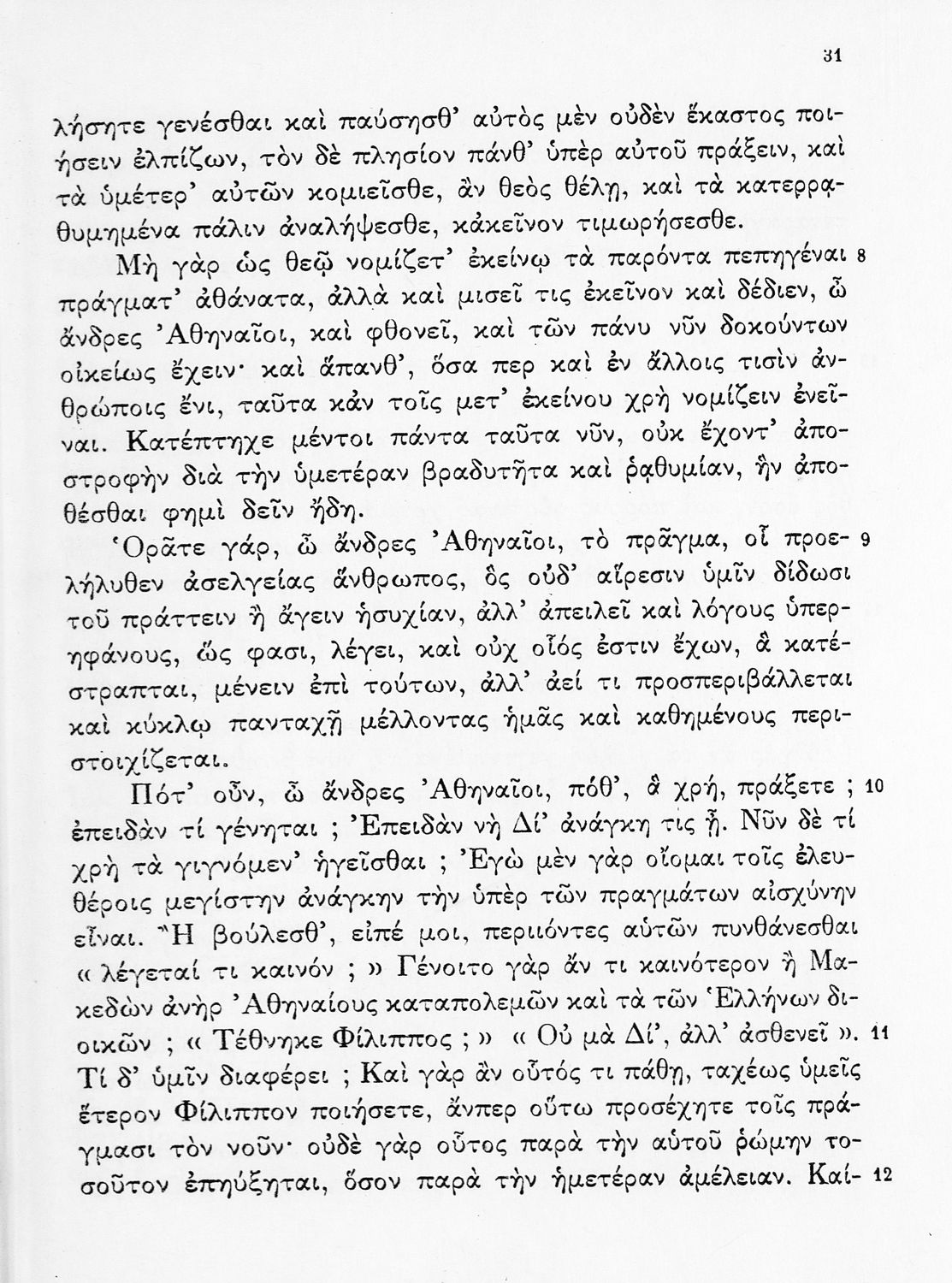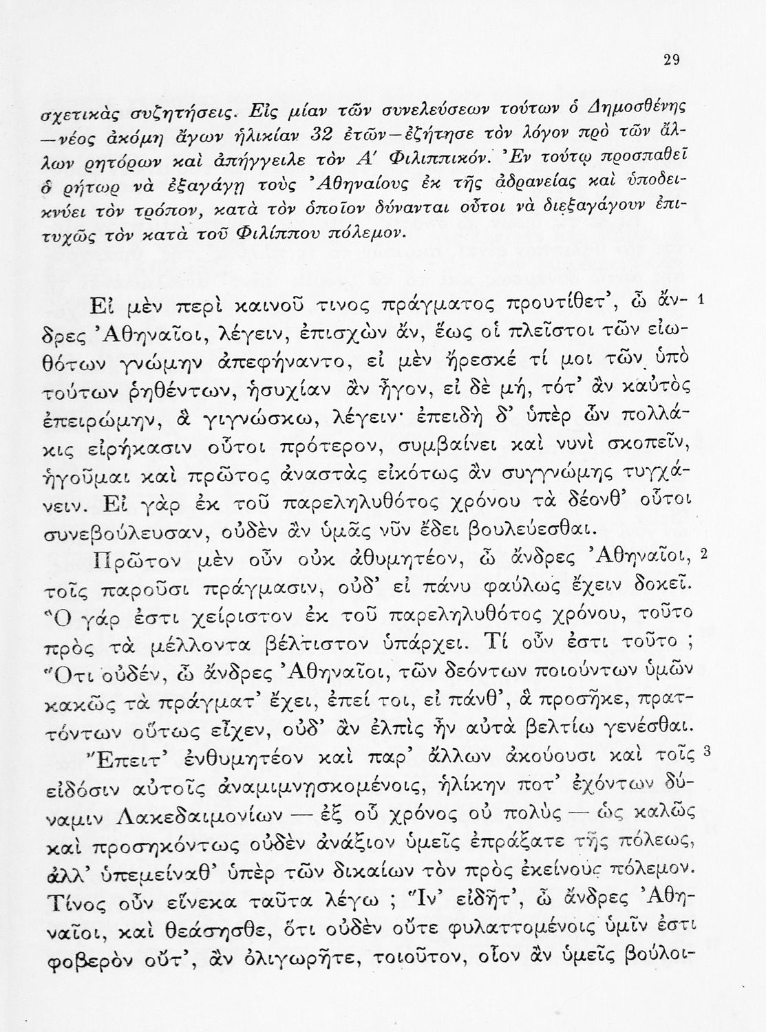 Σχολικό εγχειρίδιο Αρχαίων Ελληνικών Δ΄ Γυμνασίου που περιλαμβάνει εισαγωγή στη ζωή και στο έργο του Δημοσθένη, τον Α΄ κατά Φιλίππου, και τους Α΄ και Β΄ Ολυνθιακούς και ερμηνευτικά και ετυμολογικά σχόλια.