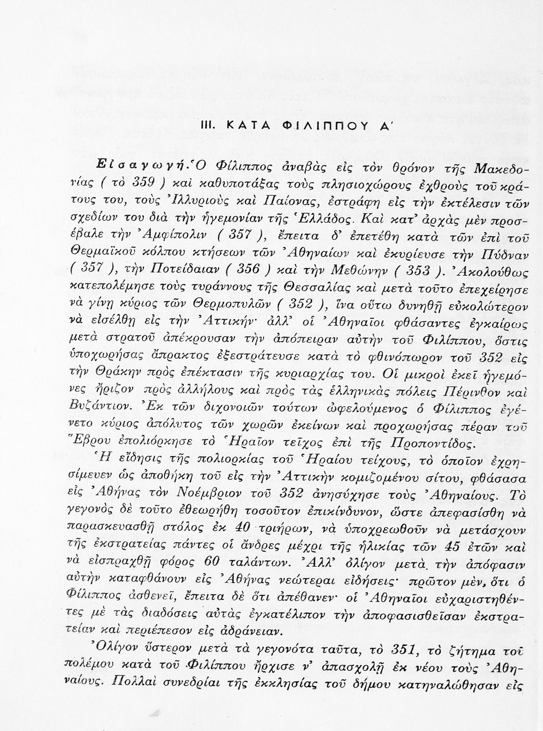 Σχολικό εγχειρίδιο Αρχαίων Ελληνικών Δ΄ Γυμνασίου που περιλαμβάνει τους Ολυνθιακούς Α΄ και Β΄ και τους Φιλιππικούς Α΄ και Β' του Δημοσθένη, εισαγωγή και ερμηνευτικά σχόλια. Φέρει το σύμβολο της δικτατορίας.