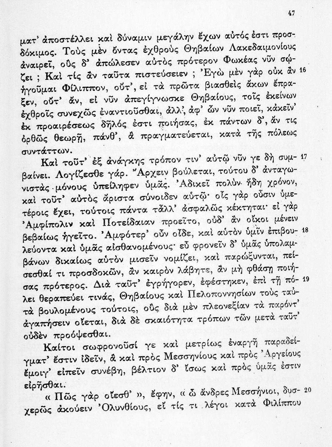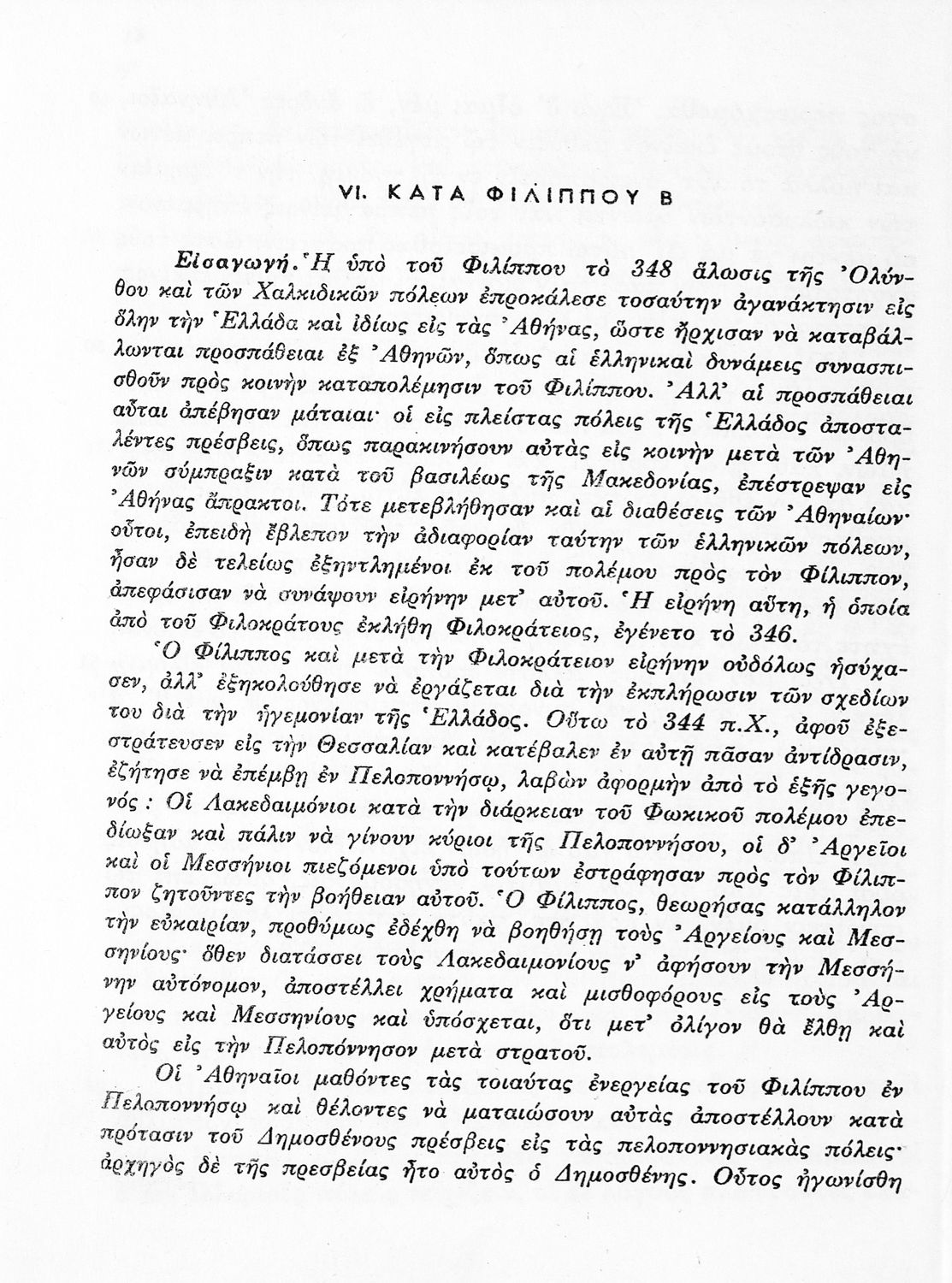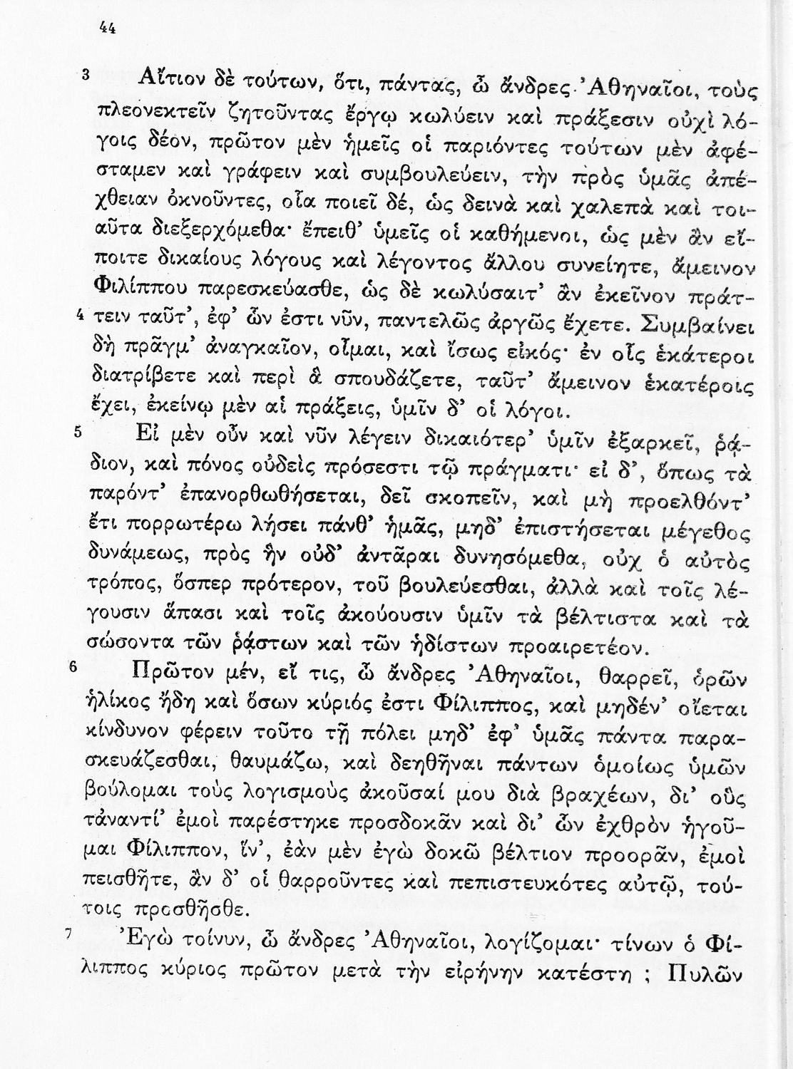 Σχολικό εγχειρίδιο Αρχαίων Ελληνικών Δ΄ Γυμνασίου που περιλαμβάνει τους Ολυνθιακούς Α΄ και Β΄ και τους Φιλιππικούς Α΄ και Β' του Δημοσθένη, εισαγωγή και ερμηνευτικά σχόλια. Φέρει το σύμβολο της δικτατορίας.