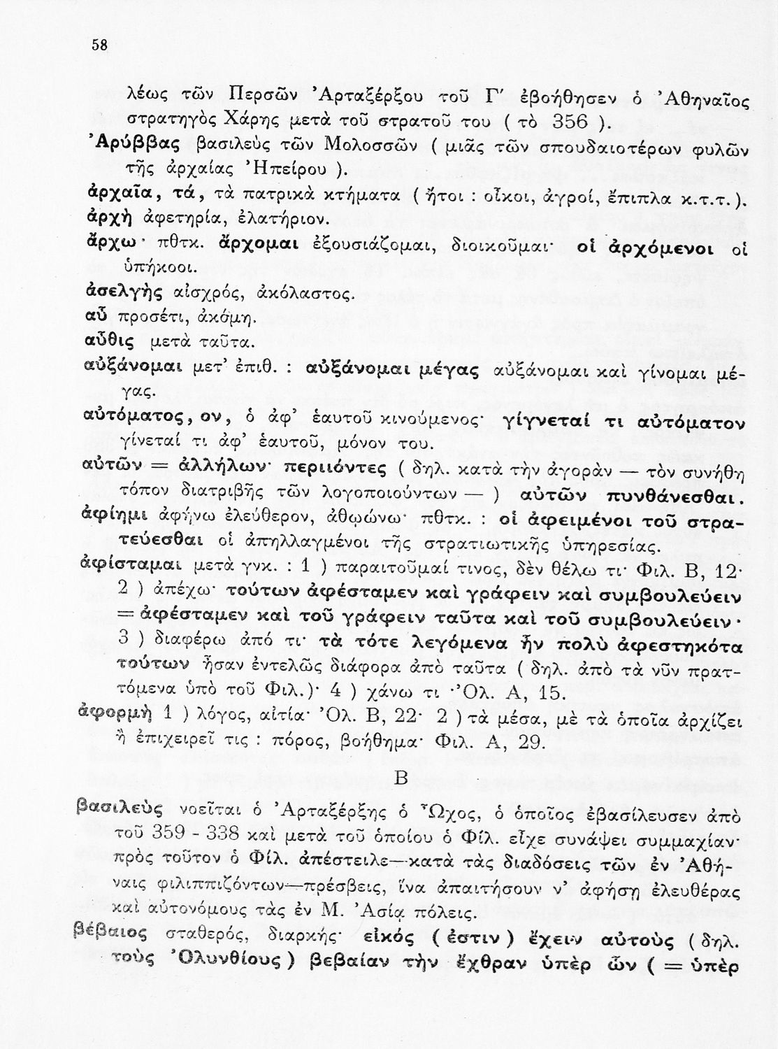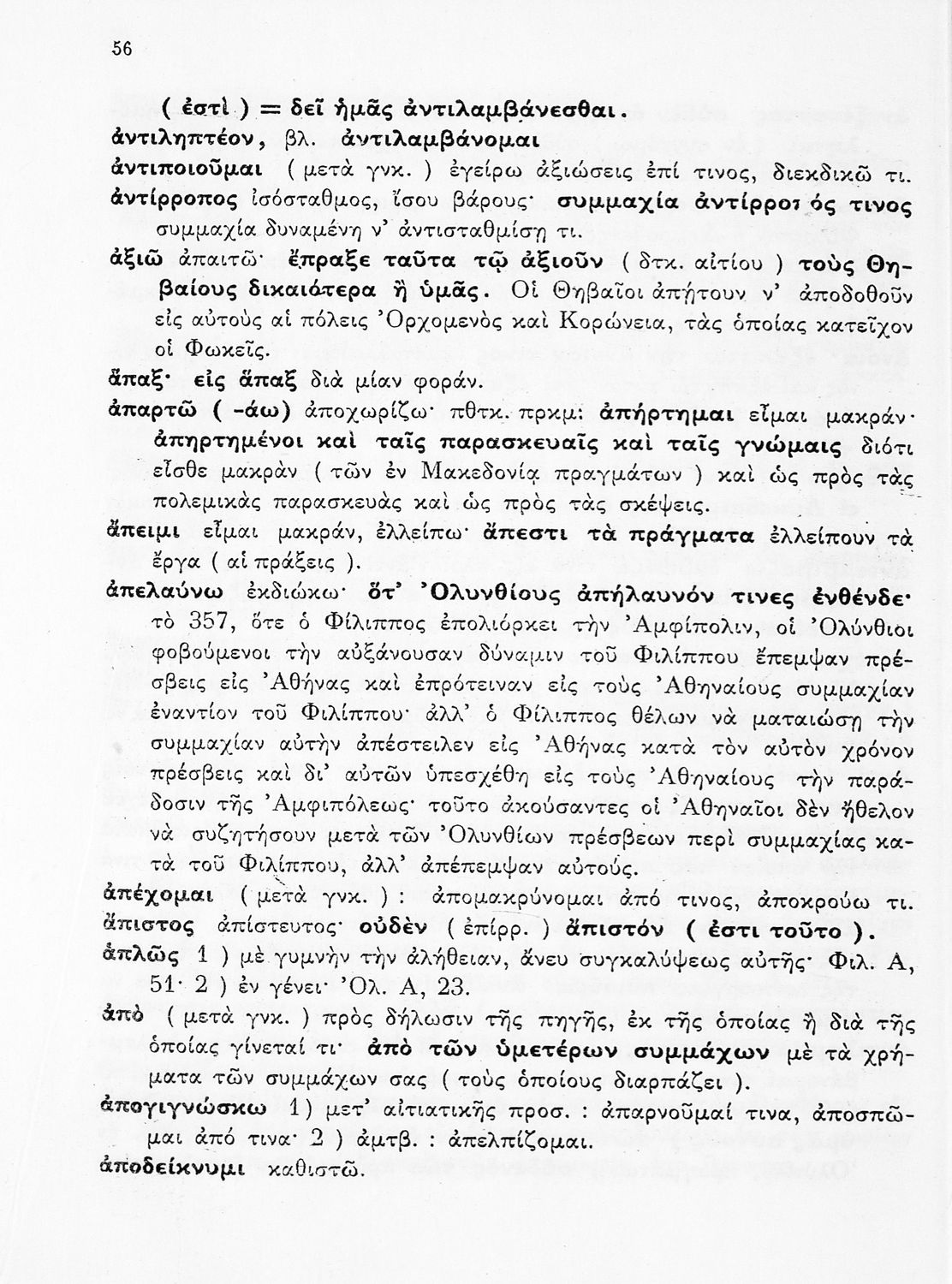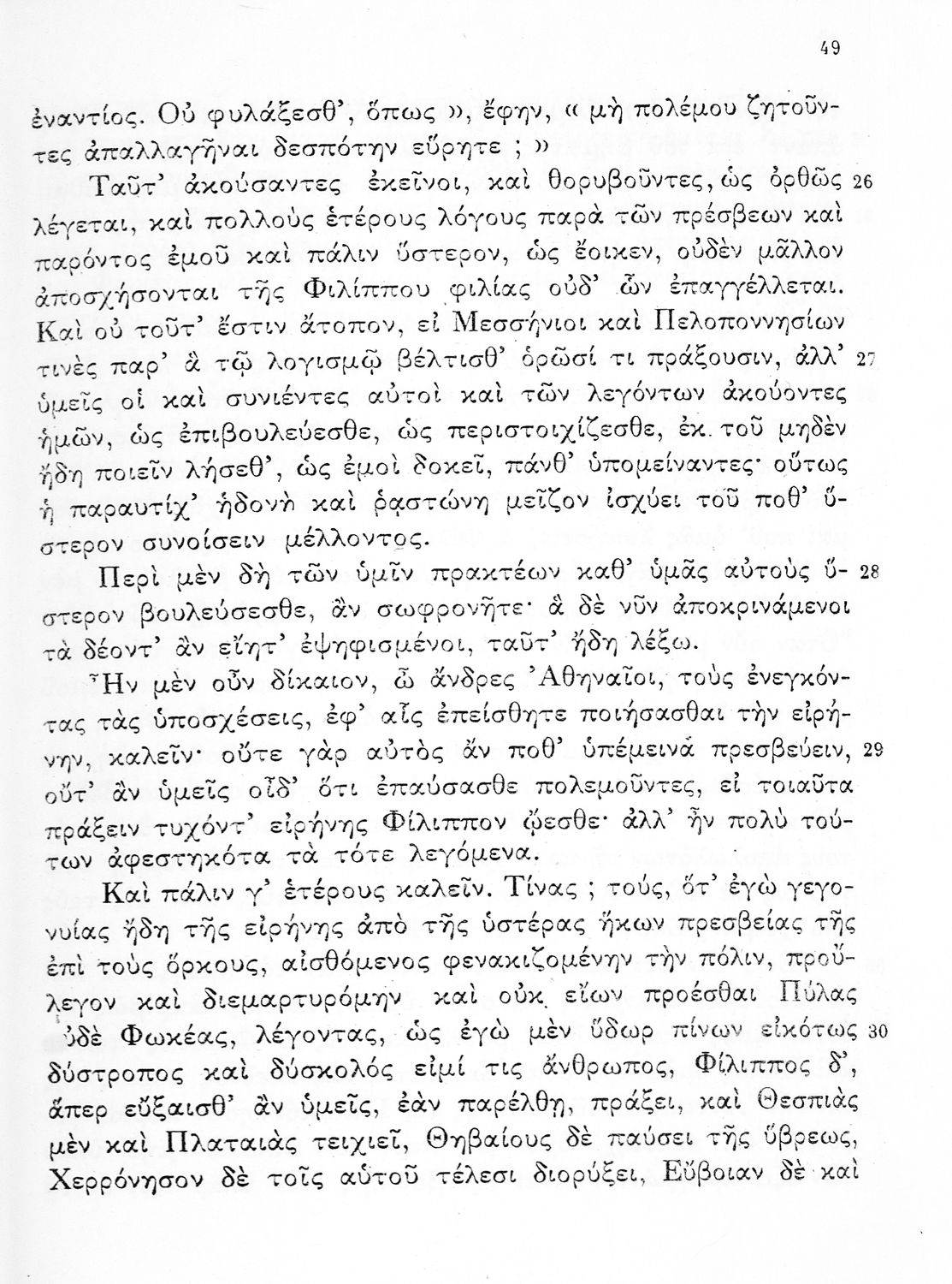 Σχολικό εγχειρίδιο Αρχαίων Ελληνικών Δ΄ Γυμνασίου που περιλαμβάνει εισαγωγή στη ζωή και στο έργο του Δημοσθένη, τον Α΄ κατά Φιλίππου, και τους Α΄ και Β΄ Ολυνθιακούς και ερμηνευτικά και ετυμολογικά σχόλια.