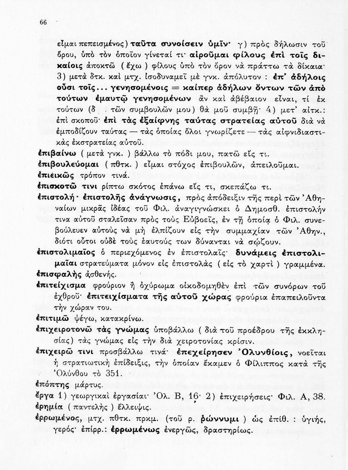 Σχολικό εγχειρίδιο Αρχαίων Ελληνικών Δ΄ Γυμνασίου που περιλαμβάνει τους Ολυνθιακούς Α΄ και Β΄ και τους Φιλιππικούς Α΄ και Β' του Δημοσθένη, εισαγωγή και ερμηνευτικά σχόλια. Φέρει το σύμβολο της δικτατορίας.