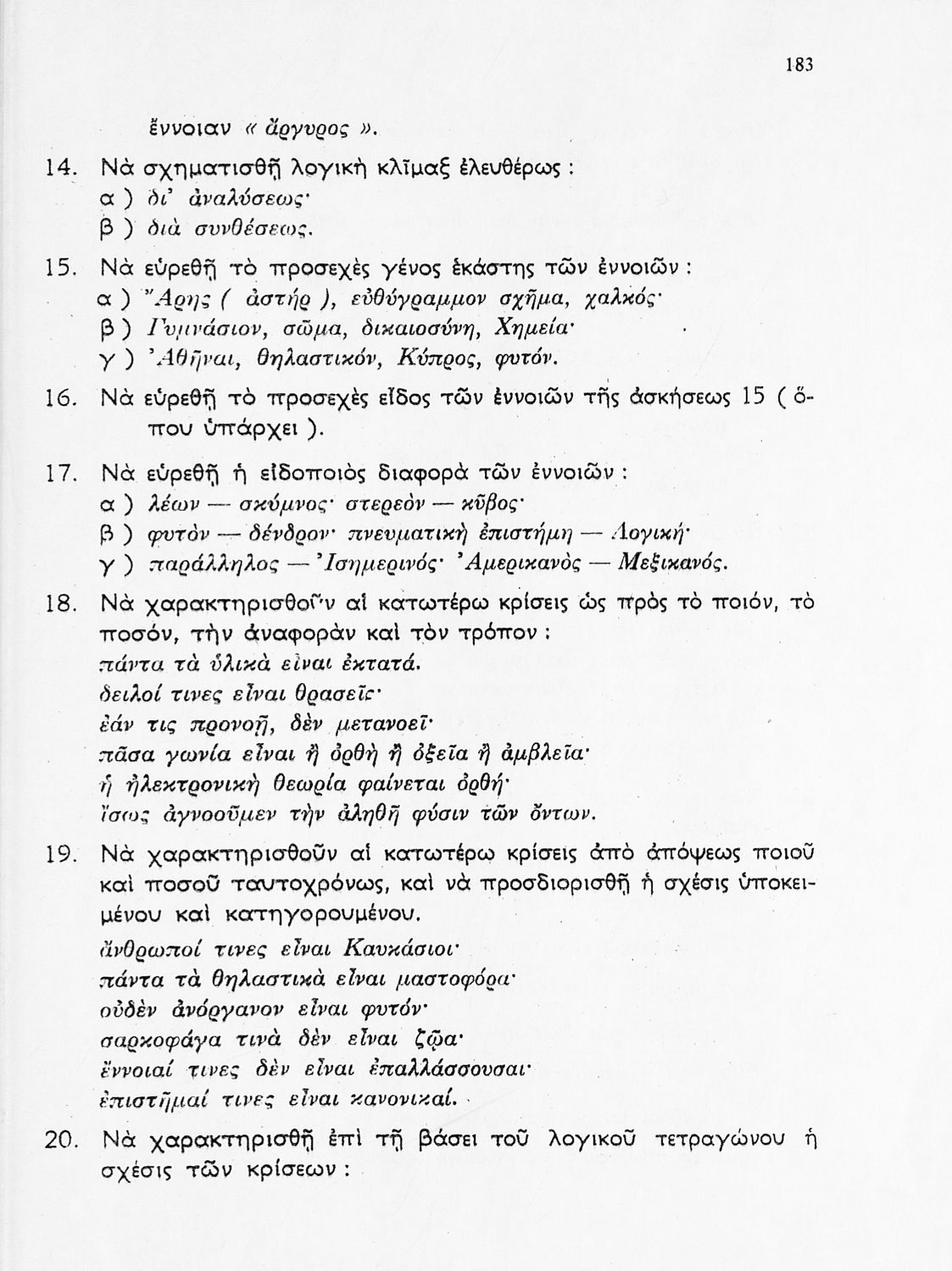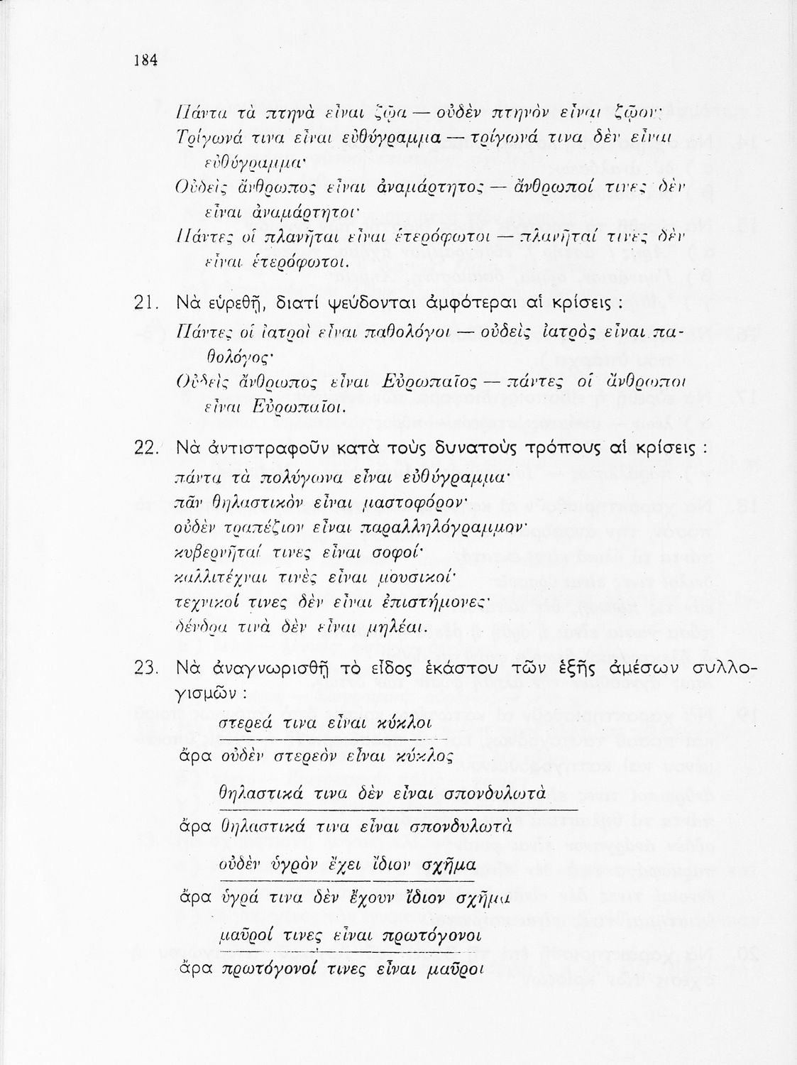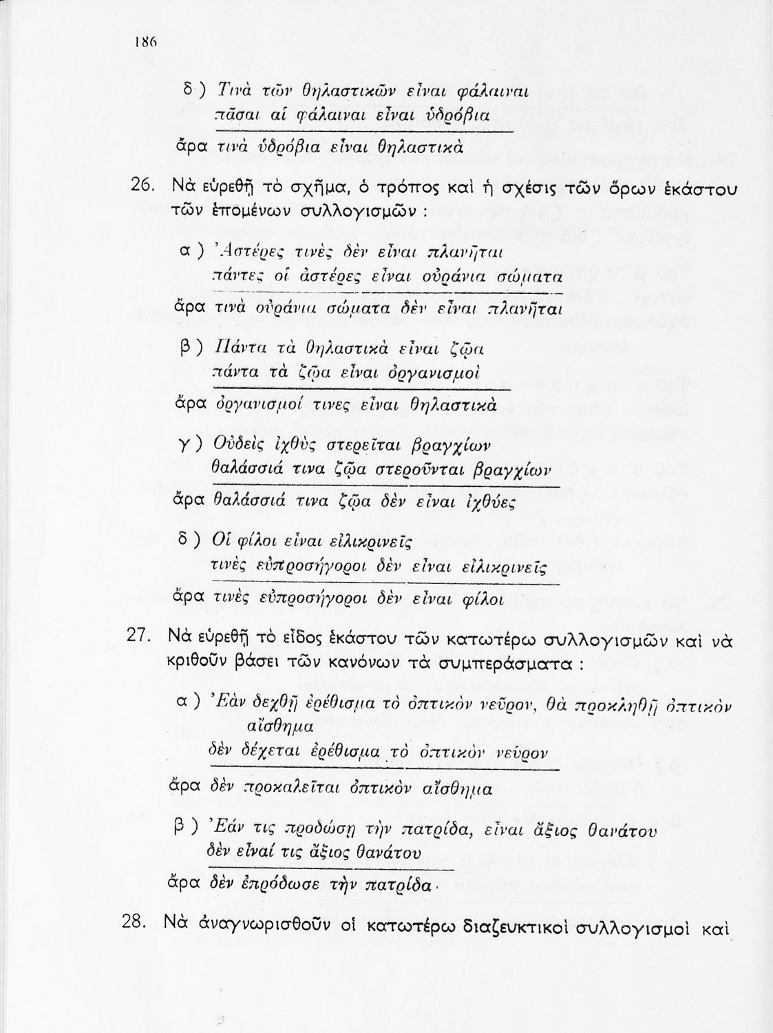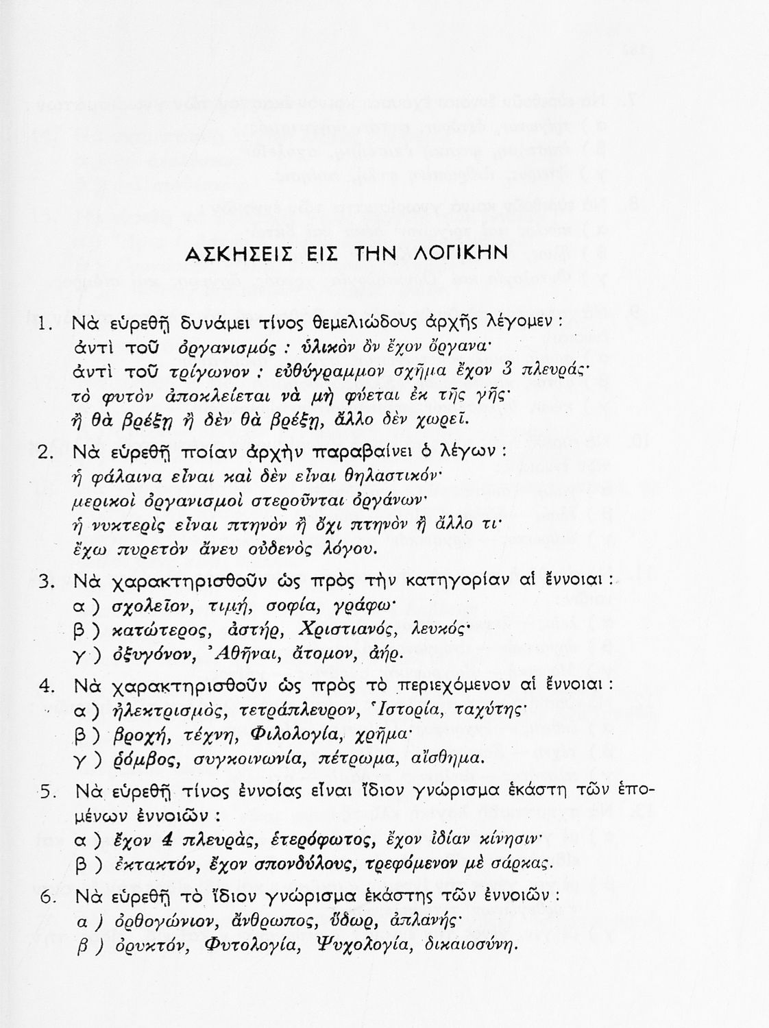 Σχολικό εγχειρίδιο Λογικής για τη ΣΤ΄ Γυμνασίου που είναι χωρισμένο σε στοιχειολογία ή τυπική λογική, μεθοδολογία και γνωσιολογία. Περιέχει ασκήσεις λογικής.