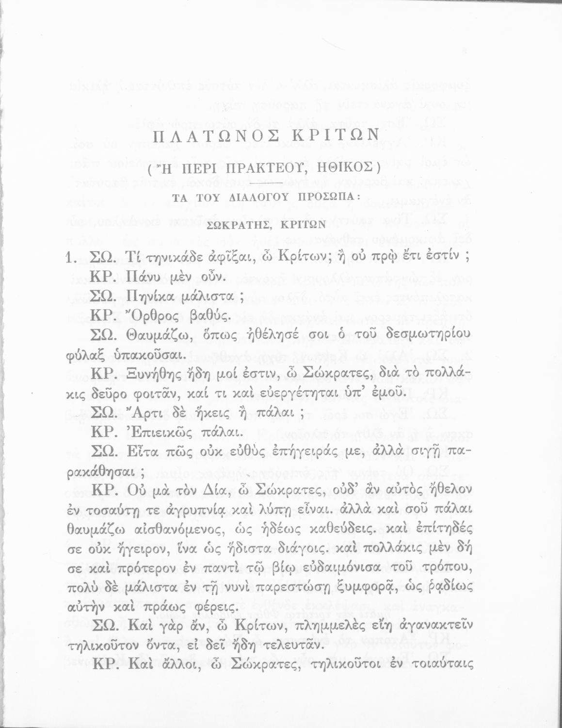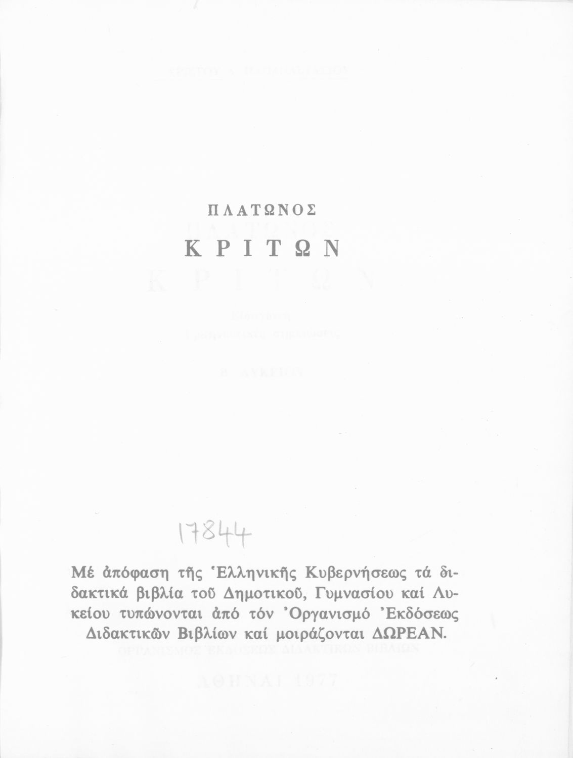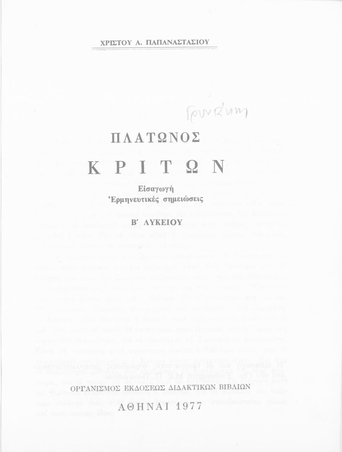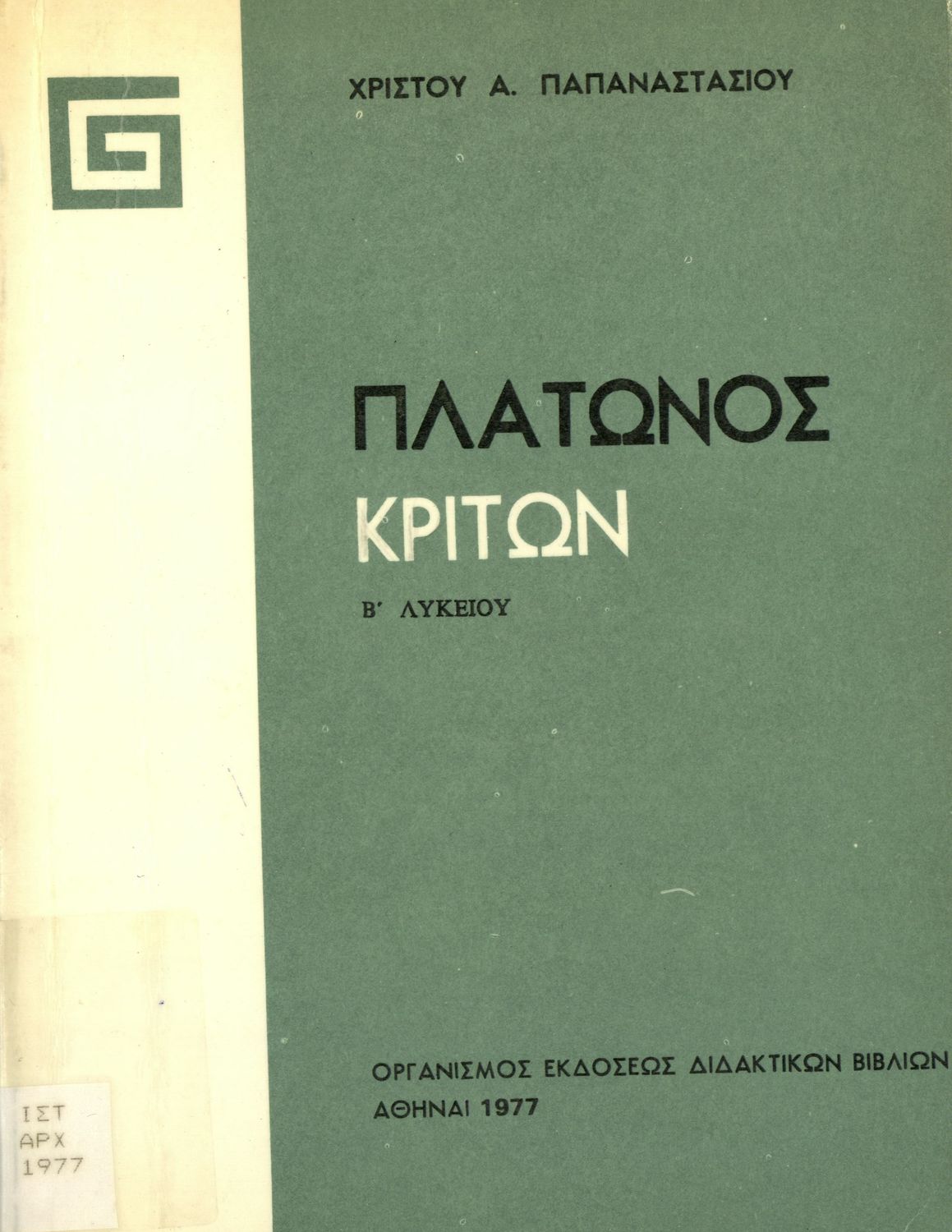 Σχολικό εγχειρίδιο Αρχαίων Ελληνικών. Στο βιβλίο περιλαμβάνεται εισαγωγικό σημείωμα σχετικά με το έργο του Πλάτωνα "Κρίτων" τοποθετώντας τον αναγνώστη στο χώρο και στο χρόνο. Στη συνέχεια παρατίθεται το έργο και συγκεκριμένα ο διάλογος μεταξύ Σωκράτη και Κρίτωνα ενώ ακολουθούν ερμηνευτικές σημειώσεις.