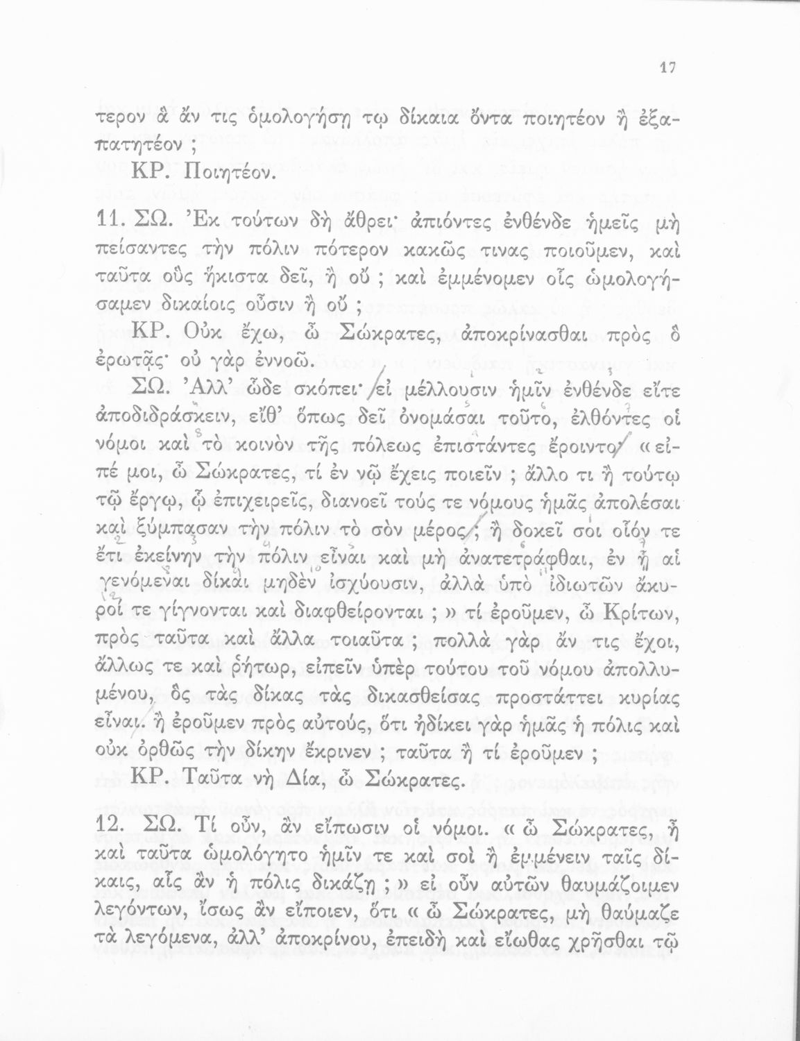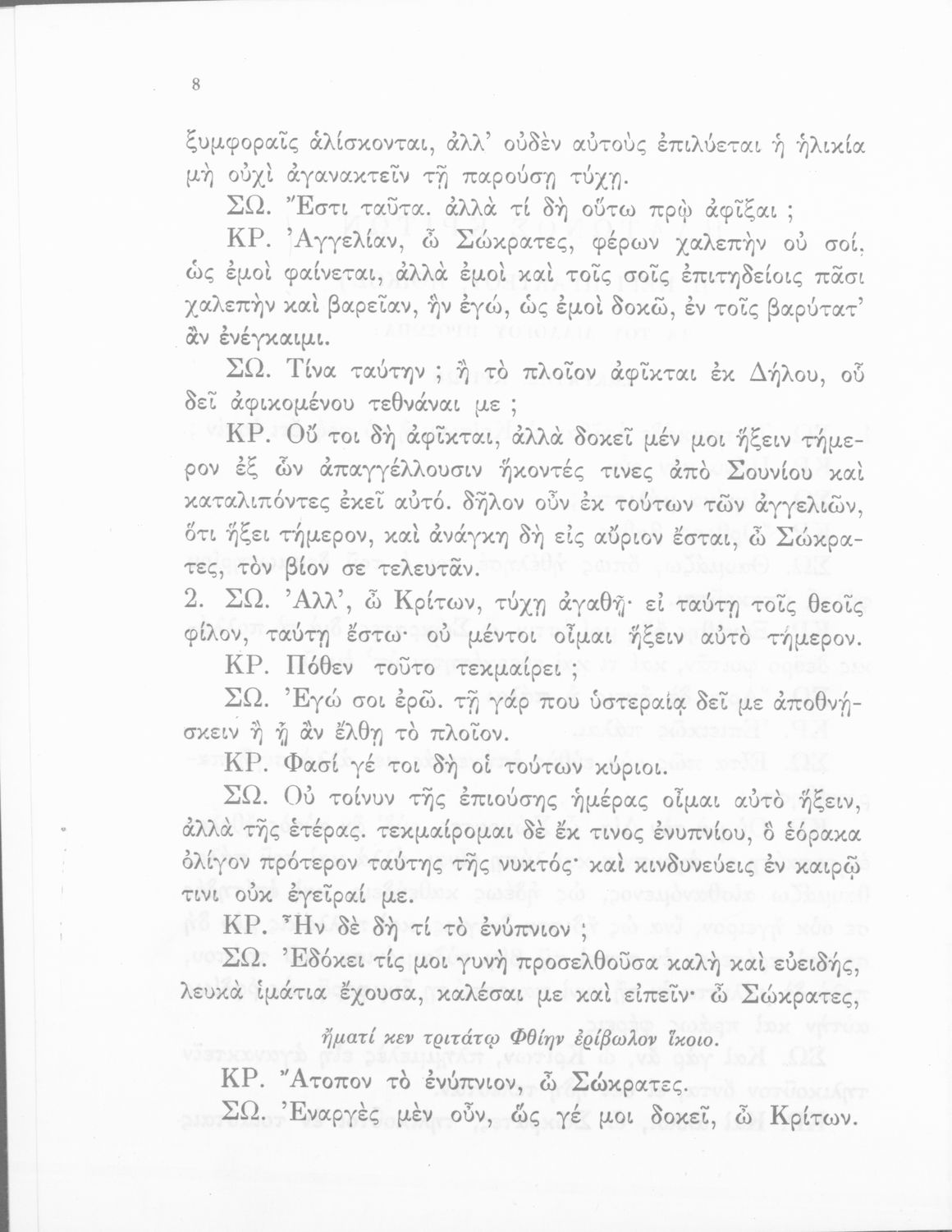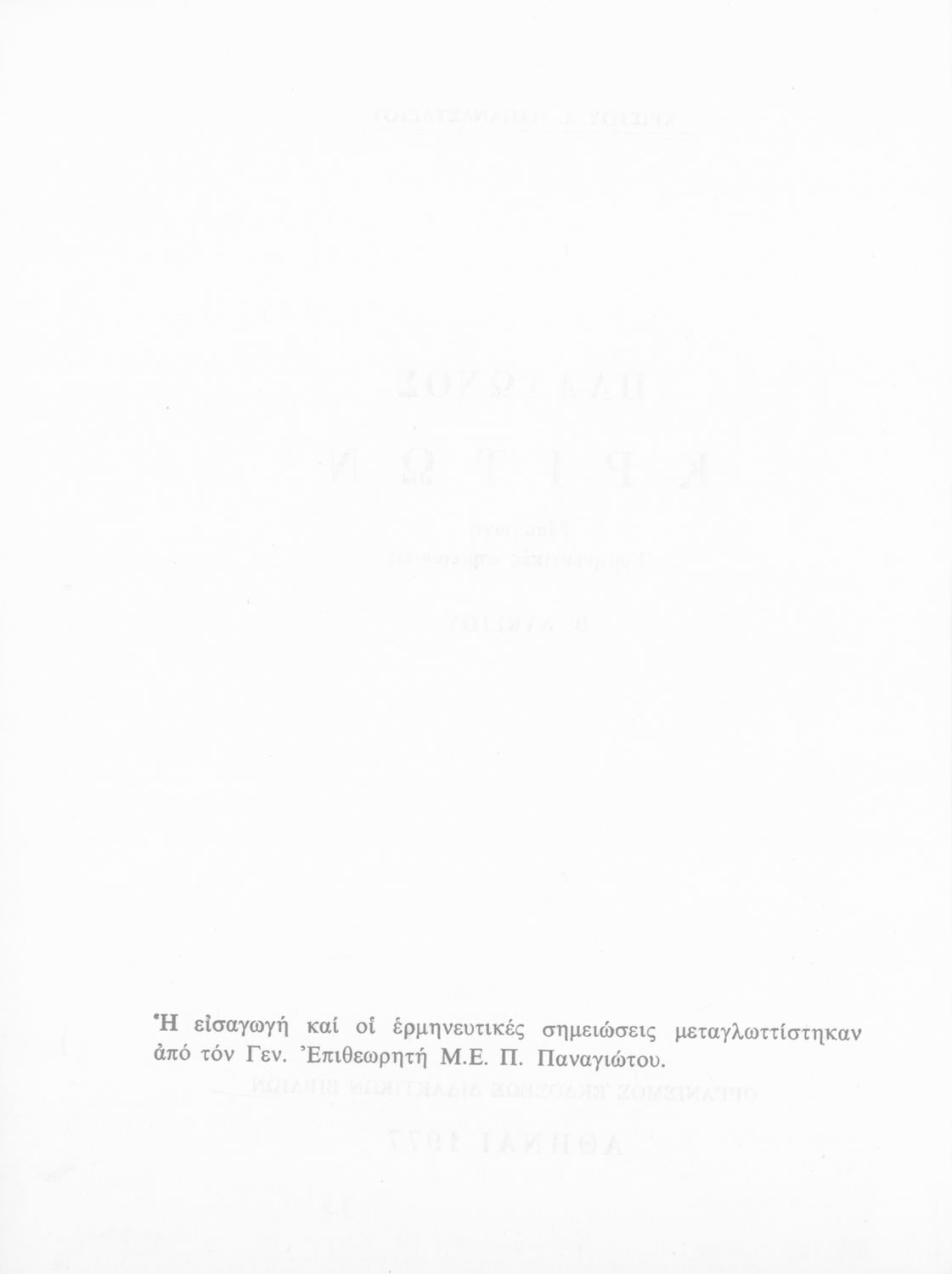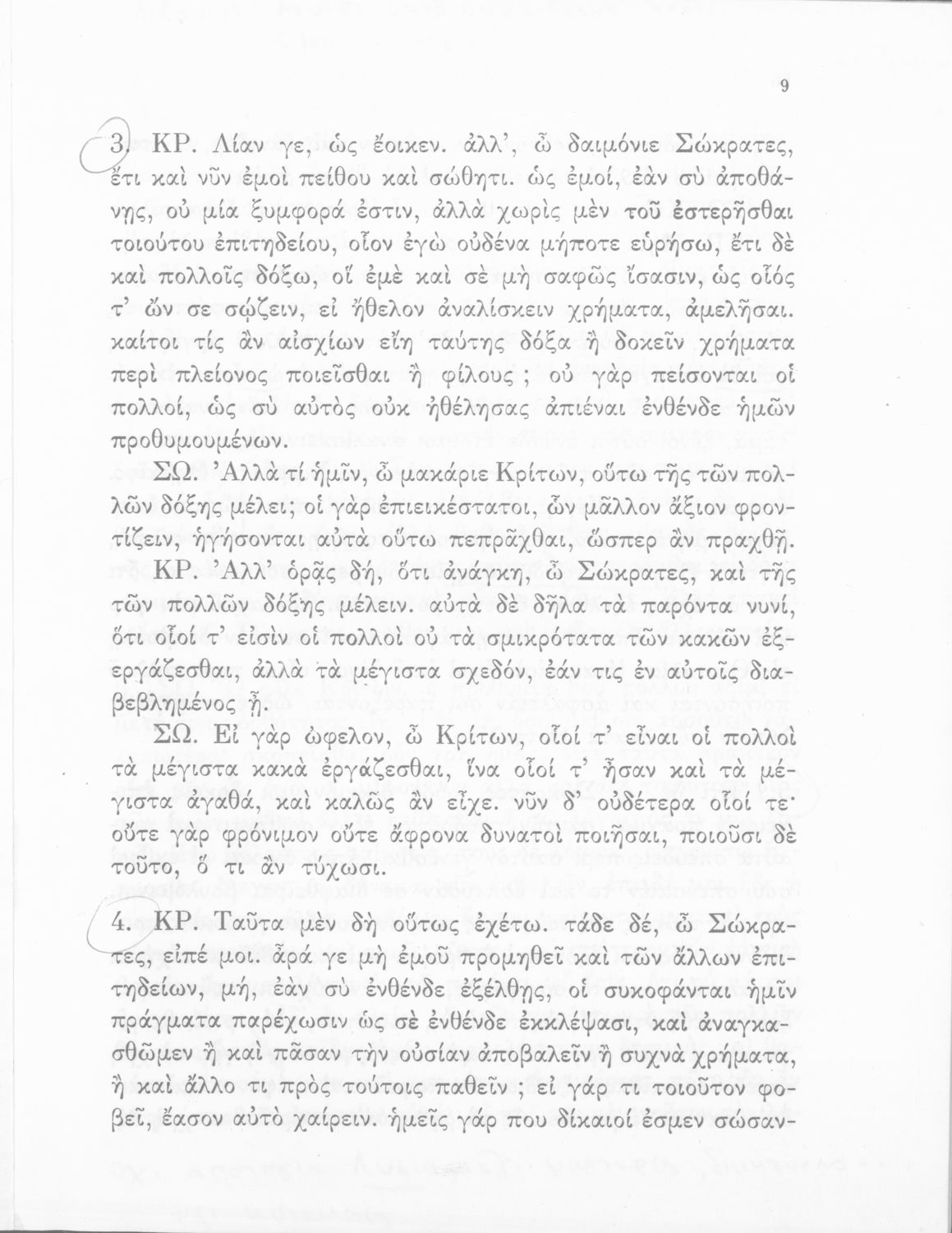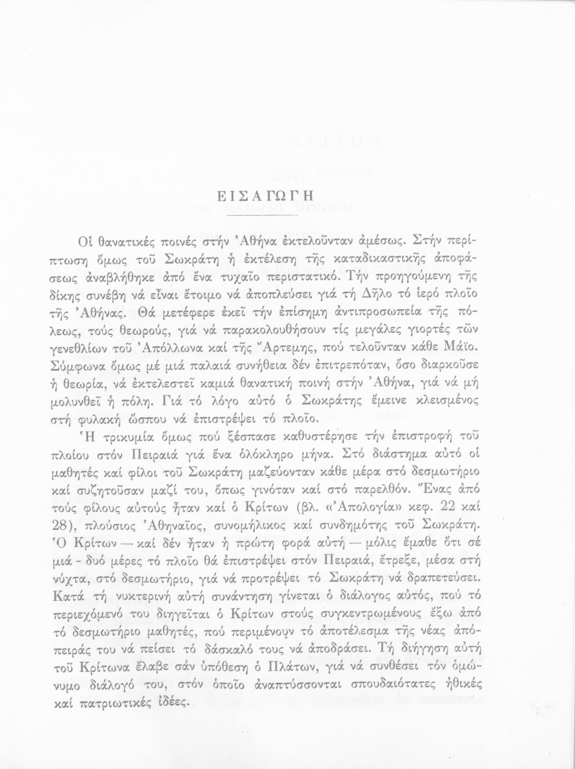 Σχολικό εγχειρίδιο Αρχαίων Ελληνικών. Στο βιβλίο περιλαμβάνεται εισαγωγικό σημείωμα σχετικά με το έργο του Πλάτωνα "Κρίτων" τοποθετώντας τον αναγνώστη στο χώρο και στο χρόνο. Στη συνέχεια παρατίθεται το έργο και συγκεκριμένα ο διάλογος μεταξύ Σωκράτη και Κρίτωνα ενώ ακολουθούν ερμηνευτικές σημειώσεις.