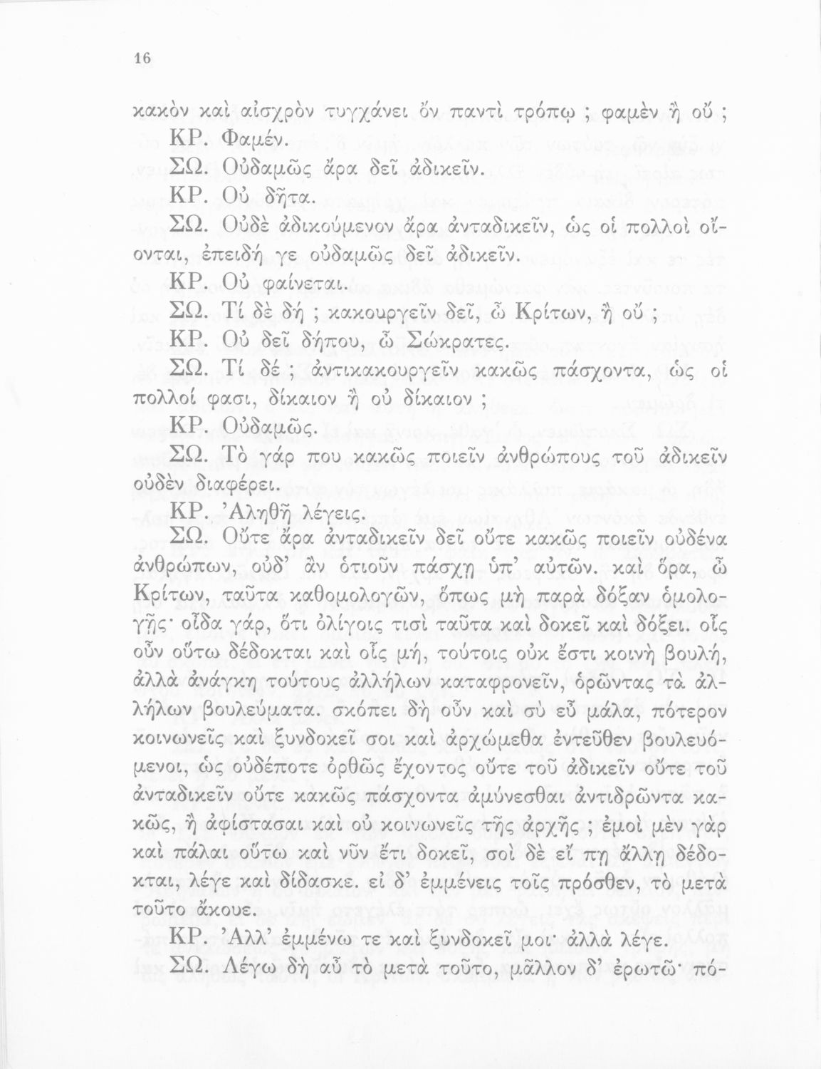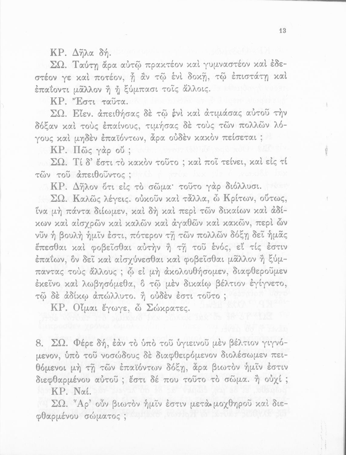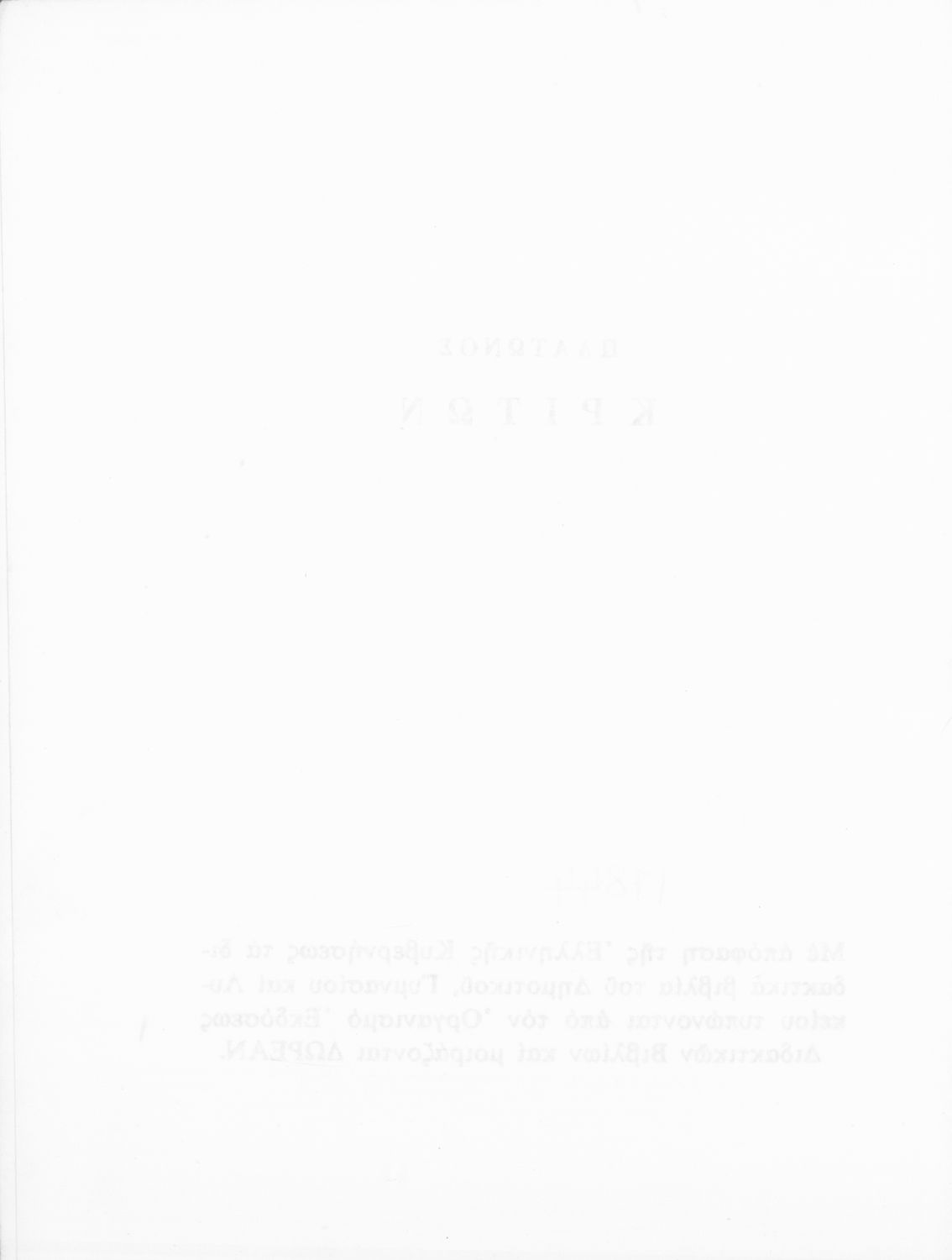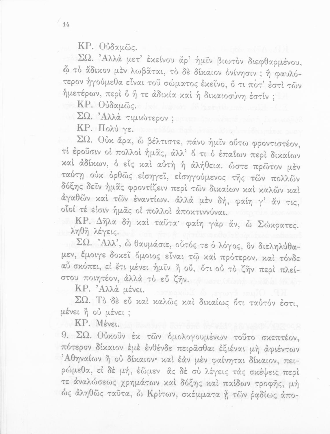 Σχολικό εγχειρίδιο Αρχαίων Ελληνικών. Στο βιβλίο περιλαμβάνεται εισαγωγικό σημείωμα σχετικά με το έργο του Πλάτωνα "Κρίτων" τοποθετώντας τον αναγνώστη στο χώρο και στο χρόνο. Στη συνέχεια παρατίθεται το έργο και συγκεκριμένα ο διάλογος μεταξύ Σωκράτη και Κρίτωνα ενώ ακολουθούν ερμηνευτικές σημειώσεις.