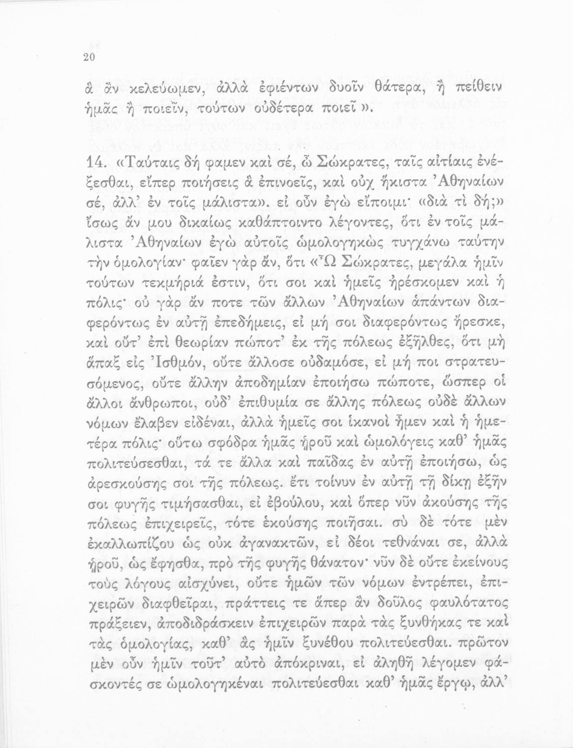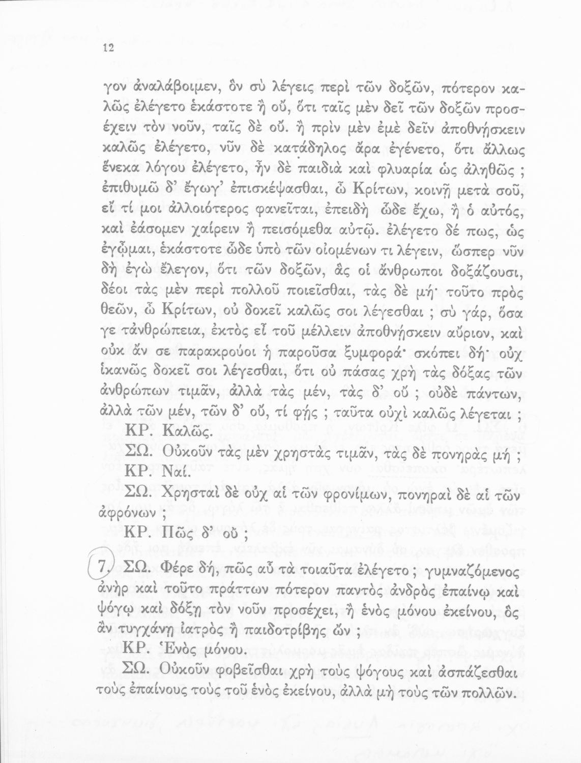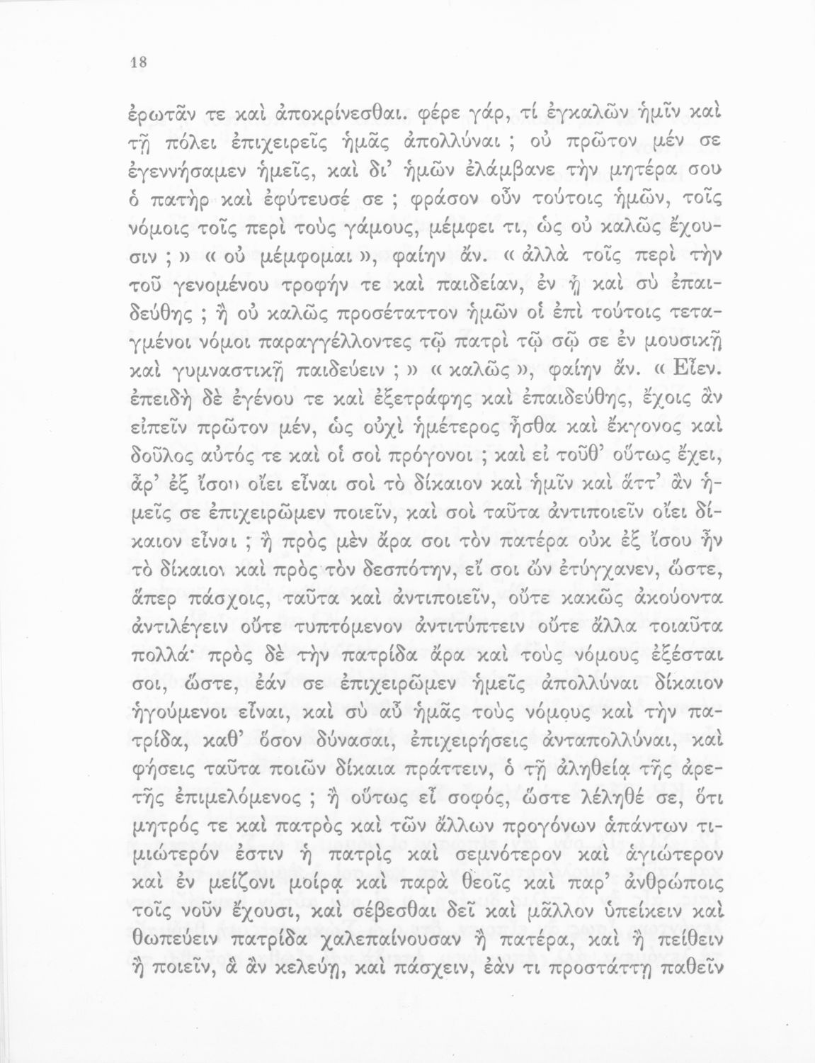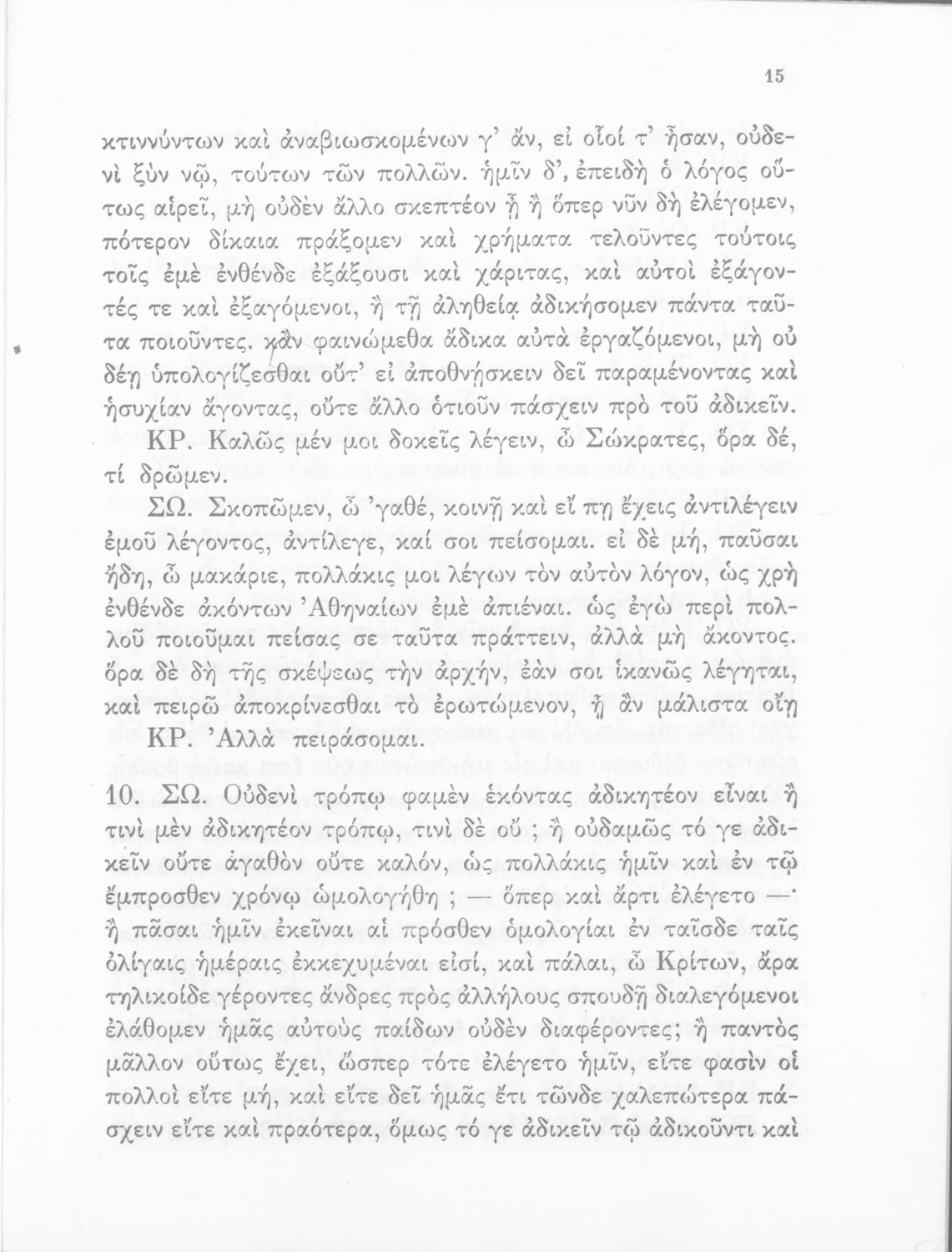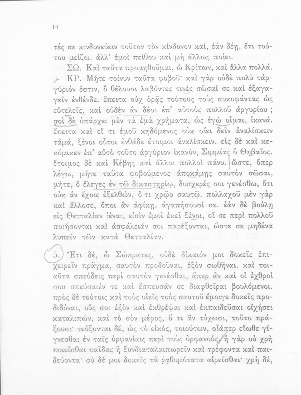 Σχολικό εγχειρίδιο Αρχαίων Ελληνικών. Στο βιβλίο περιλαμβάνεται εισαγωγικό σημείωμα σχετικά με το έργο του Πλάτωνα "Κρίτων" τοποθετώντας τον αναγνώστη στο χώρο και στο χρόνο. Στη συνέχεια παρατίθεται το έργο και συγκεκριμένα ο διάλογος μεταξύ Σωκράτη και Κρίτωνα ενώ ακολουθούν ερμηνευτικές σημειώσεις.