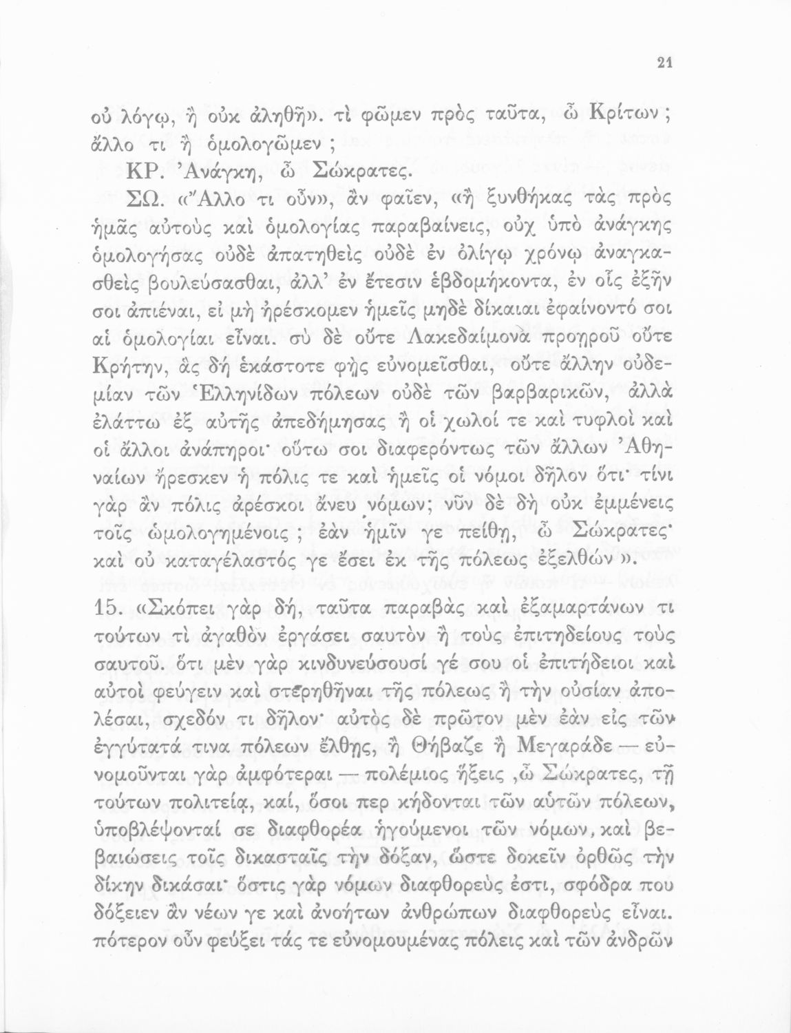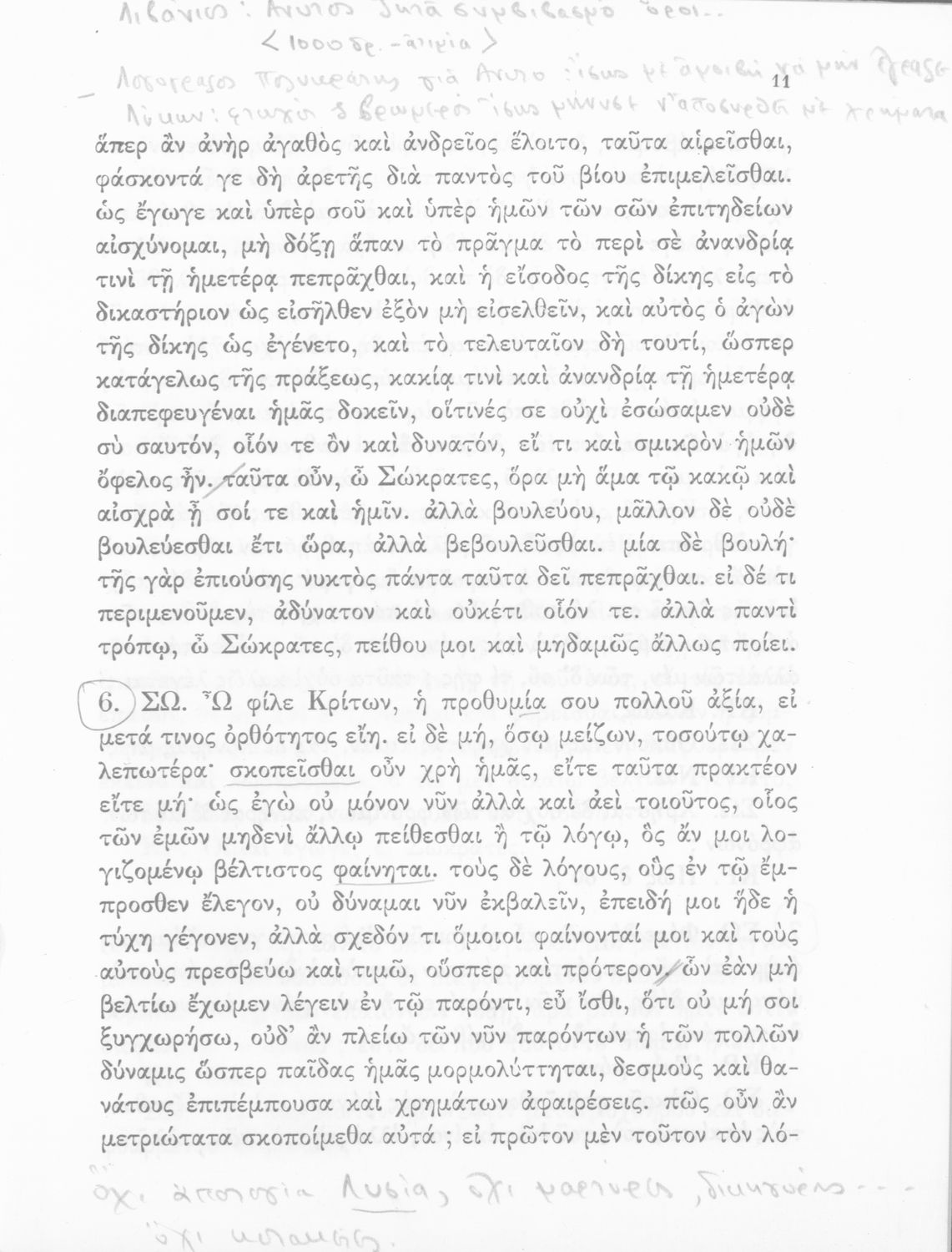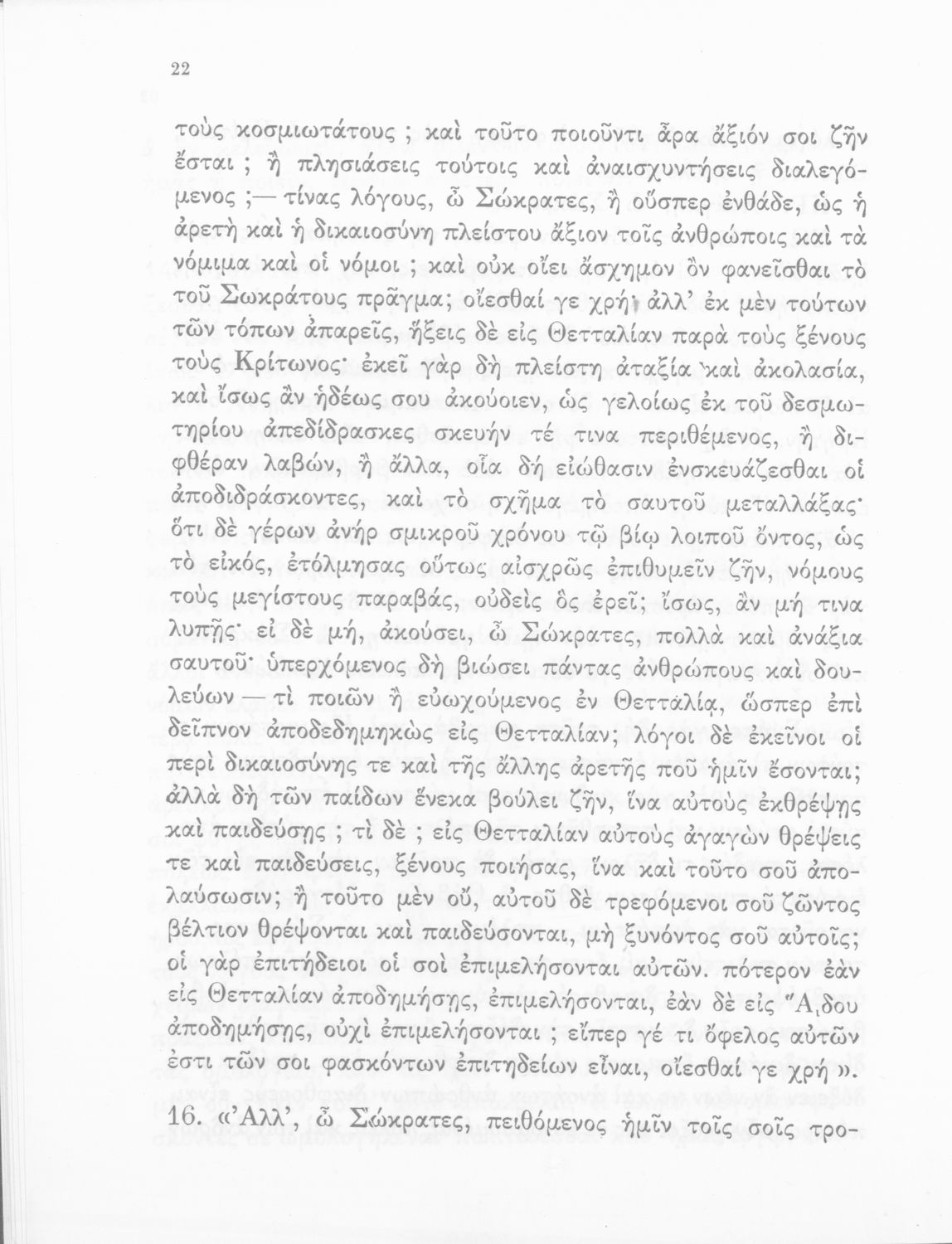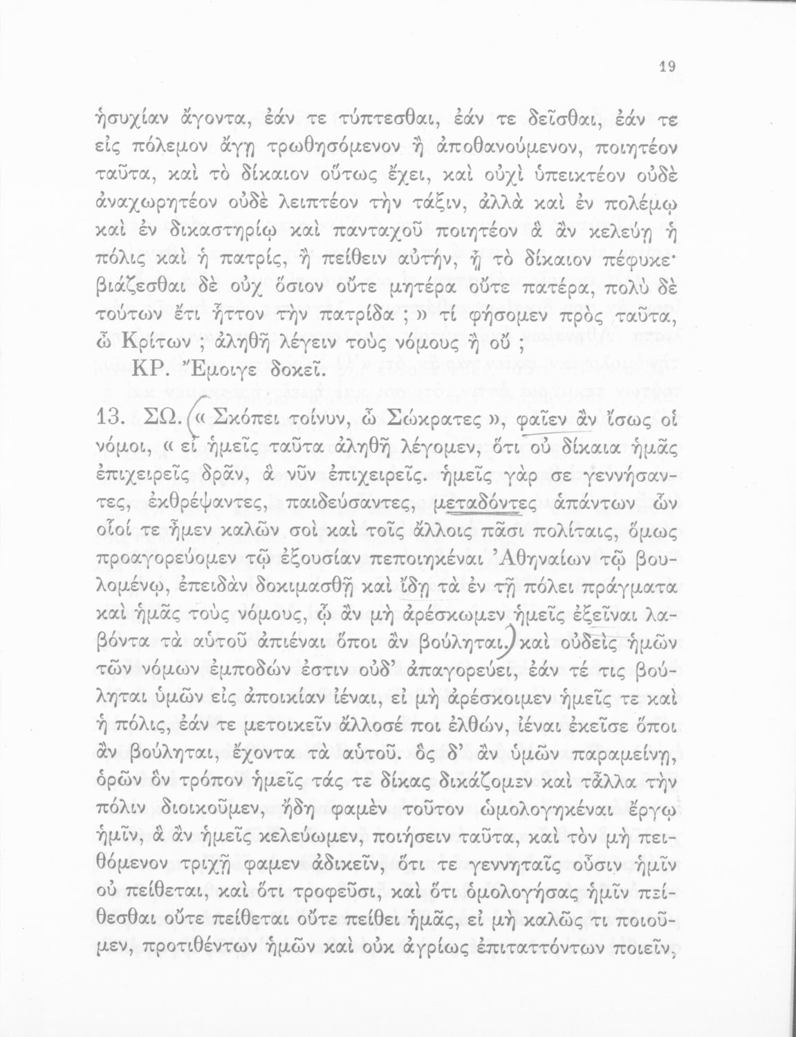 Σχολικό εγχειρίδιο Αρχαίων Ελληνικών. Στο βιβλίο περιλαμβάνεται εισαγωγικό σημείωμα σχετικά με το έργο του Πλάτωνα "Κρίτων" τοποθετώντας τον αναγνώστη στο χώρο και στο χρόνο. Στη συνέχεια παρατίθεται το έργο και συγκεκριμένα ο διάλογος μεταξύ Σωκράτη και Κρίτωνα ενώ ακολουθούν ερμηνευτικές σημειώσεις.